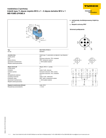 rozdzielacz 2-portowy trójnik typu Y, złącze męskie M12 x 1 - 2 złącza żeńskie M12 x 1 MB-FSM5-2FKM5.4 ■ ■ wytrzymały, konfekcjonowany trójnik typu Y Stopień ochrony IP67 Schemat podłączenia MB-FSM5-2FKM5.4 8024643 Junction box Liczba pinów Grip Klasa ochrony Żywotność mechaniczna Stopień zanieczyszczenia trójnik typu Y, wykonanie ze złączem, typ skręcany 5/4 tworzywo sztuczne, TPU, niebieski IP67, (skręcone razem) > 100 trwałość styków 3 Złącze strona B Liczba pinów Contacts Contact carriers Grip Obciążalność prądowa Coupling nut/screw Protection class Żywotność mechaniczna Stopień zanieczyszczenia Złącze, M12 x 1, prosty 4 metal, CuZn, złocone tworzywo sztuczne, TPU, czarny tworzywo sztuczne, TPU, niebieski 4A metal, CuZn, niklowane IP67, tylko w skręconym stanie > 100 trwałość styków 3 Napięcie znamionowe [Umax] Rezystancja przewodzenia maks. 60 V ð 5 mò Edition • 2013-10-17T17:38:13+02:00 Typ Nr kat. 1/1 Hans Turck GmbH & Co.KG ñ D-45472 Mülheim an der Ruhr ñ Witzlebenstraße 7 ñ Tel. 0208 4952-0 ñ Fax 0208 4952-264 ñ [email protected] ñ www.turck.com