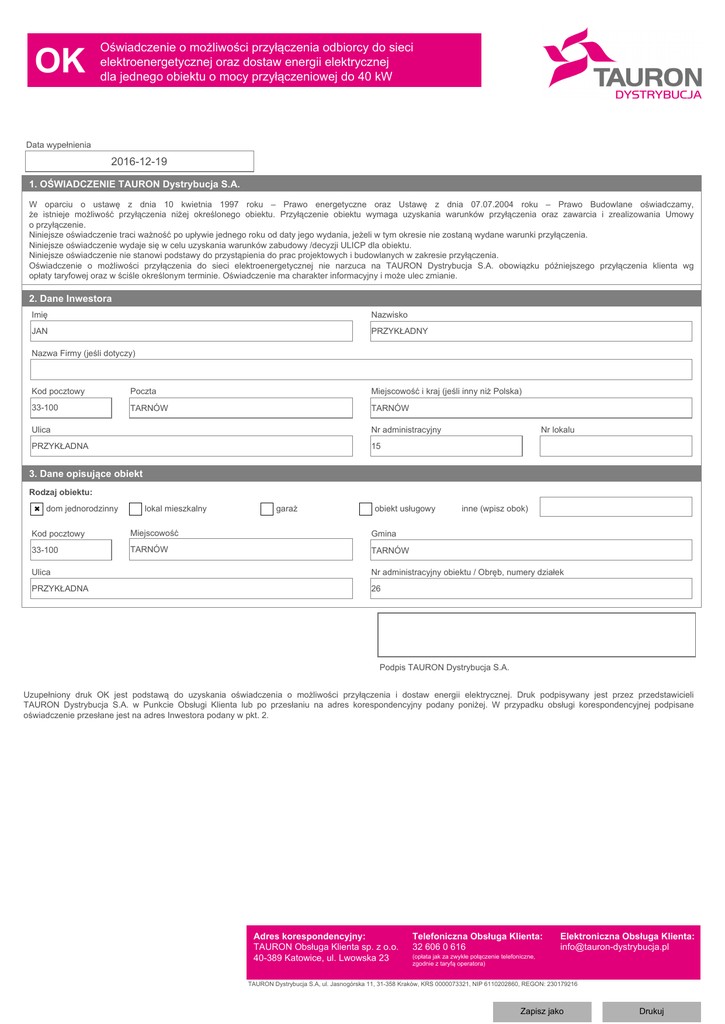 OK Oświadczenie o możliwości przyłączenia odbiorcy do sieci elektroenergetycznej oraz dostaw energii elektrycznej dla jednego obiektu o mocy przyłączeniowej do 40 kW Data wypełnienia 2016-12-19 1. OŚWIADCZENIE TAURON Dystrybucja S.A. W oparciu o ustawę z dnia 10 kwietnia 1997 roku – Prawo energetyczne oraz Ustawę z dnia 07.07.2004 roku – Prawo Budowlane oświadczamy, że istnieje możliwość przyłączenia niżej określonego obiektu. Przyłączenie obiektu wymaga uzyskania warunków przyłączenia oraz zawarcia i zrealizowania Umowy o przyłączenie. Niniejsze oświadczenie traci ważność po upływie jednego roku od daty jego wydania, jeżeli w tym okresie nie zostaną wydane warunki przyłączenia. Niniejsze oświadczenie wydaje się w celu uzyskania warunków zabudowy /decyzji ULICP dla obiektu. Niniejsze oświadczenie nie stanowi podstawy do przystąpienia do prac projektowych i budowlanych w zakresie przyłączenia. Oświadczenie o możliwości przyłączenia do sieci elektroenergetycznej nie narzuca na TAURON Dystrybucja S.A. obowiązku późniejszego przyłączenia klienta wg opłaty taryfowej oraz w ściśle określonym terminie. Oświadczenie ma charakter informacyjny i może ulec zmianie. 2. Dane Inwestora Imię Nazwisko JAN PRZYKŁADNY Nazwa Firmy (jeśli dotyczy) Kod pocztowy Poczta Miejscowość i kraj (jeśli inny niż Polska) 33-100 TARNÓW TARNÓW Ulica Nr administracyjny PRZYKŁADNA 15 Nr lokalu 3. Dane opisujące obiekt Rodzaj obiektu: ✖ dom jednorodzinny lokal mieszkalny garaż obiekt usługowy Kod pocztowy Miejscowość Gmina 33-100 TARNÓW TARNÓW inne (wpisz obok) Ulica Nr administracyjny obiektu / Obręb, numery działek PRZYKŁADNA 26 Podpis TAURON Dystrybucja S.A. Uzupełniony druk OK jest podstawą do uzyskania oświadczenia o możliwości przyłączenia i dostaw energii elektrycznej. Druk podpisywany jest przez przedstawicieli TAURON Dystrybucja S.A. w Punkcie Obsługi Klienta lub po przesłaniu na adres korespondencyjny podany poniżej. W przypadku obsługi korespondencyjnej podpisane oświadczenie przesłane jest na adres Inwestora podany w pkt. 2. Adres korespondencyjny: TAURON Obsługa Klienta sp. z o.o. 40-389 Katowice, ul. Lwowska 23 Telefoniczna Obsługa Klienta: 32 606 0 616 (opłata jak za zwykłe połączenie telefoniczne, zgodnie z taryfą operatora) Elektroniczna Obsługa Klienta: [email protected] TAURON Dystrybucja S.A, ul. Jasnogórska 11, 31-358 Kraków, KRS 0000073321, NIP 6110202860, REGON: 230179216 Zapisz jako Drukuj