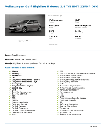 Volkswagen Golf Highline 5 doors 1.4 TSI BMT 125HP DSG INFORMACJE zdjęcie przykładowe Volkswagen Golf Marka Model Benzyna Automatyczna Silnik Skrzynia biegów 2WD 1.4 L Napęd pojemność 125 KM 0 km Moc Przebieg --Dostępność Kolor: Gray Limestone Wnętrze: ergoActive (sports seats) Wersja: Highline, Business package, Technical package Wyposażenie samochodu Alarm Alufelgi 17'' Bluetooth CD Czujniki Parkowania - przód Czujniki Parkowania - tył Nawigacja Przyciemniane szyby Smart Key USB Światła Ksenonowe Światła LED tył ABS ASR AUX-in Asystent podjazdu Centralny Zamek Czujnik Deszczu Czujnik Zmierzchu Czujnik ciśnienia w oponach Doświetlanie zakrętów EDS ESP Elektrochromatyczne lusterko wsteczne Elektryczne szyby - przód Elektryczne szyby - tył Elektrycznie regulowane lusterka Elektryczny hamulec Isofix Kierownica trójramienna Klimatyzacja Automatyczna Komputer pokładowy Koło zapasowe MP3 MSR Podgrzewane lusterka boczne Podłokietnik przód SD Skórzana kierownica System Start&Stop Tempomat Wielofunkcyjna kierownica gniazdo 12V Światła przeciwmgielne id: 4444 Powered by TCPDF (www.tcpdf.org)