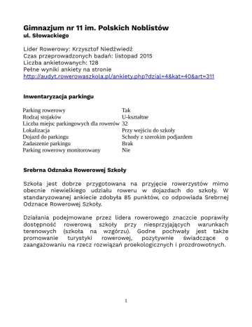 Gimnazjum nr 11 im. Polskich Noblistów ul. Słowackiego Lider Rowerowy: Krzysztof Niedźwiedź Czas przeprowadzonych badań: listopad 2015 Liczba ankietowanych: 128 Pełne wyniki ankiety na stronie http://audyt.rowerowaszkola.pl/ankiety.php?dzial=4&kat=40&art=311 Inwentaryzacja parkingu Parking rowerowy Rodzaj stojaków Liczba miejsc parkingowych dla rowerów Lokalizacja Dojazd do parkingu Zadaszenie parkingu Parking rowerowy monitorowany Tak U-kształtne 32 Przy wejściu do szkoły Schody z szerokim podjazdem Brak Nie Srebrna Odznaka Rowerowej Szkoły Szkoła jest dobrze przygotowana na przyjęcie rowerzystów mimo obecnie niewielkiego udziału roweru w dojazdach do szkoły. W standaryzowanej ankiecie zdobyła 85 punktów, co odpowiada Srebrnej Odznace Rowerowej Szkoły. Działania podejmowane przez lidera rowerowego znaczcie poprawiły dostępność rowerową szkoły przy niesprzyjających warunkach terenowych (szkoła na wzgórzu). Godne pochwały jest także promowanie turystyki rowerowej, pozytywnie świadczące o zaangażowaniu na rzecz rozwiązań proekologicznych i prozdrowotnych. 1 Modal Split Wyniki ankiety – udział środków transportu w dojazdach do/ze szkoły Bariery i potencjał 34% ankietowanych mieszka w odległości 1 do 5 km od szkoły, dalsza część nieco ponad 5 km. 80% ankietowanych byłoby skłonne lub przynajmniej nie wyklucza dojazdu rowerem do szkoły. Przyjmujemy, że po odpowiednim przygotowaniu są oni gotowi dojeżdżać nawet przy mniej sprzyjających warunkach pogodowych. Działania na rzecz transportu rowerowego mają szansę znacznie zwiększyć popularność jednośladu jako środka komunikacji. Najczęściej wymienianą przeszkodą jest brak tras rowerowych (40% ankietowanych), związane są z tym również obawy o bezpieczeństwo dojazdu (33% uczniów). Ankietowani wskazują także na kwestię bezpiecznego parkowania rowerów przed szkołą. Kolejną barierę stanowi odległość do pokonania – wielu pytanych uczniów mieszka w oddalonych dzielnicach Gdyni oraz w gminach ościennych. 2 Skąd dojeżdżają ankietowani? Warto jednak promować dojazdy rowerowe wśród uczniów z Redłowa, Kamiennej Góry, Małego Kacka i Witomina. Potwierdzamy opinię uczniów, że infrastruktura rowerowa jest niedostosowana do potrzeb rowerzystów i zaproponujemy pro-rowerowe ułatwienia, które można wprowadzić na ulicach miasta. Niektórzy z dalej mieszkających uczniów mogliby rozważyć transport intermodalny za pomocą SKMki lub PKMki, dojeżdżając do szkoły korzystaliby ze stacji Gdynia Wzgórze św. Maksymiliana. Działania na rzecz dla ruchu rowerowego Po stronie szkoły Teren szkoły dobrze przygotowano dla rowerzystów, z dojazdem umożliwionym z obu stron. Parking rowerowy jest dogodnie usytuowany i dobrze wyposażony. Udostępnienie w szkole podstawowego zestawu naprawczego pozwoliłoby na dokonywanie drobnych napraw w przypadku usterek powstałych podczas dojazdu. Obawy o bezpieczeństwo roweru mogą się obniżyć dzięki akcjom promującym dobre zabezpieczenia parkowanego pojazdu. Warto rozważyć, czy nie można objąć parkingu rowerowego monitoringiem. 3 W rozmowach odbytych z liderem rowerowym wiemy, że wśród uczniów jest niska świadomość możliwości komunikacji rowerowej. Różnorodne akcje afirmacyjne, takie jak szkolenia, konkursy i wycieczki ułatwią uczniom decyzję o zmianie środka transportu. Po stronie miasta Infrastruktura w najbliższej okolicy szkoły wymaga wielu korekt, by uczniowie mogli sprawnie dojeżdżać na zajęcia. Obecnie dojazd do szkoły od strony ulicy Słowackiego jest utrudniony przez brak możliwości zjazdu z ulicy w stronę podjazdu rowerowego. Ułatwieniem byłoby obniżenie krawężnika oraz zakaz parkowania równolegle do barierki ul. Słowackiego - wjazd do szkoły 4 W okolicach szkoły poruszanie utrudnia mnogość ulic jednokierunkowych, które znacznie wydłużają dojazd. Postulujemy wprowadzenie kontraruchu na następujących ulicach: - I Armii Wojska Polskiego (od Świętojańskiej do Słowackiego) Krasickiego (do Domu Marynarza) Bema Kilińskiego. Dla uspokojenia ruchu i zwiększenia bezpieczeństwa ważne jest ustanowienie strefy „Tempo 30” w pobliżu szkoły. Ilustracja 1: ul. Bema - postulowany kontraruch Dla ułatwienia dotarcia od strony Kamiennej Góry proponujemy wprowadzenie pasa do skrętu w lewo z ulicy Siemiradzkiego w ulicę Skargi. Umieszczenie pasa po lewej stronie wysepki oraz tabliczki „Nie dotyczy rowerów” przy nakazie jazdy po prawej stronie znaku zwiększy widoczność skręcających rowerzystów oraz pozwoli uniknąć karkołomnych manewrów (skręt o ponad 90°). 5 Proponowany pas do skrętu w lewo Po zakończeniu robót w okolicach Teatru Muzycznego ułatwienie przejazdu w kierunku Śródmieścia zapewniłaby droga rowerowa pomiędzy ul. Słowackiego a ul. Wybickiego. Duże grupy uczniów mogłyby dojeżdżać z Redłowa, Małego Kacka (przez wiadukt rowerowy od ulicy Łużyckiej). Niestety, niemożliwe jest legalne zjechanie z drogi rowerowej przy ulicy Piłsudskiego na ulicę Legionów. Konieczne jest wytyczenie przejścia przez ulicę Piłsudskiego z łagodnym zjazdem w ulicę Legionów po drugiej stronie skrzyżowania. Dojazdy od strony Witomina utrudnia brak wytyczenia osobnego ciągu rowerowego pod stacją SKM Wzgórze św. Maksymiliana. 6 ul. Legionów - widok w stronę szkoły przez ul. Piłsudskiego Nasze sugestie dotyczące poprawy infrastruktury obejmowały głównie tereny położone najbliżej szkoły. Dalsze trasy – z Witomina, Małego Kacka czy Redłowa – na znacznej długości są przyjazne rowerom (al. Zwycięstwa, ul. Łużycka, ciąg pieszo-rowerowy przy Kieleckiej). Rowerowa Gdynia może doradzić uczniom w sprawie doboru najbardziej korzystnej trasy. Dlatego lobbing szkoły na rzecz poprawy infrastruktury powinien się skupiać na najbliższej okolicy. 7