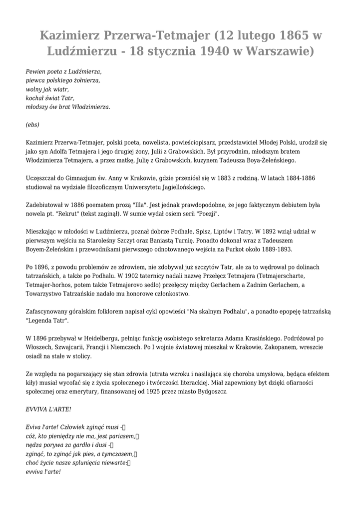 Kazimierz Przerwa-Tetmajer (12 lutego 1865 w Ludźmierzu - 18 stycznia 1940 w Warszawie) Pewien poeta z Ludźmierza, piewca polskiego żołnierza, wolny jak wiatr, kochał świat Tatr, młodszy ów brat Włodzimierza. (ebs) Kazimierz Przerwa-Tetmajer, polski poeta, nowelista, powieściopisarz, przedstawiciel Młodej Polski, urodził się jako syn Adolfa Tetmajera i jego drugiej żony, Julii z Grabowskich. Był przyrodnim, młodszym bratem Włodzimierza Tetmajera, a przez matkę, Julię z Grabowskich, kuzynem Tadeusza Boya-Żeleńskiego. Uczęszczał do Gimnazjum św. Anny w Krakowie, gdzie przeniósł się w 1883 z rodziną. W latach 1884-1886 studiował na wydziale filozoficznym Uniwersytetu Jagiellońskiego. Zadebiutował w 1886 poematem prozą "Illa". Jest jednak prawdopodobne, że jego faktycznym debiutem była nowela pt. "Rekrut" (tekst zaginął). W sumie wydał osiem serii "Poezji". Mieszkając w młodości w Ludźmierzu, poznał dobrze Podhale, Spisz, Liptów i Tatry. W 1892 wziął udział w pierwszym wejściu na Staroleśny Szczyt oraz Baniastą Turnię. Ponadto dokonał wraz z Tadeuszem Boyem-Żeleńskim i przewodnikami pierwszego odnotowanego wejścia na Furkot około 1889-1893. Po 1896, z powodu problemów ze zdrowiem, nie zdobywał już szczytów Tatr, ale za to wędrował po dolinach tatrzańskich, a także po Podhalu. W 1902 taternicy nadali nazwę Przełęcz Tetmajera (Tetmajerscharte, Tetmajer-horhos, potem także Tetmajerovo sedlo) przełęczy między Gerlachem a Zadnim Gerlachem, a Towarzystwo Tatrzańskie nadało mu honorowe członkostwo. Zafascynowany góralskim folklorem napisał cykl opowieści "Na skalnym Podhalu", a ponadto epopeję tatrzańską "Legenda Tatr". W 1896 przebywał w Heidelbergu, pełniąc funkcję osobistego sekretarza Adama Krasińskiego. Podróżował po Włoszech, Szwajcarii, Francji i Niemczech. Po I wojnie światowej mieszkał w Krakowie, Zakopanem, wreszcie osiadł na stałe w stolicy. Ze względu na pogarszający się stan zdrowia (utrata wzroku i nasilająca się choroba umysłowa, będąca efektem kiły) musiał wycofać się z życia społecznego i twórczości literackiej. Miał zapewniony byt dzięki ofiarności społecznej oraz emerytury, finansowanej od 1925 przez miasto Bydgoszcz. EVVIVA L'ARTE! Eviva l'arte! Człowiek zginąć musi - cóż, kto pieniędzy nie ma, jest pariasem, nędza porywa za gardło i dusi - zginąć, to zginąć jak pies, a tymczasem, choć życie nasze splunięcia niewarte: evviva l'arte! Eviva l'arte! Niechaj pasie brzuchy nędzny filistrów naród! My, artyści, my, którym często na chleb braknie suchy, my, do jesiennych tak podobni liści, i tak wykrzykniem: gdy wszystko nic warte, evviva l'arte! Evviva l'arte! Duma naszym bogiem, sława nam słońcem, nam, królom bez ziemi, możemy z głodu skonać gdzieś pod progiem, ale jak orły z skrzydły złamanemi - więc naprzód! Cóż jest prócz sławy co warte? evviva l'arte! Evviva l'arte! W piersiach naszych płoną ognie przez Boga samego włożone: więc patrzym na tłum z głową podniesioną, laurów za złotą nie damy koronę, i chociaż życie nasze nic niewarte: evviva l'arte! W styczniu 1940 został przetransportowany z Hotelu Europejskiego do Szpitala Dzieciątka Jezus w Warszawie, gdzie zmarł 18 stycznia 1940. Przyczyną zgonu (jak wykazała sekcja) był nowotwór przysadki mózgowej oraz niedokrwistość i niewydolność krążenia. Pochowano go wtedy zgodnie z jego życzeniem w grobie syna na Cmentarzu Powązkowskim w Warszawie. Obecnie spoczywa na zakopiańskim Cmentarzu Zasłużonych na Pęksowym Brzyzku. https://www.youtube.com/watch?v=SAcR_yZ6Gkg Mimo że kilkakrotnie był zaręczony (m.in. z Laurą Rakowską, z myślą o której napisał wiersz "A kiedy będziesz moją żoną"), nigdy się nie ożenił. https://www.youtube.com/watch?v=_0lWoM8ZV58 Ze związku z nieznaną z nazwiska aktorką miał nieślubnego syna Kazimierza Stanisława, do którego przez kilka lat, do roku 1906, nie przyznawał się. Później zaczął starać się o rozwój talentów syna, ten jednak, popadłszy w alkoholizm i zaraziwszy się chorobą weneryczną, w wieku 33 lat popełnił samobójstwo. Miał kilkuletni romans z góralką Marią Palider, która była pierwowzorem Maryny z Hrubego z "Legendy Tatr". (wg Wiki) Był autorem opracowań: ● ● ● ● ● O żołnierzu polskim 1795–1915, Notatki literackie, Aforyzmy, Bajeczny świat Tatr, Na śmierć Henryka Sienkiewicza. W 1983 Jacek Koprowicz nakręcił film biograficzny o Tetmajerze pt. "Przeznaczenie" uznany przez krytyków za kontrowersyjny: Poeta żył 75 lat, ale w historii literatury zazwyczaj przemilczane jest ostatnie trzydzieści lat jego życia. W tym czasie bowiem Tetmajer cierpiał na postępującą chorobę psychiczną, będącą wynikiem zarażenia syfilisem. Jacek Koprowicz przedstawił w swoim filmie całe życie poety. Znany młody poeta Kazimierz Przerwa-Tetmajer w dniu swego ślubu, w pogoni za swym przeznaczeniem, ucieka sprzed ołtarza. Krótki romans z tajemniczą damą kończy się napisaniem kolejnego erotyku i stwierdzeniem przez lekarza choroby wenerycznej. W górskim pensjonacie otaczany przez wielbicieli, Tetmajer poznaje młodziutką Laurę, która staje się jego muzą. Jednak poeta wiąże się z wiejską dziewczyną Hanną. Wkrótce lekarz stwierdza u poety syfilis i nakazuje wstrzemięźliwość. Oznacza to dla poety kres inspiracji. Mijają lata. Tetmajer pisze z coraz większym trudem. Odwiedza Wyspiańskiego, również chorego na syfilis. Spotyka Laurę, teraz matkę kilkuletniej dziewczynki. Myśl o samobójstwie przerywa pojawienie się Hanny. (wg Filmwebu) https://www.youtube.com/watch?v=BGNUWfsStQ0