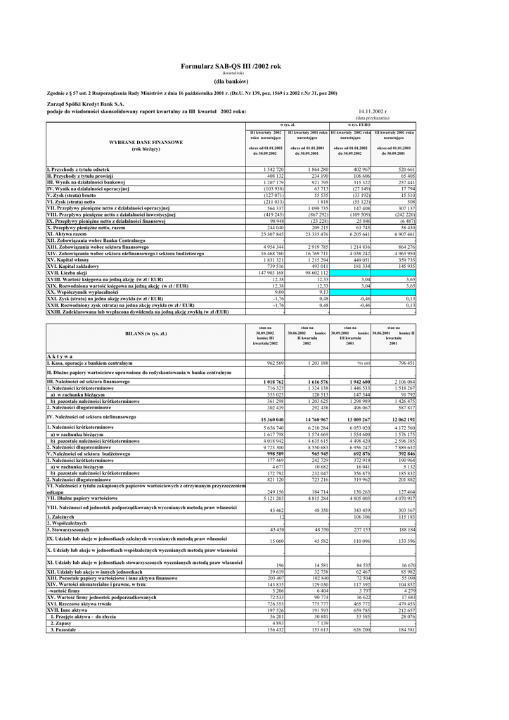 Formularz SAB-QS III /2002 rok (kwartał/rok) (dla banków) Zgodnie z § 57 ust. 2 Rozporządzenia Rady Ministrów z dnia 16 października 2001 r. (Dz.U. Nr 139, poz. 1569 i z 2002 r.Nr 31, poz 280) Zarząd Spółki Kredyt Bank S.A. podaje do wiadomości skonsolidowany raport kwartalny za III kwartał 2002 roku: 14.11.2002 r (data przekazania) w tys. zł. WYBRANE DANE FINANSOWE (rok bieżący) I. Przychody z tytułu odsetek II. Przychody z tytułu prowizji III. Wynik na działalności bankowej IV. Wynik na działalności operacyjnej V. Zysk (strata) brutto VI. Zysk (strata) netto VII. Przepływy pienięzne netto z działalności operacyjnej VIII. Przepływy pienięzne netto z działalności inwestycyjnej IX. Przepływy pieniężne netto z działalności finansowej X. Przepływy pieniężne netto, razem XI. Aktywa razem XII. Zobowiązania wobec Banku Centralnego XIII. Zobowiązania wobec sektora finansowego XIV. Zobowiązania wobec sektora niefinansowego i sektora budżetowego XV. Kapitał własny XVI. Kapitał zakładowy XVII. Liczba akcji XVIII. Wartość księgowa na jedną akcję (w zł / EUR) XIX. Rozwodniona wartość księgowa na jedną akcję (w zł / EUR) XX. Współczynnik wypłacalności XXI. Zysk (strata) na jedna akcję zwykła (w zł / EUR) XXII. Rozwodniony zysk (strata) na jedna akcję zwykła (w zł / EUR) XXIII. Zadeklarowana lub wypłacona dywidenda na jedną akcję zwykłą (w zł /EUR) BILANS (w tys. zł.) III kwartały 2002 roku narastająco w tys. EURO III kwartały 2001 roku III kwartały 2002 roku III kwartały 2001 roku narastająco narastająco narastająco okres od 01.01.2002 do 30.09.2002 okres od 01.01.2001 do 30.09.2001 1 542 720 408 132 1 207 179 (103 938) (127 071) (211 033) 564 337 (419 245) 98 948 244 040 25 307 845 4 954 344 16 468 760 1 831 321 739 516 147 903 168 12,38 12,38 9,00 -1,76 -1,76 stan na 30.09.2002 koniec III kwartału/2002 okres od 01.01.2002 do 30.09.2002 1 864 280 234 190 921 795 63 713 55 535 1 818 1 099 735 (867 292) (23 228) 209 215 23 335 476 2 919 785 16 769 711 1 215 294 493 011 98 602 112 12,33 12,33 9,13 0,48 0,48 stan na 30.06.2002 koniec II kwartału 2002 okres od 01.01.2001 do 30.09.2001 402 967 106 606 315 322 (27 149) (33 192) (55 123) 147 408 (109 509) 25 846 63 745 6 205 641 1 214 836 4 038 242 449 051 181 334 520 661 65 405 257 441 17 794 15 510 508 307 137 (242 220) (6 487) 58 430 6 907 461 864 276 4 963 950 359 735 145 935 3,04 3,04 3,65 3,65 -0,46 -0,46 - 0,13 0,13 - stan na stan na 30.09.2001 koniec 30.06.2001 koniec II III kwartału kwartału 2001 2001 Aktywa I. Kasa, operacje z bankiem centralnym II. Dłużne papiery wartościowe uprawnione do redyskontowania w banku centralnym III. Należności od sektora finansowego 1. Należności krótkoterminowe a) w rachunku bieżącym b) pozostałe należności krótkoterminowe 2. Należności długoterminowe IV. Należności od sektora niefinansowego 1. Należności krótkoterminowe a) w rachunku bieżącym b) pozostałe należności krótkoterminowe 2. Należności długoterminowe V. Należności od sektora budżetowego 1. Należności krótkoterminowe a) w rachunku bieżącym b) pozostałe należności krótkoterminowe 2. Należności długoterminowe VI. Należności z tytułu zakupionych papierów wartościowych z otrzymanym przyrzeczeniem odkupu VII. Dłużne papiery wartościowe VIII. Należnosci od jednostek podporządkowanych wycenianych metodą praw własności 1. Zależnych 2. Współzależnych 3. Stowarzyszonych IX. Udziały lub akcje w jednostkach zależnych wycenianych metodą praw własności X. Udziały lub akcje w jednostkach współzależnych wycenianych metodą praw własności XI. Udziały lub akcje w jednostkach stowarzyszonych wycenianych metodą praw własności XII. Udziały lub akcje w innych jednostkach XIII. Pozostałe papiery wartościowe i inne aktywa finansowe XIV. Wartości niematerialne i prawne, w tym: -wartość firmy XV. Wartość firmy jednostek podporzadkowanych XVI. Rzeczowe aktywa trwałe XVII. Inne aktywa 1. Przejęte aktywa - do zbycia 2. Zapasy 3. Pozostałe 962 569 1 203 188 791 685 796 451 1 018 762 716 323 355 025 361 298 302 439 1 616 576 1 324 138 120 513 1 203 625 292 438 1 942 600 1 446 533 147 544 1 298 989 496 067 2 106 084 1 518 267 91 792 1 426 475 587 817 15 360 040 14 760 967 13 009 267 12 062 192 5 636 740 1 617 798 4 018 942 9 723 300 998 589 177 469 4 677 172 792 821 120 6 210 284 1 574 669 4 635 615 8 550 683 965 945 242 729 10 682 232 047 723 216 6 053 020 1 554 600 4 498 420 6 956 247 692 876 372 914 16 041 356 873 319 962 4 172 560 1 576 175 2 596 385 7 889 632 392 846 190 964 5 132 185 832 201 882 249 156 5 121 203 184 714 4 815 284 130 263 4 805 003 127 464 4 070 917 43 462 12 43 450 48 350 48 350 343 459 106 306 237 153 303 367 115 183 188 184 15 060 45 582 110 096 133 596 - - - - 196 39 619 203 407 143 835 5 206 72 533 726 353 197 526 36 201 4 893 156 432 14 581 32 738 102 840 129 030 6 404 90 774 775 777 191 593 30 841 7 139 153 613 84 535 62 467 72 504 117 392 3 797 16 622 465 772 659 785 33 585 626 200 16 670 85 982 55 098 104 852 4 279 17 683 479 453 212 657 28 076 184 581 XVIII. Rozliczenia międzyokresowe 1. Aktywa z tytułu odroczonego podatku dochodowego 2. Pozostałe rozliczenia międzyokresowe Aktywa razem 155 535 51 577 103 958 25 307 845 187 949 138 148 49 801 25 165 888 31 150 31 150 23 335 476 37 392 37 392 21 002 704 0 BILANS (w tys. zł.) Pasywa I. Zobowiązania wobec banku centralnego II. Zobowiązania wobec sektora finansowego 1. Zobowiązania krótkoterminowe a) w rachunku bieżącym b) pozostałe zobowiązania krótkoterminowe 2. Zobowiązania długoterminowe III. Zobowiązania wobec sektora niefinansowego 1. Zobowiązania krótkoterminowe a) w rachunku bieżącym w tym: - oszczędnościowe b) Pozostałe zobowiązania krótkoterminowe, w tym: - oszczędnościowe 2. Zobowiązania długoterminowe, w tym: - oszczędnościowe IV. Zobowiązania wobec sektora budżetowego 1. Zobowiązania krótkot