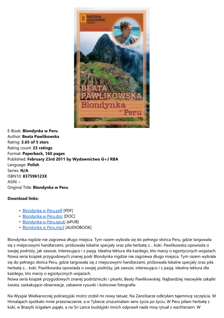 E-Book: Blondynka w Peru Author: Beata Pawlikowska Rating: 3.65 of 5 stars Rating count: 23 ratings Format: Paperback, 160 pages Published: February 23rd 2011 by Wydawnictwo G+J RBA Language: Polish Series: N/A ISBN10: 837596123X ASIN: Original Title: Blondynka w Peru Download links: • • • • Blondynka w Peru.pdf [PDF] Blondynka w Peru.doc [DOC] Blondynka w Peru.epub [ePUB] Blondynka w Peru.mp3 [AUDIOBOOK] Blondynka nigdzie nie zagrzewa długo miejsca. Tym razem wybrała się do pełnego słońca Peru, gdzie targowała się z miejscowymi handlarzami, próbowała lokalne specjały oraz piła herbatę z… koki. Pawlikowska opowiada o swojej podróży, jak zawsze, interesująco i z pasją. Idealna lektura dla każdego, kto marzy o egzotycznych wojażach. Nowa seria książek przygodowych znanej podr Blondynka nigdzie nie zagrzewa długo miejsca. Tym razem wybrała się do pełnego słońca Peru, gdzie targowała się z miejscowymi handlarzami, próbowała lokalne specjały oraz piła herbatę z… koki. Pawlikowska opowiada o swojej podróży, jak zawsze, interesująco i z pasją. Idealna lektura dla każdego, kto marzy o egzotycznych wojażach. Nowa seria książek przygodowych znanej podróżniczki i pisarki, Beaty Pawlikowskiej. Najbardziej niezwykłe zakątki świata, zaskakujące obserwacje, zabawne rysunki i kolorowe fotografie. Na Wyspie Wielkanocnej polinezyjski mistrz zrobił mi nowy tatuaż. Na Zanzibarze odkryłam tajemnicę szczęścia. W Himalajach spotkało mnie przeznaczenie, a w Tybecie zrozumiałam sens życia po życiu. W Peru piłam herbatę z koki, w Brazylii ścigałam pająki, a na Sri Lance buddyjski mnich odprawił nade mną rytuał z wachlarzem. W Tanzanii leciałam spadającym balonem, a w Indiach spotkałam białego szczura. W Kambodży dowiedziałam się, że Himalajach spotkało mnie przeznaczenie, a w Tybecie zrozumiałam sens życia po życiu. W Peru piłam herbatę z koki, w Brazylii ścigałam pająki, a na Sri Lance buddyjski mnich odprawił nade mną rytuał z wachlarzem. W Tanzanii leciałam spadającym balonem, a w Indiach spotkałam białego szczura. W Kambodży dowiedziałam się, że mam na imię Mały Wiatr, w Meksyku jadłam pieczone świerszcze, a w Amazonii tropiłam jaguara…