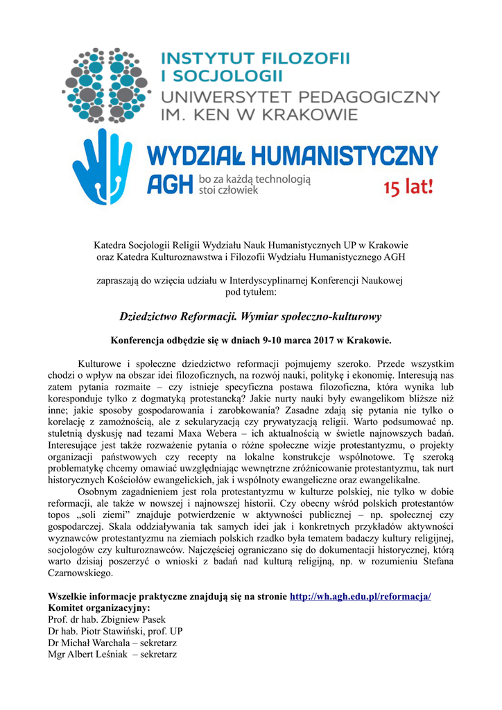Katedra Socjologii Religii Wydziału Nauk Humanistycznych UP w Krakowie oraz Katedra Kulturoznawstwa i Filozofii Wydziału Humanistycznego AGH zapraszają do wzięcia udziału w Interdyscyplinarnej Konferencji Naukowej pod tytułem: Dziedzictwo Reformacji. Wymiar społeczno-kulturowy Konferencja odbędzie się w dniach 9-10 marca 2017 w Krakowie. Kulturowe i społeczne dziedzictwo reformacji pojmujemy szeroko. Przede wszystkim chodzi o wpływ na obszar idei filozoficznych, na rozwój nauki, politykę i ekonomię. Interesują nas zatem pytania rozmaite – czy istnieje specyficzna postawa filozoficzna, która wynika lub koresponduje tylko z dogmatyką protestancką? Jakie nurty nauki były ewangelikom bliższe niż inne; jakie sposoby gospodarowania i zarobkowania? Zasadne zdają się pytania nie tylko o korelację z zamożnością, ale z sekularyzacją czy prywatyzacją religii. Warto podsumować np. stuletnią dyskusję nad tezami Maxa Webera – ich aktualnością w świetle najnowszych badań. Interesujące jest także rozważenie pytania o różne społeczne wizje protestantyzmu, o projekty organizacji państwowych czy recepty na lokalne konstrukcje wspólnotowe. Tę szeroką problematykę chcemy omawiać uwzględniając wewnętrzne zróżnicowanie protestantyzmu, tak nurt historycznych Kościołów ewangelickich, jak i wspólnoty ewangeliczne oraz ewangelikalne. Osobnym zagadnieniem jest rola protestantyzmu w kulturze polskiej, nie tylko w dobie reformacji, ale także w nowszej i najnowszej historii. Czy obecny wśród polskich protestantów topos „soli ziemi” znajduje potwierdzenie w aktywności publicznej – np. społecznej czy gospodarczej. Skala oddziaływania tak samych idei jak i konkretnych przykładów aktywności wyznawców protestantyzmu na ziemiach polskich rzadko była tematem badaczy kultury religijnej, socjologów czy kulturoznawców. Najczęściej ograniczano się do dokumentacji historycznej, którą warto dzisiaj poszerzyć o wnioski z badań nad kulturą religijną, np. w rozumieniu Stefana Czarnowskiego. Wszelkie informacje praktyczne znajdują się na stronie http://wh.agh.edu.pl/reformacja/ Komitet organizacyjny: Prof. dr hab. Zbigniew Pasek Dr hab. Piotr Stawiński, prof. UP Dr Michał Warchala – sekretarz Mgr Albert Leśniak – sekretarz