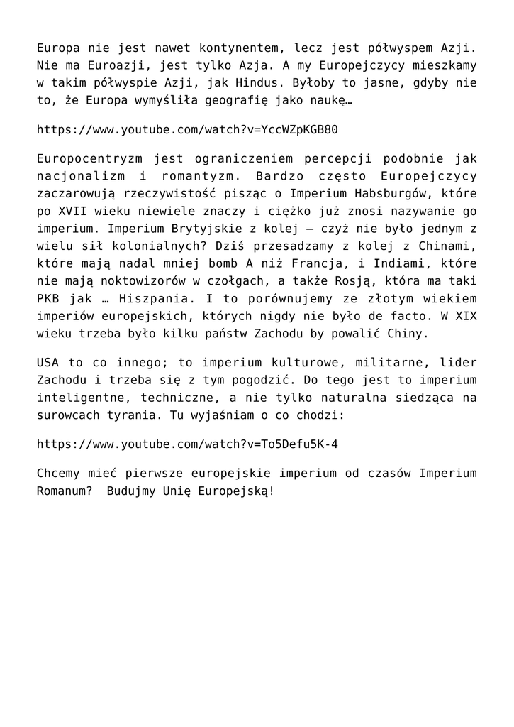 Europa nie jest nawet kontynentem, lecz jest półwyspem Azji. Nie ma Euroazji, jest tylko Azja. A my Europejczycy mieszkamy w takim półwyspie Azji, jak Hindus. Byłoby to jasne, gdyby nie to, że Europa wymyśliła geografię jako naukę… https://www.youtube.com/watch?v=YccWZpKGB80 Europocentryzm jest ograniczeniem percepcji podobnie jak nacjonalizm i romantyzm. Bardzo często Europejczycy zaczarowują rzeczywistość pisząc o Imperium Habsburgów, które po XVII wieku niewiele znaczy i ciężko już znosi nazywanie go imperium. Imperium Brytyjskie z kolej – czyż nie było jednym z wielu sił kolonialnych? Dziś przesadzamy z kolej z Chinami, które mają nadal mniej bomb A niż Francja, i Indiami, które nie mają noktowizorów w czołgach, a także Rosją, która ma taki PKB jak … Hiszpania. I to porównujemy ze złotym wiekiem imperiów europejskich, których nigdy nie było de facto. W XIX wieku trzeba było kilku państw Zachodu by powalić Chiny. USA to co innego; to imperium kulturowe, militarne, lider Zachodu i trzeba się z tym pogodzić. Do tego jest to imperium inteligentne, techniczne, a nie tylko naturalna siedząca na surowcach tyrania. Tu wyjaśniam o co chodzi: https://www.youtube.com/watch?v=To5Defu5K-4 Chcemy mieć pierwsze europejskie imperium od czasów Imperium Romanum? Budujmy Unię Europejską!