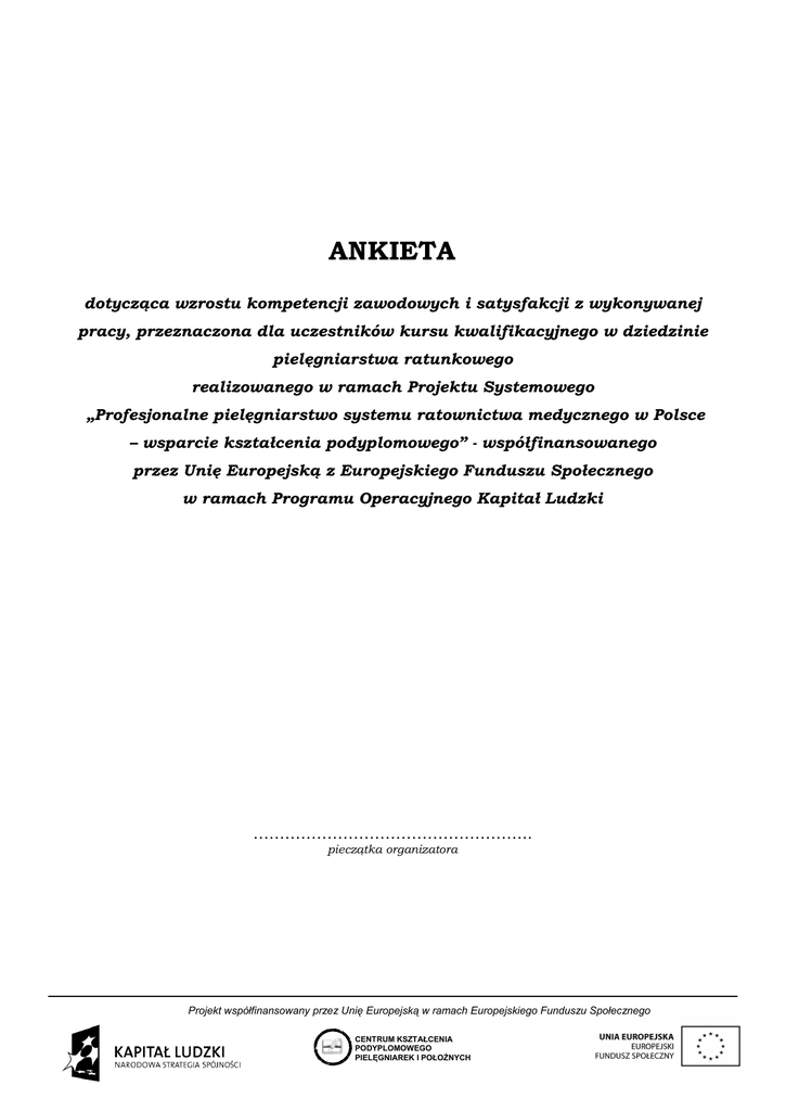 ANKIETA dotycząca wzrostu kompetencji zawodowych i satysfakcji z wykonywanej pracy, przeznaczona dla uczestników kursu kwalifikacyjnego w dziedzinie pielęgniarstwa ratunkowego realizowanego w ramach Projektu Systemowego „Profesjonalne pielęgniarstwo systemu ratownictwa medycznego w Polsce – wsparcie kształcenia podyplomowego” - współfinansowanego przez Unię Europejską z Europejskiego Funduszu Społecznego w ramach Programu Operacyjnego Kapitał Ludzki …………………………………………….. pieczątka organizatora Projekt współfinansowany przez Unię Europejską w ramach Europejskiego Funduszu Społecznego CENTRUM KSZTAŁCENIA PODYPLOMOWEGO PIELĘGNIAREK I POŁOśNYCH Szanowni Państwo Zwracamy się do Państwa z uprzejmą prośbą o udzielenie odpowiedzi na pytania zawarte w ankiecie. Celem ankiety jest poznanie Państwa opinii dotyczących wzrostu kompetencji zawodowych i satysfakcji z wykonywanej pracy, po realizacji kształcenia podyplomowego pielęgniarek i pielęgniarzy w dziedzinie pielęgniarstwa ratunkowego w ramach Programu Operacyjnego Kapitał Ludzki. Zamieszczone w ankiecie pytania zaopatrzone są w zestaw moŜliwych odpowiedzi. Wybraną odpowiedź naleŜy wskazać wpisując znak „ X ” w puste pole znajdujące się przy kaŜdej odpowiedzi. Ankieta jest anonimowa. Płeć Wiek Wykształcenie StaŜ pracy w zawodzie pielęgniarki/pielęgniarza StaŜ pracy w systemie ratownictwa medycznego kobieta męŜczyzna 20 – 30 lat 41 – 50 lat 31 – 40 lat powyŜej 50 lat średnie wyŜsze zawodowe - licencjat wyŜsze zawodowe - magister inne wyŜsze do 5 lat 16 – 25 lat 6 – 15 lat powyŜej 25 lat do 5 lat 16 – 25 lat 6 – 15 lat powyŜej 25 lat nie dotyczy Rodzaj ukończonego kursu w ramach POKL kurs specjalistyczny RKO kurs kwalifikacyjny PR 1. Proszę wskazać, czy po zakończeniu kursu poszerzył się Pani/Pana zakres wiedzy z dziedziny pielęgniarstwa ratunkowego? TAK NIE 2. Proszę wskazać, czy po zakończeniu kursu poszerzył się Pani/Pana zakres umiejętności praktycznych z dziedziny pielęgniarstwa ratunkowego? TAK NIE Projekt współfinansowany przez Unię Europejską w ramach Europejskiego Funduszu Społecznego CENTRUM KSZTAŁCENIA PODYPLOMOWEGO PIELĘGNIAREK I POŁOśNYCH 2 3. Czy uwaŜa Pani/Pan, Ŝe kurs przyczynił się do podwyŜszenia Pani/Pana kompetencji zawodowych? TAK NIE 4. Proszę określić poziom posiadanych kompetencji w zakresie pielęgniarstwa ratunkowego w skali 1-10 gdzie 1 oznacza bardzo niski, 10 oznacza bardzo wysoki 1 2 3 4 5 6 7 8 9 10 przed podjęciem kształcenia na kursie po ukończeniu kursu 5. Proszę wskazać, czy wiedza i umiejętności wyniesione z kursu przyczyniły się do wzrostu satysfakcji z wykonywanej pracy? TAK NIE 6. Proszę wskazać, czy ukończony kurs wpłynął/wpłynie na wzrost Pani/Pana samooceny zawodowej? TAK NIE 7. Proszę wskazać, czy ukończony kurs przyczynił lub przyczyni się w Pani/Pana ocenie do satysfakcjonującej pozycji w środowisku pracy (większe uznanie pacjentów/kolegów/przełoŜonych)? TAK NIE 8. Proszę określić poziom satysfakcji z wykonywanej przez siebie pracy w skali 1-10 gdzie 1 oznacza bardzo niski, 10 oznacza bardzo wysoki 1 2 3 4 5 6 7 8 9 10 przed podjęciem kształcenia na kursie po ukończeniu kursu Dziękujemy za udzielone odpowiedzi Projekt współfinansowany przez Unię Europejską w ramach Europejskiego Funduszu Społecznego CENTRUM KSZTAŁCENIA PODYPLOMOWEGO PIELĘGNIAREK I POŁOśNYCH 3