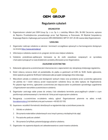 Regulamin szkoleń ORGANIZATOR 1. Organizatorem szkoleń jest OEM Group Sp. z o.o. Sp. k. z siedzibą: Miłocin 284; 36-062 Zaczernie, wpisana do Rejestru Przedsiębiorców prowadzonego przez Sąd Rejonowy w Rzeszowie, XII Wydział Gospodarczy Krajowego Rejestru Sądowego pod numerem KRS 0000582822, NIP 517-037-20-80 zwana dalej Organizatorem. SZKOLENIA 2. Organizator realizuje szkolenia w zakresie i terminach szczegółowo opisanych w harmonogramie dostępnym na stronie http://www.oemsolar.pl 3. Informacja o szkoleniu zawiera m.in. program, termin oraz miejsce szkolenia. 4. Szkolenia produktowo-aplikacyjne kierowane są do osób zawodowo związanych ze sprzedażą i/lub wykorzystujących w swej działalności produkty oferowane przez Organizatora. ZGŁOSZENIE UCZESTNICTWA 5. Dokonanie zgłoszenia uczestnictwa jest równoznaczne z zapoznaniem się i akceptacją niniejszego regulaminu. 6. Dzień roboczy oznacza dzień od poniedziałku do piątku w godzinach od 8:00 do 16:00. Każde zgłoszenie, które wpłynie po godzinie 16:00 jest traktowane jako przyjęte następnego dnia roboczego. 7. Warunkiem udziału w szkoleniu jest dostępność wolnych miejsc oraz przesłanie przez uczestnika zgłoszenia nie później niż 1 dzień roboczy przed rozpoczęciem szkolenia (liczy się data wpływu do Organizatora). Po upływie tego terminu, zgłoszenie uczestnictwa jest dopuszczalne na podstawie uprzedniego uzgodnienia z Organizatorem warunków uczestnictwa w szkoleniu. 8. Organizator zastrzega sobie prawo do zmiany i/lub odwołania terminów poszczególnych szkoleń o czym poinformuje zainteresowanych z terminie do 1 dnia przed rozpoczęciem szkolenia. 9. Rezygnację z uczestnictwa w szkoleniu należy zgłosić Organizatorowi pisemnie na adres e-mail: [email protected] lub telefonicznie pod numerem +48 665 651 100. 10. Dopełnienie wszelkich formalności określonych w regulaminie daje uczestnikowi prawo do: 1. Udziału w szkoleniu. 2. Otrzymania materiałów szkoleniowych oraz innych pomocy niezbędnych do zajęć. 3. Poczęstunku podczas szkoleń. 4. Otrzymania Certyfikatu potwierdzającego udział w szkoleniu. 11. Organizator nie zapewnia dojazdu ani zakwaterowania w czasie trwania szkolenia. OCHRONA DANYCH OSOBOWYCH 12. Uczestnik szkolenia poprzez przystąpienie do udziału w szkoleniu wyraża zgodę na przetwarzanie swoich danych osobowych przez Organizatora na podstawie art. 31 Ustawy o ochronie danych osobowych wyłącznie w celach marketingowych, przeprowadzenia szkolenia oraz w celach komunikacji z Uczestnikiem. Uczestnik w każdym momencie ma dostęp do swoich danych osobowych, przysługuje mu prawo wglądu, poprawiania oraz do wniesienia żądania zaprzestania ich wykorzystywania, jak i do sprzeciwu wobec ich przetwarzania, zgodnie z postanowieniami Ustawy z dnia 29 sierpnia 1997 r. o ochronie danych osobowych. ODPOWIEDZIALNOŚĆ 13. Organizator oświadcza, że treści przekazane przez niego w trakcie szkolenia mają charakter wyłącznie edukacyjny. Organizator nie ponosi żadnej odpowiedzialności za szkody powstałe u Uczestników lub osób trzecich, w związku lub na skutek wykorzystania przez Uczestników informacji, wiedzy lub umiejętności zdobytych w trakcie szkolenia, w sposób niezgodny z ich przeznaczeniem. v.4. 15.11.2016