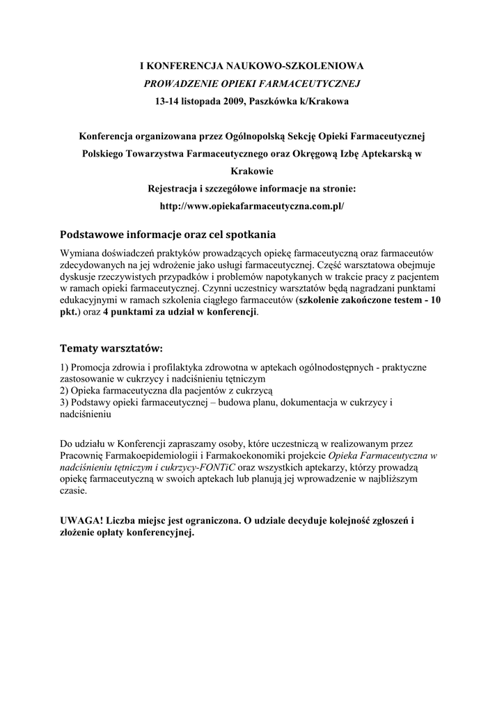 I KONFERENCJA NAUKOWO-SZKOLENIOWA PROWADZENIE OPIEKI FARMACEUTYCZNEJ 13-14 listopada 2009, Paszkówka k/Krakowa Konferencja organizowana przez Ogólnopolską Sekcję Opieki Farmaceutycznej Polskiego Towarzystwa Farmaceutycznego oraz Okręgową Izbę Aptekarską w Krakowie Rejestracja i szczegółowe informacje na stronie: http://www.opiekafarmaceutyczna.com.pl/ Podstawowe informacje oraz cel spotkania Wymiana doświadczeń praktyków prowadzących opiekę farmaceutyczną oraz farmaceutów zdecydowanych na jej wdroŜenie jako usługi farmaceutycznej. Część warsztatowa obejmuje dyskusje rzeczywistych przypadków i problemów napotykanych w trakcie pracy z pacjentem w ramach opieki farmaceutycznej. Czynni uczestnicy warsztatów będą nagradzani punktami edukacyjnymi w ramach szkolenia ciągłego farmaceutów (szkolenie zakończone testem - 10 pkt.) oraz 4 punktami za udział w konferencji. Tematy warsztatów: 1) Promocja zdrowia i profilaktyka zdrowotna w aptekach ogólnodostępnych - praktyczne zastosowanie w cukrzycy i nadciśnieniu tętniczym 2) Opieka farmaceutyczna dla pacjentów z cukrzycą 3) Podstawy opieki farmaceutycznej – budowa planu, dokumentacja w cukrzycy i nadciśnieniu Do udziału w Konferencji zapraszamy osoby, które uczestniczą w realizowanym przez Pracownię Farmakoepidemiologii i Farmakoekonomiki projekcie Opieka Farmaceutyczna w nadciśnieniu tętniczym i cukrzycy-FONTiC oraz wszystkich aptekarzy, którzy prowadzą opiekę farmaceutyczną w swoich aptekach lub planują jej wprowadzenie w najbliŜszym czasie. UWAGA! Liczba miejsc jest ograniczona. O udziale decyduje kolejność zgłoszeń i złoŜenie opłaty konferencyjnej.