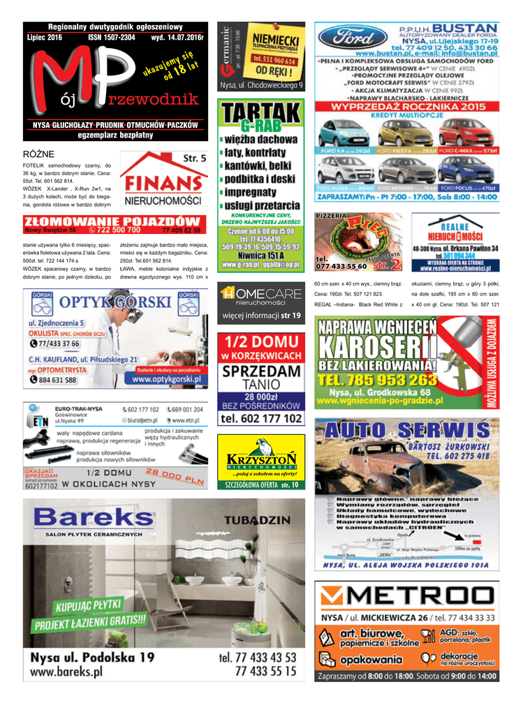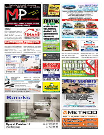 Regionalny dwutygodnik og³oszeniowy Lipiec 2016 ISSN 1507-2304 wyd. 14.07.2016r siê y m e uj lat ukaz od 18 NYSA G£UCHO£AZY PRUDNIK OTMUCHÓW PACZKÓW egzemplarz bezp³atny RÓŻNE FOTELIK samochodowy czarny, do 36 kg, w bardzo dobrym stanie. Cena: 55zł. Tel. 601 562 814. WÓZEK X-Lander , X-Run 2w1, na 3 dużych kołach, może być do biegania, gondola różowa w bardzo dobrym stanie używana tylko 6 miesięcy, spac- złożeniu zajmuje bardzo mało miejsca, erówka fioletowa używana 2 lata. Cena: mieści się w każdym bagażniku. Cena: 500zł. tel. 722 144 174.s 250zł. Tel.601 562 814. WÓZEK spacerowy czarny, w bardzo ŁAWA, meble kolonialne indyjskie z dobrym stanie, po jednym dziecku, po drewna egzotycznego wys. 110 cm x 2 nieruchomosci więcej informacji str 19 SZCZEGÓŁOWA OFERTA str. 10 60 cm szer. x 40 cm wys., ciemny brąz. okuciami, ciemny brąz, u góry 3 półki, Cena: 190zł. Tel. 507 121 823. na dole szafki, 195 cm x 80 cm szer. REGAŁ –Indiana- Black Red White z x 40 cm gł. Cena: 190zł. Tel. 507 121 BEZPŁATNE OGŁOSZENIA DROBNE „MÓJ PRZEWODNIK” tel. 077 448 09 09 [email protected] 823. ZIEMNIAK stary 300 kg Vinete. Tel. 502 650 167. CEGŁA z rozbiórki. Cena: 0,50zł./szt. Tel. 602 762 193. CZĘŚCI do dźwigu 6t i 10t. Cena 5002.000zł. Tel. 505 861 432. WÓZEK wielofunkcyjny Toto. Cena 200zł. Tel. 505 861 432. KRZESEŁKO do jedzenia przy stole, drewniane, wyścielane. Cena: 60zł. Tel. 77 433 48 69, 608 878 481. KRZESEŁKO do jedzenia przy stole, plastikowe. Cena: 30zł. Tel. 77 433 48 69, 608 878 481. PIŁA ukośna - kątna, nowa, niemiecka. Cena: 250zł. Tel. 77 433 48 69, 608 878 481. PODSZEWKA ubraniowa, granatowa, 24m, szer. 1,5 m. Cena: 100zł. Tel. 77 433 48 69, 608 878 481. ROLETY 2 szt. nowe, białe 60cm. Cena: 40zł/szt. Tel. 77 433 48 69, 608 str. 878 481. KSIĄŻECZKI o jachtach 15 pozycji. Cena: 200zł. Tel. 77 433 48 69, 608 878 481. PIŁKI skórzane- nowe, 2szt. Cena: 40zł./szt. Tel. 77 433 48 69, 608 878 481. BECZKA do wędzenia 70 cm wys.. Cena: 80zł. Tel. 77 433 48 69, 608 878 481. GARY duże 50 l. Cena: 150zł. Tel. 77 433 48 69, 608 878 481. GARY duże 30 l. Cena: 100zł. Tel. 77 433 48 69, 608 878 481. TAŚMA aluminiowa szer.2 cm, 4 kg. Cena: 150zł. Tel. 77 433 48 69, 608 878 481. PROGI metalowe między panelami, nowe, niemieckie, 6 szt. Cena: 250zł. Tel. 77 433 48 69, 608 878 481. KOSIARKA elektryczna nowa Bosch, Rotak 34. Cena: 310zł. Tel. 698 238 833. KOSIARKA poduszkowa, nowa Bosch. Cena: 175zł. Tel. 698 238 833. WERTYKULOTOR elektryczny, nowy. Cena: 265zł. Tel. 698 238 833. ROZDRABNIACZ do gałęzi zębatkowy. Cena: 255zł. Tel. 698 238 833. ŁÓŻKO rehabilitacyjne meblowe sterowane za pomocą pilota dla osób trwale leżących, z materacem. Cena: 1.000zł. Tel. 606 745 160. ELEKTRYCZNY podnośnik transportowy pacjenta firmy SITO MEYNA, sterowany pilotem i zasilany akumulatorowo wraz z siedziskiem. Cena: 1.500zł. Tel. 606 745 160. SILNIK 7 kw, trójkąt gniazda. Cena: 500zł. do neg. Tel. 662 322 668. ŚRUTOWNIK bijakowy. Cena: 500zł. do neg. Tel. 662 322 668. PODNOŚNIK hydrauliczny Krokodyl dł. na 110 cm, udżwig 10 ton. Cena: 300zł. Tel. 77 433 32 88. ODDAM za darmo komplet szafek do kuchni, 10 szt.- różne, stan bardzo dobry. Tel. 433 98 85. STOLICZEK edukacyjny firmy Smily Play, stan bardzo dobry. Cena: 80zł. Tel. 608 818 288. KIEROWNICA interaktywna firmy Fisher Price, stan bardzo dobry. Cena: 60zł. Tel. 608 818 288. TOR wyścigowy firmy Fisher Price „Little people”, stan bardzo dobry. Cena: 50zł. Tel. 608 818 288. TELEFON stacjonarny-przewodowy, typ Maxim, mało używany. Cena: 30zł. Tel. 505 504 454. TELEFON stacjonarny-bezprzewodowy „Panasonic”, mało używany. Cena: 120zł. do neg. Tel. 505 504 454. KALKULATOR typ Elwro-144 230W 4V, 175 cm. Cena: 70zł. Tel. 505 504 454. mało używany. Cena: 40zł. Tel. 505 504 NOSIDEŁKO dla niemowlęcia, stan 454. bardzo dobry. Cena: 30zł. Tel. 534 580 PŁASZCZ jesienno- zimowy, męski, kolor czarny, ortalion z podpinką, rozm. BEZPŁATNE OGŁOSZENIA DROBNE, tel. 77 448 09 09 pn. - pt. od 8.00 - 16.00, [email protected], www.mojprzewodnik.pl 743. ODDAM za darmo książkę do biologii BEZPŁATNE OGŁOSZENIA DROBNE „MÓJ PRZEWODNIK” tel. 077 448 09 09 [email protected] do gimnazjum Puls Życia. Tel. 534 580 743. SUSZARKA elektrodowa Bester 250 amper. Cena: 1.000zł. Tel. 667 725 188. STÓŁ 100 letni z szufladą 70 x 78. Cena: 60zł. do neg. Tel. 728 457 149. BUTY na koturnie, letnie bez palców i pięt, z przodu ładne ozdoby, nowe, rozm.37. Cena: 30zł. Tel. 728 457 149. SANDAŁY letnie, skóra, koturn (korek), kolor szary, rozmiar 37/38. Cena: 15zł. Tel. 728 457 149. PŁYTY gramofonowe winylowe wydane na zachodzie, różne gatunki muzyki. Cena: 15zł./ szt. Tel. 600 464 347. LAMPY wiszące do kuchni. Cena: 15zł/2 szt. Tel. 600 464 347. PIEC CO z wentylatorem i sterownikiem typ KWKIS, producent „Żębiec”, w dobrym stanie, powierzchnia grzewcza 160 m2. Cena: 600zł. Tel. 537 471 508. ROWER damski mało używany. Cena: 100zł. Tel. 77 433 60 92. BRAMA dwuskrzydłowa, 1 skrzydło 245 x 185 cm. Cena: 140zł. Tel. 609 364 964. WAGA gospodarcza do 200kg. Cena: 100zł. Głuchołazy. Tel. 77 439 18 98. KLATKA dla psa, 1m3, pręty bez ocieplenia. Cena: 100zł. Głuchołazy. Tel. 77 439 18 98. MASZYNA do szycia Łucznik, używana. Cena: 150zł. Tel. 77 439 18 98. GARNEK gliniany 20L. Cena: 100zł. Tel. 77 439 18 98. KUCHNIA elektryczna, 4-palnikowa + piekarnik, brązowa, nieużywana, nowa. Cena: 400zł. Tel. 77 439 18 98. BLAT nowy, marmurowy, kolorowy średni brąz, 60x180cm. Cena: 800zł. Tel. 77 439 18 98. WERSALKA używana, Głuchołazy. Cena: 100zł. Tel. 77 439 18 98. GRZEJNIK elektryczny, przenośny. Cena: 100zł. Tel. 77 439 18 98. WIESZAK do przedpokoju. Cena: 50zł. Tel. 77 439 18 98. SZAFKA pod TV. Cena: 100zł. Tel. 77 439 18 98. FOTELIK samochodowy dla dziecka do 25 kg, w dobrym stanie. Cena: 45zł. Tel.600 464 347. OBRAZ 60x50cm pejzaż wi