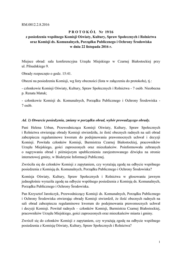 RM.0012.2.8.2016 P R O T O K Ó Ł Nr 19/16 z posiedzenia wspólnego Komisji Oświaty, Kultury, Spraw Społecznych i Rolnictwa oraz Komisji ds. Komunalnych, Porządku Publicznego i Ochrony Środowiska w dniu 22 listopada 2016 r. Miejsce obrad: sala konferencyjna Urzędu Miejskiego w Czarnej Białostockiej przy ul. Piłsudskiego 9. Obrady rozpoczęto o godz. 15:41. Obecni na posiedzeniu Komisji, wg listy obecności (lista w załączeniu do protokołu), tj.: - członkowie Komisji Oświaty, Kultury, Spraw Społecznych i Rolnictwa - 7 osób. Nieobecna p. Renata Matuk; - członkowie Komisji ds. Komunalnych, Porządku Publicznego i Ochrony Środowiska 7 osób. Ad. 1) Otwarcie posiedzenia, zmiany w porządku obrad, wybór prowadzącego obrady. Pani Helena Urban, Przewodnicząca Komisji Oświaty, Kultury, Spraw Społecznych i Rolnictwa otwierając obrady Komisji stwierdziła, że ilość obecnych radnych na sali obrad zabezpiecza regulaminowe kworum do podejmowania prawomocnych uchwał i decyzji Komisji. Powitała członków Komisji, Burmistrza Czarnej Białostockiej, pracowników Urzędu Miejskiego, gości zaproszonych oraz mieszkańców. Poinformowała zebranych o nagrywaniu obrad i późniejszym upublicznieniu zarejestrowanego dźwięku na stronie internetowej gminy, w Biuletynie Informacji Publicznej. Zwróciła się do członków Komisji z zapytaniem, czy wyrażają zgodę na odbycie wspólnego posiedzenia z Komisją ds. Komunalnych, Porządku Publicznego i Ochrony Środowiska? Komisja Oświaty, Kultury, Spraw Społecznych i Rolnictwa w głosowaniu jawnym jednogłośnie wyraziła zgodę na odbycie wspólnego posiedzenia z Komisją ds. Komunalnych, Porządku Publicznego i Ochrony Środowiska. Pan Krzysztof Jarończyk, Przewodniczący Komisji ds. Komunalnych, Porządku Publicznego i Ochrony Środowiska otwierając obrady Komisji stwierdził, że ilość obecnych radnych na sali obrad zabezpiecza regulaminowe kworum do podejmowania prawomocnych uchwał i decyzji Komisji. Powitał radnych – członków Komisji, Burmistrza Czarnej Białostockiej, pracowników Urzędu Miejskiego, gości zaproszonych oraz mieszkańców miasta i gminy. Zwrócił się do członków Komisji z zapytaniem, czy wyrażają zgodę na odbycie wspólnego posiedzenia z Komisją Oświaty, Kultury, Spraw Społecznych i Rolnictwa? 1 Komisja ds. Komunalnych, Porządku Publicznego i Ochrony Środowiska w głosowaniu jawnym jednogłośnie wyraziła zgodę na odbycie wspólnego posiedzenia z Komisją Oświaty, Kultury, Spraw Społecznych i Rolnictwa. Przewodnicząca Komisji Oświaty, Kultury, Spraw Społecznych i Rolnictwa zwróciła się do członków Komisji z pytaniem, czy mają uwagi do zaproponowanego porządku obrad? Uwag nie zgłoszono. Przewodniczący Komisji ds. Komunalnych, Porządku Publicznego i Ochrony Środowiska zwrócił się do członków Komisji z pytaniem, czy mają uwagi do zaproponowanego porządku obrad? Uwag nie zgłoszono. Porządek posiedzenia przedstawia się następująco: 1. Otwarcie posiedzenia, zmiany w porządku obrad, wybór prowadzącego obrady. 2. Analiza projektu budżetu gminy na 2017 r. – opinie Komisji. 3. Sprawy różne (sprawy bieżące, korespondencja, oświadczenia i komunikaty). 4. Zamknięcie posiedzenia Komisji. Uzgodniono, że obrady prowadzone będą wspólnie przez przewodniczących obu komisji. Jednakże radny p. Krzysztof Jarończyk zaproponował aby w celu sprawniejszego prowadzenia obrad organizacyjnie przewodziła radna p. Helena Urban – Przewodnicząca Komisji Oświaty, Kultury, Spraw Społecznych i Rolnictwa. Komisja Oświaty, Kultury, Spraw Społecznych i Rolnictwa, w głosowaniu jawnym wyraziła zgodę na powyższą propozycję (w głosowaniu: za – 6, przeciw – 0, wstrzymujących się – 1). Komisja ds. Komunalnych, Porządku Publicznego i Ochrony Środowiska w głosowaniu jawnym jednogłośnie wyraziła zgodę na powyższą propozycję (w głosowaniu: za – 7, przeciw – 0, wstrzymujących się – 0). Ad. 2) Analiza projektu budżetu gminy na 2017 r. – opinie Komisji. Skarbnik gminy p. Bogusława Wojtulewicz, przypomniała ogólne zasady uchwalania budżetu oraz omówiła szczegóły dotyczące projektu budżetu na 2017 r., przyjętego zarządzeniem Nr 193/16 Burmistrza Czarnej Białostockiej z dnia 14 listopada 2016 r. Łącznie z tym projektem, radnym dostarczono projekt uchwały określającej Wieloletnią Prognozę Finansową Gminy Czarna Białostocka na lata 2017 – 2021, przyjętej zarządzeniem Nr 192/16 Burmistrza Czarnej Białostockiej z dnia 14 listopada 2016 r. Oba dokumenty są ściśle ze sobą powiązane. Członkowie Komisji wspólnie z Burmistrzem szczegółowo analizowali proponowane w projekcie budżetu kwoty w zakresie dochodów i wydatków gminnych. Skrupulatnie 2 omówili planowane do wykonania w 2017 r. inwestycje, wymienione w załączniku nr 3 do projektu budżetu, tj.: przebudowa drogi powiatowej nr 2301 B - ul. Kościelnej w Czarnej Białostockiej budowa parkingów przy cmentarzach grzebalnych; wykonanie dokumentacji projektowej przebudowy drogi w Wólce Ratowieckiej i budowy ulic w Czarnej Białostockiej: Zagórnej, Mickiewicza i Słowackiego, Cichej i Łąkowej oraz budowy drogi gminnej Zamczysk - Podzamczysk – Niemczyn; rozwój niskoemisyjnego transportu zbiorowego i rowerowego w BOF; przebudowa ul. Ochotniczej i Kolejowej (II etap) i ul. Wiosennej oraz budowa ul. Słowackiego (etap I); opracowanie dokumentacji projektowej budowy drogi łączącej ul. z ul. Sienkiewicza oraz dokumentacji projektowej przebudowy ul. Wrzosowej; Torową przebudowa przepustu na ul. Marszałkowskiej w Czarnej Białostockiej; termomodernizacja budynków Warsztatów Terapii Zajęciowej przy ul. Czajkowskiego; budowa placu miejskiego w Czarnej Białostockiej - etap II; modernizacja budynku Ochotniczej Straży Pożarnej w Czarnej Wsi Kościelnej; przygotowanie dokumentacji projektowej oraz przebudowa urządzeń elektroenergetycznych linii średniego napię