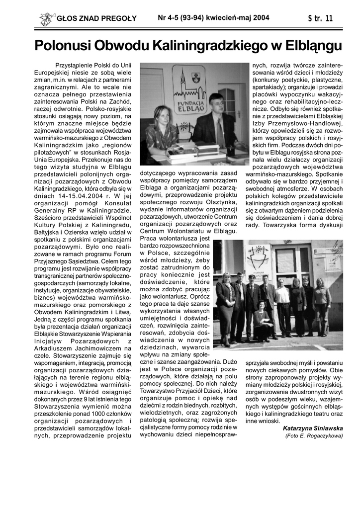 GŁOS ZNAD PREGOŁY Nr 4-5 (93-94) kwiecień-maj 2004 Str. 11 Polonusi Obwodu Kaliningradzkiego w Elbląngu Przystąpienie Polski do Unii Europejskiej niesie ze sobą wiele zmian, m.in. w relacjach z partnerami zagranicznymi. Ale to wcale nie oznacza pełnego przestawienia zainteresowania Polski na Zachód, raczej odwrotnie. Polsko-rosyjskie stosunki osiągają nowy poziom, na którym znaczne miejsce będzie zajmowała współpraca województwa warmińsko-mazurskiego z Obwodem Kaliningradzkim jako „regionów pilotażowych” w stosunkach RosjaUnia Europejska. Przekonuje nas do tego wizyta studyjna w Elblągu przedstawicieli polonijnych organizacji pozarządowych z Obwodu Kaliningradzkiego, która odbyła się w dni ach 14-15.04.2004 r. W jej organizacji pomógł Konsulat Generalny RP w Kaliningradzie. Sześcioro przedstawicieli Wspólnot Kultury Polskiej z Kaliningradu, Bałtyjska i Ozierska wzięło udział w spotkaniu z polskimi organizacjami pozarządowymi. Było ono realizowane w ramach programu Forum Przyjaznego Sąsiedztwa. Celem tego programu jest rozwijanie współpracy transgranicznej partnerów społecznogospodarczych (samorządy lokalne, instytucje, organizacje obywatelskie, biznes) województwa warmińskomazurskiego oraz pomorskiego z Obwodem Kaliningradzkim i Litwą. Jedną z części programu spotkania była prezentacja działań organizacji Elbląskie Stowarzyszenie Wspierania Ini cjatyw Pozarządowych z Arkadiuszem Jachimowiczem na czele. Stowarzyszenie zajmuje się wspomaganiem, integracją, promocją organizacji pozarządowych działających na terenie regionu elbląskiego i województwa warmińskimazurskiego. W śród osiągnięć dokonanych przez 9 lat istnienia tego Stowarzyszenia wymienić można przeszkolenie ponad 1000 członków organizacji pozarządowych i przedstawicieli samorządów lokalnych, przeprowadzenie projektu dotyczącego wypracowania zasad współpracy pomiędzy samorządem Elbląga a organizacjami pozarządowymi, przeprowadzenie projektu społecznego rozwoju Olsztynka, wydanie informatorów organizacji pozarządowych, utworzenie Centrum organizacji pozarządowych oraz Centrum Wolontariatu w Elblągu. Praca wolontariusza jest bardzo rozpowszechniona w Polsce, szczególnie wśród młodzieży, żeby zostać zatrudnionym do pracy koniecznie j est doświadczeni e, kt óre można zdobyć pracując jako wolontariusz. Oprócz tego praca ta daje szanse wykorzystania własnych umiejętności i doświadczeń, rozwinięcia zainteresowań, zdobycia doświadczenia w nowych dziedzinach, wywarcia wpływu na zmiany społeczne i szanse zaangażowania. Dużo jest w Polsce organizacji pozarządowych, które działają na polu pomocy społecznej. Do nich należy Towarzystwo Przyjaciół Dzieci, które organizuje pomoc i opiekę nad dziećmi z rodzin biednych, rozbitych, wielodzietnych, oraz zagrożonych patologią społeczną; rozwija specjalistyczne formy pomocy rodzinie w wychowaniu dzieci niepełnospraw- nych, rozwija twórcze zainteresowania wśród dzieci i młodzieży (konkursy poetyckie, plastyczne, spartakiady); organizuje i prowadzi placówki wypoczynku wakacyjnego oraz rehabilitacyjno-lecznicze. Odbyło się również spotkanie z przedstawicielami Elbląskiej Izby Przemysłowo-Handlowej, którzy opowiedzieli się za rozwojem współpracy polskich i rosyjskich firm. Podczas dwóch dni pobytu w Elblągu rosyjska strona poznała wielu działaczy organizacji pozarządowych województwa warmińsko-mazurskiego. Spotkanie odbywało się w bardzo przyjemnej i swobodnej atmosferze. W osobach polskich kolegów przedstawiciele kaliningradzkich organizacji spotkali się z otwartym dążeniem podzielenia się doświadczeniem i dania dobrej rady. Towarzyska forma dyskusji sprzyjała swobodnej myśli i powstaniu nowych ciekawych pomysłów. Obie strony zaproponowały projekty wymiany młodzieży polskiej i rosyjskiej, zorganizowania dwustronnych wizyt osób w podeszłym wieku, wzajemnych występów gościnnych elbląskiego i kaliningradzkiego teatru oraz inne wnioski. Katarzyna Siniawska (Foto E. Rogaczykowa)