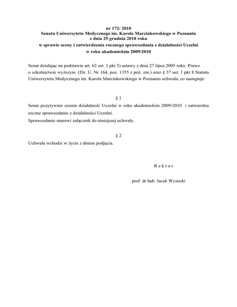 nr 172/ 2010 Senatu Uniwersytetu Medycznego im. Karola Marcinkowskiego w Poznaniu z dnia 29 grudnia 2010 roku w sprawie oceny i zatwierdzenia rocznego sprawozdania z działalności Uczelni w roku akademickim 2009/2010 Senat działając na podstawie art. 62 ust. 1 pkt 5) ustawy z dnia 27 lipca 2005 roku Prawo o szkolnictwie wyższym (Dz. U. Nr 164, poz. 1355 z póź. zm.) oraz § 37 ust. 1 pkt 8 Statutu Uniwersytetu Medycznego im. Karola Marcinkowskiego w Poznaniu uchwala, co następuje: §1 Senat pozytywnie ocenia działalność Uczelni w roku akademickim 2009/2010 i zatwierdza roczne sprawozdanie z działalności Uczelni. Sprawozdanie stanowi załącznik do niniejszej uchwały. §2 Uchwała wchodzi w życie z dniem podjęcia. Rektor prof. dr hab. Jacek Wysocki SPRAWOZDANIE Z DZIAŁALNOŚCI UNIWERSYTETU MEDYCZNEGO im. KAROLA MARCINKOWSKIEGO W POZNANIU W ROKU AKADEMICKIM 2009/2010 Rok akademicki 2009/2010 to rok jubileuszy, ważnych dla naszej Uczelni. W dniach 17-18 czerwca 2010 obchodzono uroczystość 90-lecia Wydziału Farmaceutycznego. Z tej okazji odbyła się Konferencja Naukowa ,,Postęp w ocenie jakości substancji i produktów leczniczych”. Natomiast w dniach 25-26 czerwca 2010 roku swoje XXXV-lecie obchodził Wydział Nauk o Zdrowiu. Odbyła się Międzynarodowa Konferencja Naukowa „Wyzwania naukowe i dydaktyczno-organizacyjne Wydziałów Nauk o Zdrowiu w Polsce”. W obu uroczystościach udział wzięło wielu zaproszonych gości, zarówno z kraju jak i z zagranicy. Rok akademicki 2009/2010 to również rok, w którym prowadzono szereg inwestycji o kluczowym znaczeniu dla Uczelni. Dzięki funduszom z Unii Europejskiej kontynuowano prace przy budowie Uniwersyteckiego Centrum Biologii Medycznej. Wyremontowano i wyposażono 10 sal dydaktycznych.. Swoja nową siedzibę otrzymało Studium Języków Obcych. W okresie wakacyjnym Biblioteka Główna przeniosła się do Centrum KongresowoDydaktycznego, aby z początkiem nowego roku akademickiego rozpocząć działalność w nowocześnie wyposażonych pomieszczeniach. Powstał nowy dom studencki „Karolek”, który został oddany do użytku z początkiem roku akademickiego 2010/2011. Z Agencji Nieruchomości Rolnych Uczelnia otrzymała działkę przy ul. Karpia o powierzchni 7ha przeznaczoną na budowę obiektów dydaktycznonaukowych dla Wydziału Farmaceutycznego i Wydziału Nauk o Zdrowiu. Sprawozdanie zawiera główne elementy działalności dydaktycznej, szkoleniowej, naukowej, finansowej, wydawniczej i inwestycyjnej Uniwersytetu Medycznego im. Karola Marcinkowskiego w Poznaniu w roku akademickim 2009/2010. KSZTAŁCENIE W roku akademickim 2009/2010 na czterech wydziałach i jedenastu kierunkach studiów stacjonarnych oraz dziewięciu kierunkach studiów niestacjonarnych kształciło się łącznie studentów: 8170 w tym: - Polaków na studiach stacjonarnych - 4580 - Polaków na studiach niestacjonarnych - 2560 - obcokrajowców - 1030 ( w tym 989 odbywających studia w j. angielskim) Liczbę studentów na poszczególnych kierunkach przedstawia tabela nr 1. Tabela nr 1 Liczba studiujących na poszczególnych kierunkach ( dane statystyczne dla na dzień 30.11.2009) Kierunek studiów Studia stacjonarne Studia niestacjonarne Lekarski 1231 233 CNJA 677 - Inni obcokrajowcy 25 - Lekarsko-Dentystyczny 364 116 CNJA 274 - 9 - 44 37 I stopnia 38 - II stopnia 25 - magisterskie 19 - Farmacja 777 78 CNJA 28 - Inni obcokrajowcy Techniki dentystyczne Studia I stopnia Biotechnologia Inni obcokrajowcy Analityka medyczna 5 - 158 Kosmetologia Studia I stopnia 72 Studia II stopnia 93 160 Pielęgniarstwo Studia I stopnia 234 304 Studia II stopnia 151 436 Studia I stopnia 206 34 Studia II stopnia 155 228 Studia I stopnia 213 126 Studia II stopnia 124 151 Położnictwo Zdrowie Publiczne Inni obcokrajowcy 1 Fizjoterapia Studia I stopnia 252 175 Studia II stopnia 144 194 CNJA 10 - Inni obcokrajowcy 2 - Studia I stopnia 133 3 Studia II stopnia 31 Dietetyka Ratownictwo medyczne I stopnia 113 113 Studia I stopnia 85 61 Studia II stopnia 11 17 Elektroradiologia RAZEM 5610 2560 W roku akademickim 2009/2010 studia ukończyło: 324 lekarzy w tym: - 109 osoby studiujące w języku angielskim: w programie 4-letnim - 70 w programie 6-letnim - 39 4 obcokrajowców 127 lekarzy dentystów w tym: - 39 osoby studiujące w języku angielskim w programie 5 letnim 144 magistrów farmacji w tym: - 5 osób studiujących w języku angielskim w programie 5-letnim farmacja 3 obcokrajowców 29 magistrów analityki medycznej Studia stacjonarne I stopnia 14 osób z tytułem licencjata - biotechnologia 34 osób z tytułem licencjata - dietetyka 28 osób z tytułem licencjata - elektroradiologia 77 osób z tytułem licencjata - pielęgniarstwo 60 osób z tytułem licencjata - położnictwo 65 osoby z tytułem licencjata - fizjoterapia 39 osób z tytułem licencjata – zdrowie publiczne 31 osób z tytułem licencjata – ratownictwo medyczne 13 osób z tytułem licencjata – techniki dentystyczne 6 osób z tytułem licencjata – zdrowie publiczne, specj. higiena dentystyczna 11 osoby z tytułem licencjata - kosmetologia Studia niestacjonarne I stopnia 6 osób z tytułem licencjata – elektroradiologia 182 osób z tytułem licencjata – pielęgniarstwo 50 osoby z tytułem licencjata – fizjoterapia 33 osób z tytułem licencjata – położnictwo 31 osób z tytułem licencjata – zdrowie publiczne 31 osób z tytułem licencjata – ratownictwo medyczne 7 osób z tytułem licencjata – techniki dentystyczne 23 osób z tytułem licencjata - kosmetologia Studia stacjonarne II stopnia 11 magistrów biotechnologii 65 magistrów fizjoterapii 46 magistrów zdrowia publicznego 63 magistrów pielęgniarstwa 53 magistrów położnictwa Studia niestacjonarne II stopnia 44 magistrów kosmetologii 89 magistrów pielęgniarstwa 66 magistrów fizjoterapii 55 magistrów zdrowia publicznego 60 magistrów położnictwa Łącznie absolwentów - 1917 Pomoc stypendialna W roku akademickim 2009/20