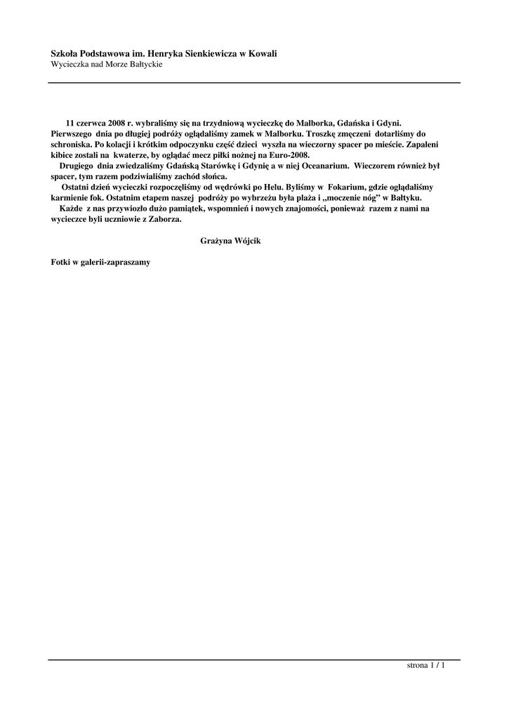 Szkoła Podstawowa im. Henryka Sienkiewicza w Kowali Wycieczka nad Morze Bałtyckie 11 czerwca 2008 r. wybraliśmy się na trzydniową wycieczkę do Malborka, Gdańska i Gdyni. Pierwszego dnia po długiej podróży oglądaliśmy zamek w Malborku. Troszkę zmęczeni dotarliśmy do schroniska. Po kolacji i krótkim odpoczynku część dzieci wyszła na wieczorny spacer po mieście. Zapaleni kibice zostali na kwaterze, by oglądać mecz piłki nożnej na Euro-2008. Drugiego dnia zwiedzaliśmy Gdańską Starówkę i Gdynię a w niej Oceanarium. Wieczorem również był spacer, tym razem podziwialiśmy zachód słońca. Ostatni dzień wycieczki rozpoczęliśmy od wędrówki po Helu. Byliśmy w Fokarium, gdzie oglądaliśmy karmienie fok. Ostatnim etapem naszej podróży po wybrzeżu była plaża i „moczenie nóg” w Bałtyku. Każde z nas przywiozło dużo pamiątek, wspomnień i nowych znajomości, ponieważ razem z nami na wycieczce byli uczniowie z Zaborza. Grażyna Wójcik Fotki w galerii-zapraszamy strona 1 / 1