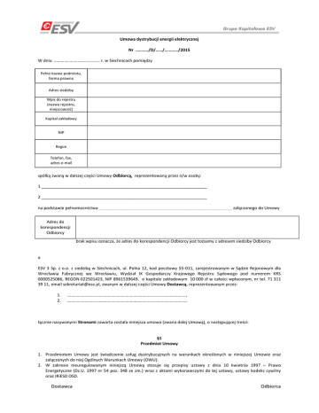 Umowa dystrybucji energii elektrycznej Nr ………../D/……/…………/2015 W dniu ………………………………….. r. w Siechnicach pomiędzy Pełna nazwa podmiotu, forma prawna Adres siedziby Wpis do rejestru (nazwa rejestru, miejscowość) Kapitał zakładowy NIP Regon Telefon, fax, adres e-mail spółką zwaną w dalszej części Umowy Odbiorcą, reprezentowaną przez n/w osoby: 1 _____________________________________________________________________ 2 _____________________________________________________________________ na podstawie pełnomocnictwa ………………………………………………......................................................…………………….…………………………………… załączonego do Umowy Adres do korespondencji Odbiorcy brak wpisu oznacza, że adres do korespondencji Odbiorcy jest tożsamy z adresem siedziby Odbiorcy a ESV 3 Sp. z o.o. z siedzibą w Siechnicach, ul. Polna 12, kod pocztowy 55-011, zarejestrowanym w Sądzie Rejonowym dla Wrocławia Fabrycznej we Wrocławiu, Wydział IX Gospodarczy Krajowego Rejestru Sądowego pod numerem KRS 0000525086, REGON 022501423, NIP 8961539649, o kapitale zakładowym 10 000 zł w całości wpłaconym, nr tel. 71 311 39 11, email [email protected], zwanym w dalszej części Umowy Dostawcą, reprezentowanym przez: 1. 2. …………………………………………………………………………………………….., …………………………………………………………………………………………….., łącznie nazywanymi Stronami zawarta została niniejsza umowa (zwana dalej Umową), o następującej treści: §1 Przedmiot Umowy 1. Przedmiotem Umowy jest świadczenie usług dystrybucyjnych na warunkach określonych w niniejszej Umowie oraz załączonych do niej Ogólnych Warunkach Umowy (OWU). 2. W zakresie nieuregulowanym niniejszą Umową stosuje się przepisy ustawy z dnia 10 kwietnia 1997 – Prawo Energetyczne (Dz.U. 1997 nr 54 poz. 348 ze zm.) wraz z aktami wykonawczymi do tej ustawy, ustawy kodeks cywilny oraz IRiESD OSD. Dostawca Odbiorca 3. Integralną część Umowy stanowi Taryfa Dostawcy oraz OWU. 4. Umowa przeznaczona jest dla Odbiorców niebędących konsumentami. §2 Oświadczenia Stron 1.Dostawca oświadcza że: a) jako dostawca usług dystrybucji posiada ważną koncesję na dystrybucję energii elektrycznej, b) zobowiązuje się do świadczenia usługi dystrybucyjnej na rzecz Odbiorcy do zasilania obiektu wymienionego w ust. 2 pkt b) do miejsc dostarczania określonych w §3 ust.1., c) zobowiązuje się do realizacji umów sprzedaży energii elektrycznej zawartych przez Odbiorcę z wybranym przez siebie Sprzedawcą, którym będzie każdorazowo ten podmiot, który dokona powiadomienia OSD o zawarciu umowy sprzedaży z Odbiorcą, zarówno w imieniu własnym, jak i w imieniu Odbiorcy, d) Operatorem Systemu Dystrybucyjnego (OSD) właściwym dla sieci, do której przyłączony jest Odbiorca, jest Przedsiębiorstwo Energetyczne ESV S.A., zwane dalej OSD. 2.Odbiorca oświadcza, że: *) a) przedłożony wyciąg z rejestru przedsiębiorców / wypis z ewidencji działalności gospodarczej jest aktualny na dzień zawarcia Umowy, b) posiada tytuł prawny, wynikający z __________________________________________ do obiektu _____________________________________________ , w którym będzie korzystać z energii elektrycznej oraz że ww. tytuł prawny w chwili zawarcia niniejszej Umowy jest ważny, c) zobowiązuje się do niezwłocznego poinformowania OSD o zmianie stanu prawnego lub faktycznego w zakresie określonym w pkt b) i przyjmuje do wiadomości, że brak poinformowania Dostawcy może być traktowany jako naruszenie warunków Umowy, d) planuje pobór energii elektrycznej w celu zasilania obiektu wymienionego w punkcie b) w ilości __________ kWh rocznie, e) otrzymał i zapoznał się z cenami i stawkami opłat za usługi dystrybucyjne, zawartymi w Taryfie Dostawcy, f) zapoznał się z Ogólnymi Warunkami Umowy (OWU), Taryfą oraz Instrukcją Ruchu i Eksploatacji Sieci Dystrybucyjnej (IRiESD) Operatora pełniącego funkcję OSD na sieci, do której przyłączony jest Odbiorca, g) przyjmuje do wiadomości, że aktualna treść Taryf, IRiESD znajduje się na stronie internetowej: www.esv.pl, h) podmiotem odpowiedzialnym za bilansowanie handlowe Odbiorcy jest podmiot wskazany przez Sprzedawcę, i) posiada/nie posiada* koncesji na wytwarzanie, przesyłanie, dystrybucję lub obrót energią elektryczną w rozumieniu ustawy z dnia 10 kwietnia 1997 r. – Prawo energetyczne (Dz. U. 2002 r. poz. 1059 oraz z 2013 r. poz. 984 i 1238) oraz będzie/nie będzie* samodzielnie odprowadzał podatku akcyzowego, o którym mowa w art. 9 ustawy z dnia 6 grudnia 2008 r. o podatku akcyzowym (Dz.U. 2009 nr 3 poz. 11 ze zm.), j) Odbiorca wskazuje Sprzedawcę rezerwowego i upoważnia OSD do zawarcia, w imieniu i na rzecz Odbiorcy, umowy sprzedaży energii elektrycznej ze Sprzedawcą rezerwowym wskazanym w Umowie, na warunkach i zasadach określonych przez tego Sprzedawcę rezerwowego, chyba że Odbiorca inaczej określi te warunki. Podmiot ten będzie odpowiedzialny za sprzedaż energii elektrycznej w przypadku zaprzestania dostarczania energii elektrycznej przez Sprzedawcę. §3 Uwarunkowania techniczne realizacji przedmiotu umowy 1. Dostawca zobowiązuje się do świadczenia usług dystrybucji energii elektrycznej do przyłączy opisanych w „Załączniku nr 2”. 2. Odbiorca zostaje zakwalifikowany do grupy przyłączeniowej: …. 3. Odbiorca zostaje zakwalifikowany do grupy taryfowej …… §4 Rozliczenia między Stronami 1. Rozliczenia między Stronami w zakresie świadczenia usług dystrybucji energii elektrycznej będą odbywać się wg stawek opłat dla grupy taryfowej, o której mowa w §3 pkt. 3 Umowy, zgodnie z Taryfą Dostawcy zatwierdzoną przez Prezesa Urzędu Regulacji Energetyki i wprowadzaną zgodnie z przepisami prawa. 2. Szczegółowe zas