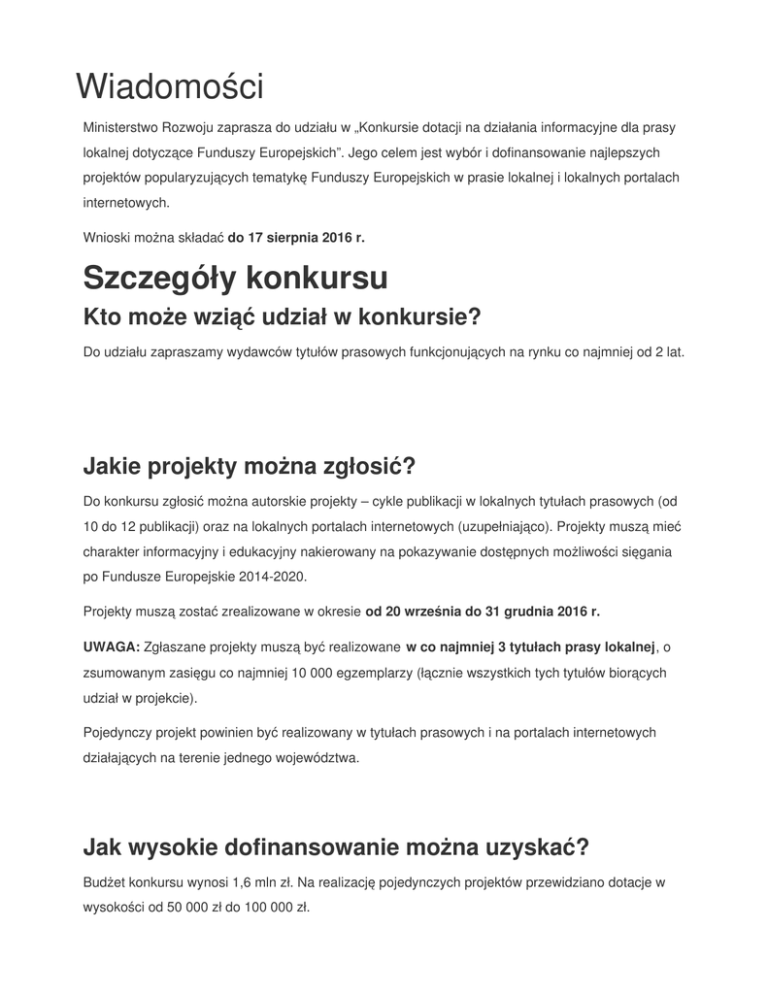 Wiadomości Ministerstwo Rozwoju zaprasza do udziału w „Konkursie dotacji na działania informacyjne dla prasy lokalnej dotyczące Funduszy Europejskich”. Jego celem jest wybór i dofinansowanie najlepszych projektów popularyzujących tematykę Funduszy Europejskich w prasie lokalnej i lokalnych portalach internetowych. Wnioski można składać do 17 sierpnia 2016 r. Szczegóły konkursu Kto może wziąć udział w konkursie? Do udziału zapraszamy wydawców tytułów prasowych funkcjonujących na rynku co najmniej od 2 lat. Jakie projekty można zgłosić? Do konkursu zgłosić można autorskie projekty – cykle publikacji w lokalnych tytułach prasowych (od 10 do 12 publikacji) oraz na lokalnych portalach internetowych (uzupełniająco). Projekty muszą mieć charakter informacyjny i edukacyjny nakierowany na pokazywanie dostępnych możliwości sięgania po Fundusze Europejskie 2014-2020. Projekty muszą zostać zrealizowane w okresie od 20 września do 31 grudnia 2016 r. UWAGA: Zgłaszane projekty muszą być realizowane w co najmniej 3 tytułach prasy lokalnej, o zsumowanym zasięgu co najmniej 10 000 egzemplarzy (łącznie wszystkich tych tytułów biorących udział w projekcie). Pojedynczy projekt powinien być realizowany w tytułach prasowych i na portalach internetowych działających na terenie jednego województwa. Jak wysokie dofinansowanie można uzyskać? Budżet konkursu wynosi 1,6 mln zł. Na realizację pojedynczych projektów przewidziano dotacje w wysokości od 50 000 zł do 100 000 zł. Jaka powinna być tematyka projektów? W konkursie mogą uzyskać dofinansowanie jedynie projekty o charakterze informacyjnym i edukacyjnym (poradnikowym). W Regulaminie konkursu określono tematy związane z Funduszami Europejskimi, które należy uwzględnić w ramach projektu. Do kiedy należy złożyć wniosek? Formularze wniosków o przyznanie dotacji wraz z załącznikami można składać do 17 sierpnia 2016 r. (za datę wpływu wniosku uznawana jest data jego wpłynięcia do Kancelarii Głównej Ministerstwa Rozwoju). UWAGA: Wniosek należy wypełnić na formularzu, stanowiącym załącznik nr 1 do Regulaminu konkursu. Należy dołączyć do niego także odpis z właściwego rejestru, szczegółowy kosztorys projektu, próbkę materiału prasowego oraz po jednym wydaniu każdego z tytułów prasowych, które mają być objęte projektem. Wniosek składa się w wersji papierowej w jednym egzemplarzu, do którego należy również dołączyć identyczną wersję elektroniczną (na CD lub pendrivie). UWAGA: Wniosek należy złożyć osobiście, pocztą lub kurierem. Wnioski złożone w inny sposób (emailem, faksem) nie będą rozpatrywane. Jak będą oceniane wnioski? Wnioski będą oceniane pod kątem formalnym, merytorycznym i budżetowym, wg kryteriów wskazanych w Karcie Oceny Projektu. Stanowi ona załącznik do Regulaminu konkursu. UWAGA: Szczegółowe zasady ubiegania się o dotacje w konkursie określa zamieszczony poniżej Regulamin Konkursu. Informacje dodatkowe Dodatkowe pytania dotyczące konkursu można zgłaszać pocztą elektroniczną na adres: [email protected] (odpowiedzi na pytania mailowe będą publikowane sukcesywnie na Portalu Funduszy Europejskich w zakładce: Dowiedz się więcej o Funduszach Europejskich/ Weź udział w promocji Funduszy Europejskich/ Współpraca z mediami i partnerami społecznogospodarczymi). Spotkanie informacyjne Na początku sierpnia planowane jest spotkanie informacyjne, podczas którego zostanie szczegółowo omówiony zakres i tematyka projektów, jakie mogą uzyskać wsparcie w konkursie oraz kwestie związane z opracowaniem wniosku i późniejszą realizacją dofinansowanego przedsięwzięcia. Spotkanie odbędzie się w Ministerstwie Rozwoju. Szczegółowe informacje na jego temat, w tym termin, zostaną opublikowane w najbliższych dniach. Pliki do pobrania Regulamin konkursu dotacji dla prasy lokalnej na działania informacyjne dotyczące Funduszy Europejskich (PDF 124 KB). Załączniki do regulaminu konkursu: 1. Formularz wniosku o przyznanie dotacji (DOCX 74 KB) 2. Karta oceny projektu: a) Załącznik 2.1. – Karta oceny formalnej (PDF 36 KB) b) Załącznik 2.2. – Karta oceny merytorycznej (PDF 46 KB) c) Załącznik 2.3. – Karta oceny budżetowej (PDF 43 KB) 3. Wzór umowy dotacyjnej (PDF 91 KB) 4. Wzór sprawozdania z realizacji zadania publicznego (PDF 62 KB) 5. Regulamin pracy Komisji Konkursowej (PDF 48 KB) 6. Wzór wizualizacji (PDF 93 KB).