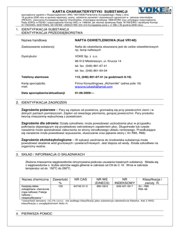 KARTA CHARAKTERYSTYKI SUBSTANCJI sporz dzona zgodnie z Rozporz dzeniem (WE) 1907/2006 Parlamentu Europejskiego i Rady z dnia 18 grudnia 2006 roku w sprawie rejestracji, oceny, udzielania zezwole i stosowanych ogranicze w zakresie chemikaliów (REACH), utworzenia Europejskiej Agencji Chemikaliów, zmieniaj ce dyrektyw 1999/45/WE oraz uchylaj ce rozporz dzenie Rady (EWG) nr793/93 i rozporz dzenie Komisji (WE) nr 1488/94, jak równie dyrektyw Rady 76/769/EWG i dyrektywy Komisji 91/155/EWG, 93/67/EWG, 93/105/WE i 2000/21/WE (DU Unii Europejskiej seria L nr 396 z 30 grudnia 2006 roku) 1. IDENTYFIKACJA SUBSTANCJI IDENTYFIKACJA PRZEDSI BIORSTWA Nazwa handlowa NAFTA O WIETLENIOWA (Kod VR140) Zastosowanie substancji Nafta do o wietlania stosowana jest do celów o wietleniowych np. lamp naftowych Dystrybutor VOKE Sp. z o.o. 96-512 Młodzieszyn, ul. Krucza 14 tel. fax (046) 861-67-41 tel. fax. (046) 861-64-04 Telefony alarmowe 112, (046) 861-67-41 (w godzinach 8-16) Kart sporz dziła: mail: Firma Konsultingowa „Alchemikk” (adres pole 16) [email protected] Data sporz dzenia/aktualizacji 01-06-2009/--- 2. IDENTYFIKACJA ZAGRO E Zagro enie po arowe – Pary s ci sze od powietrza, gromadz si przy powierzchni ziemi i w dolnych partiach pomieszcze . Zapłon od otwartego płomienia, gor cej powierzchni. Pary produktu tworz mieszanin wybuchow z powietrzem. Zagro enie dla zdrowia: Działa szkodliwie; mo e powodowa uszkodzenie płuc w przypadku połkni cia objawiaj cym si przykładowo oskrzelowym zapaleniem płuc. Długotrwałe lub cz ste nara enie mo e spowodowa zaburzenia ze strony o rodkowego układu nerwowego. Przedłu aj ce si nara enie mo e powodowa wysuszanie, złuszczanie oraz p kanie skóry ( Xn R65, R66) Zagro enie ekotoksykologiczne – W sytuacji uwolnienia do rodowiska substancja mo e powodowa ska enie wód gruntowych i powierzchniowych. Jest l ejsza od wody. Działa szkodliwie na organizmy wodne. 3. SKŁAD / INFORMACJA O SKŁADNIKACH Zło ona mieszanina w glowodorów otrzymywana podczas usuwania kwa nych substancji. Składa si z w glowodorów o liczbie atomów w gla głównie w zakresie od C9 do C 16 . Wrze w zakresie o o temperatur od ok. 150 C do 290 C. Nazwa chemiczna Destylaty lekkie zoboj tniane chemicznie (ropa naftowa); Frakcja naftowa – niespecyfikowana * Zawarto % NR CAS 100 64742-31-0 NR WE (EINECS) 265-132-5 ! "## ! "# + 4. PIERWSZA POMOC ,- .& NR INDEKSOWY 649-421-00-7 "# $" % Klasyfikacja i zwroty R. Xn – R65 R52- 66 &' & (%)* Wskazówki ogólne Nie prowokowa wymiotów i nie podawa niczego doustnie osobie nieprzytomnej. Pokaza personelowi medycznemu udzielaj cemu pomocy opakowanie, etykiet lub kart charakterystyki.. Po wdychaniu Poszkodowanego usun (wyprowadzi /wynie ) z miejsca nara enia na wie e powietrze; zapewni spokój i ciepło. Nieprzytomnego uło y w pozycji bocznej ustalonej, kontrolowa i utrzymywa dro no dróg oddechowych. W przypadku zaburze w oddychaniu podawa tlen, w przypadku braku oddechu stosowa sztuczne oddychanie. W przypadku utraty przytomno ci, zaburze oddychania lub złego samopoczucia zapewni pomoc lekarsk . Unika oddychania metod usta-usta ze wzgl du na niebezpiecze stwo dla ratuj cego nara enia go na pary produktu wydostaj ce si z dróg oddechowych poszkodowanego. Kontakt ze skór Zdj zanieczyszczon odzie . Zanieczyszczon skór dokładnie umy wod z mydłem, a nast pnie spłuka wod . W przypadku utrzymuj cych lub nasilaj cych si objawów podra nienia skonsultowa si z lekarzem. Kontakt z oczami Usun szkła kontaktowe (je li s ). Zanieczyszczone oczy płuka ci głym strumieniem wody przez kilkana cie minut. Podczas płukania trzyma powieki szeroko rozwarte i porusza gałk oczn . W przypadku utrzymuj cych lub nasilaj cych si objawów podra nienia skonsultowa si z lekarzem. UWAGA: Nie stosowa zbyt silnego strumienia wody aby nie uszkodzi rogówki. W przypadku połkni cia Nie prowokowa wymiotów. Osobie przytomnej, poda natychmiast do wypicia 150 - 200 ml płynnej parafiny. Nie podawa mleka, tłuszczów, alkoholu. W przypadku wyst pienia duszno ci podawa tlen do oddychania. Natychmiast zapewni pomoc lekarsk . 5. POST POWANIE W PRZYPADKU PO ARU Zalecane rodki ga nicze Rozpylona woda, dwutlenek w gla, proszki ga nicze, piany. rodki ga nicze, których nie wolno stosowa ze wzgl dów bezpiecze stwa Zwarty strumie wody. Szczególne zagro enia zwi zane z nara eniem wynikaj cym z wła ciwo substancji lub ze strony produktów spalania, powstaj cych gazów Pary tworz z powietrzem mieszaniny wybuchowe. Zamkni te pojemniki nara one na działanie ognia lub wysokiej temperatury mog eksplodowa w wyniku wzrostu ci nienia wewn trz nich. W razie po aru mog uwalnia si nast puj ce produkty spalania: Dwutlenek w gla, (CO2). Tlenek w gla, (CO). rodki ochrony indywidualnej dla stra aków Nosi izolacyjne aparaty oddechowe z niezale nym ródłem powietrza i kombinezony ochronne. Inne uwagi Je eli pozwalaj na to wzgl dy bezpiecze stwa usun nieuszkodzone pojemniki z rejonu po aru. Pojemniki zagro one po arem chłodzi rozpylon wod . Wody nie kierowa bezpo rednio do pojemników i zapobiega nadmiernemu tworzeniu si piany. W przypadku po aru obejmuj cego du e ilo ci produktu, usn z obszaru zagro enia wszystkie osoby postronne. Po ar gasi z bezpiecznej odległo ci lub zza osłon. Wezwa ekipy ratownicze. Nafta o wietleniowa Kod produktu VR140 Wydanie z dnia 01-06-2009 Strona 2 z 9 6. POST POWANIE W PRZYPADKU NIEZAMIERZONEGO UWOLNIENIA DO RODOWISKA Indywidualne rodki ostro no ci Przestrzega przepisów BHP obowi zuj cych przy pracy z niebezpiecznymi substancjami chemicznymi – patrz tak e punkt 7 i 8. Unika zanieczyszczenia oczu, skóry i odzie y oraz wdychania substancji. Zapewni odpowiedni wentylacj . Usun efektywne ródła zapłonu – obszar rozlewiska jest obszarem zagro onym wybuchem. Pary mog przemieszcza si wzdłu podłogi/ gruntu do odległych ródeł zapłonu i stwarza zagro enie spowodowane cofaj cym si płomieniem. Pary rozcie cza rozproszonym strumieniem wody. rodki ostro no ci