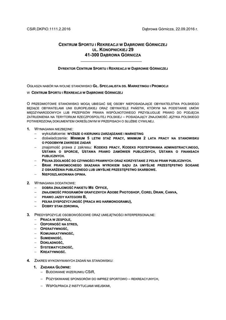 Dąbrowa Górnicza, 22.09.2016 r. CSiR.DKPiO.1111.2.2016 CENTRUM SPORTU I REKREACJI W DĄBROWIE GÓRNICZEJ UL. KONOPNICKIEJ 29 41-300 DĄBROWA GÓRNICZA _____________________________ DYREKTOR CENTRUM SPORTU I REKREACJI W DĄBROWIE GÓRNICZEJ OGŁASZA NABÓR NA WOLNE STANOWISKO GŁ. SPECJALISTA DS. M ARKETINGU I PROMOCJI W CENTRUM SPORTU I REKREACJI W DĄBROWIE GÓRNICZEJ O PRZEDMIOTOWE STANOWISKO MOGĄ UBIEGAĆ SIĘ OSOBY NIEPOSIADAJĄCE OBYWATELSTWA POLSKIEGO BĘDĄCE OBYWATELAMI UNII EUROPEJSKIEJ ORAZ OBYWATELE PAŃSTW, KTÓRYM NA PODSTAWIE UMÓW MIĘDZYNARODOWYCH LUB PRZEPISÓW PRAWA WSPÓLNOTOWEGO PRZYSŁUGUJE PRAWO DO PODJĘCIA ZATRUDNIENIA NA TERYTORIUM RZECZPOSPOLITEJ POLSKIEJ – POSIADAJĄCY ZNAJOMOŚĆ JĘZYKA POLSKIEGO POTWIERDZONĄ DOKUMENTEM OKREŚLONYM W PRZEPISACH O SŁUŻBIE CYWILNEJ. 1. W YMAGANIA NIEZBĘDNE: wykształcenie: WYŻSZE O KIERUNKU ZARZĄDZANIE I MARKETING doświadczenie: MINIMUM 5 LETNI STAŻ PRACY, MINIMUM 2 LATA PRACY NA STANOWISKU O PODOBNYM ZAKRESIE ZADAŃ znajomość prawa z zakresu: KODEKS PRACY, KODEKS POSTEPOWANIA ADMINISTRACYJNEGO, USTAW A O SPORCIE, USTAW A PRAWO ZAMÓWIEŃ PUBLICZNYCH, USTAW A O FINANSACH PUBLICZNYCH. PEŁNA ZDOLNOŚĆ DO CZYNNOŚCI PRAWNYCH ORAZ KORZYSTANIE Z PEŁNI PRAW PUBLICZNYCH. BRAK PRAWOMOCNEGO SKAZANIA WYROKIEM SĄDU ZA UMYŚLNE PRZESTĘPSTWO ŚCIGANE Z OSKARŻENIA PUBLICZNEGO LUB UMYŚLNE PRZESTĘPSTWO SKARBOWE. NIEPOSZLAKOW ANA OPINIA. 2. W YMAGANIA DODATKOWE: DOBRA ZNAJOMOŚĆ PAKIETU MS OFFICE, ZNAJOMOŚĆ PROGRAMÓW GRAFICZNYCH ADOBE PHOTOSHOP, COREL DRAW, CANVA, PRAWO JAZDY KATEGORII B, PEŁNA DYSPOZYCYJNOŚĆ (PRACA WG HARMONOGRAMU), DOBRY STAN ZDROWIA, 3. PREDYSPOZYCJE OSOBOWOŚCIOWE ORAZ UMIEJĘTNOŚCI INTERPERSONALNE: PRACA W ZESPOLE, ODPORNOŚĆ NA STRES, OPERATYWNOŚĆ, KOMUNIKATYWNOŚĆ, SUMIENNOŚĆ, DOKŁADNOŚĆ, SYSTEMATYCZNOŚĆ, KREATYWNOŚĆ. 4. ZAKRES WYKONYWANYCH ZADAŃ NA STANOWISKU: 1. ZADANIA GŁÓWNE: BUDOWANIE WIZERUNKU CSIR, POZYSKIWANIE SPONSORÓW DO IMPREZ SPORTOWO – REKREACYJNYCH, W SPÓŁPRACA Z INSTYTUCJAMI MIEJSKIMI, W SPÓŁPRACA ZE STOWARZYSZENIAMI ORAZ KLUBAMI SPORTOWYMI DZIAŁAJĄCYMI NA TERENIE GMINY, PROWADZENIE SPRAW ZWIĄZANYCH Z WYDATKAMI DZIAŁU W ZAKRESIE: DOKONYWANIA ROZPOZNANIA RYNKU I WYSZUKIWANIA OFERT NAJKORZYSTNIEJSZYCH DOSTAW CÓW, SPORZĄDZANIE DOKUMENTACJI ZWIĄZANEJ Z PROCEDURĄ WYBORU DOSTAWCY ZAMÓWIENIA, PRZYGOTOWANIE DOKUMENTACJI IMPREZ ORGANIZOWANYCH PRZEZ CSIR, OBSŁUGA STRONY INTERNETOWEJ ORAZ PORTALI SPOŁECZNOŚCIOWYCH CENTRUM SPORTU I REKREACJI, PRZYGOTOWYWANIE MATERIAŁÓW PROMOCYJNYCH, W SPÓŁPRACA Z AGENCJAMI REKLAMOWYMI, DRUKARNIAMI, BEZPOŚREDNIMI DOSTAW CAMI I WYKONAWCAMI W ZAKRESIE OFERT I REALIZACJI ZADAŃ ZLECONYCH, W SPÓŁPRACA PRZY PROJEKTOWANIU I KOORDYNACJA WEWNĘTRZNYCH MATERIAŁÓW GRAFICZNYCH (FOLDERÓW, ULOTEK, PLAKATÓW, ITP.), PRZYGOTOWYWANIE SPRAWOZDAŃ I NOTATEK SŁUŻBOWYCH ZE SPOTKAŃ Z KLIENTAMI, OBSŁUGA IMPREZ ORGANIZOWANYCH I WSPÓŁORGANIZOWANYCH PRZEZ CSIR. 2. ZADANIA POMOCNICZE: ZADANIA WSKAZANE PRZEZ BEZPOŚREDNIEGO PRZEŁOŻONEGO. 5. INFORMACJA O WARUNKACH PRACY NA DANYM STANOWISKU. PRACA PRZY MONITORZE KOMPUTEROWYM, STATYCZNE OBCIĄŻENIE UKŁADU MIĘŚNIOWO-SZKIELETOWEGO, OBCIĄŻENIE NARZĄDU WZORKU, KIEROWANIE SAMOCHODEM OSOBOWYM DO CELÓW SŁUŻBOWYCH, PRACA W WEEKENDY I ŚWIĘTA, KONIECZNOŚĆ PODEJMOWANIA WŁAŚCIWYCH I WIĄŻĄCYCH DECYZJI. 6. W SKAŹNIK ZATRUDNIENIA OSÓB NIEPEŁNOSPRAW NYCH: W miesiącu poprzedzającym datę upublicznienia ogłoszenia wskaźnik zatrudnienia osób niepełnosprawnych w CSiR w Dąbrowie Górniczej, w rozumieniu przepisów o rehabilitacji zawodowej i społecznej oraz zatrudnianiu osób niepełnosprawnych, jest niższy niż 6%. 7. W YMAGANE DOKUMENTY: list motywacyjny, CV z dokładnym opisem przebiegu pracy zawodowej, oryginał kwestionariusza osobowego dla osoby ubiegającej się o zatrudnienie, kserokopie świadectw pracy lub aktualne zaświadczenie z zakładu pracy (w przypadku pozostawania w zatrudnieniu), kserokopie dokumentów potwierdzające wykształcenie i kwalifikacje zawodowe, oświadczenie kandydata o braku skazania prawomocnym wyrokiem sądu za umyślne przestępstwo ścigane z oskarżenia publicznego lub umyślne przestępstwo skarbowe, oświadczenie kandydata, że w przypadku wyboru jego oferty zobowiązuje się on do niewykonywania zajęć tożsamych, pozostających w sprzeczności lub związanych z zajęciami, które będzie wykonywał w ramach obowiązków służbowych, wywołujących uzasadnione podejrzenie o stronniczość lub interesowność oraz zajęć sprzecznych z obowiązkami wynikającymi z ustawy, oświadczenie kandydata o posiadaniu pełnej zdolności do czynności prawnych oraz korzystaniu z pełni praw publicznych, oświadczenie kandydata o wyrażeniu zgody na przetwarzanie jego danych osobowych zawartych w ofercie pracy dla potrzeb rekrutacji, zgodnie z ustawą z dnia 29.08.1997 r. o ochronie danych osobowych (tekst jednolity Dz. U. 2016 r. poz. 922), dokument potwierdzający znajomość języka polskiego, zgodny z wymogami określonymi w przepisach o służbie cywilnej – w przypadku osób nie posiadających obywatelstwa polskiego, kserokopia dokumentu potwierdzającego niepełnosprawność – w przypadku osób niepełnosprawnych, którzy chcą skorzystać z uprawnienia, o którym mowa w art. 13a ust. 2 8. ustawy o pracownikach samorządowych (tekst jednolity Dz. U. z 2016 r. poz. 902) – nie dotyczy ogłoszeń o naborze na kierownicze stanowiska urzędnicze, oświadczenie o posiadaniu nieposzlakowanej opinii, inne dokumenty o posiadanych kwalifikacjach i umiejętnościach. Wymagane dokumenty aplikacyjne winny być własnoręcznie podpisane a złożone kserokopie dokumentów poświadczone własnoręcznym podpisem przez kandydata za zgodność z oryginałem i złożone osobiście lub doręczone listownie w terminie do dnia 05.10.2016 r. 30 godz. 15 pod adresem: Centrum Sportu i Rekreacji w Dąbrowie Górniczej ul. Konopnickiej 29 41-300 Dąbrowa Gór
