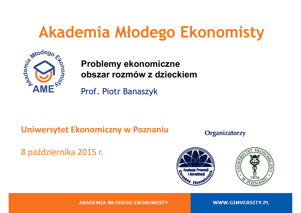Akademia Młodego Ekonomisty Problemy ekonomiczne obszar rozmów z dzieckiem Prof. Piotr Banaszyk Uniwersytet Ekonomiczny w Poznaniu 8 października 2015 r. Jak dziecko uczy się ? czyli co mówią pedagodzy • Uczenie się powinno sprawiać przyjemność ! • Doświadczenie co najmniej równoważne jak podręczniki ! • Doświadczenie powinno skłaniać do wnioskowania ! Edukacja ekonomiczna, czyli co ? • Nauki ekonomiczne starają się wyjaśnić, jak ograniczone zasoby używać w warunkach konkurencyjnych celów: • zasoby to wszystkie środki jakimi dysponujemy, by skutecznie realizować swe zamierzenia, • konkurencyjność celów oznacza, że koncentrując się na dążeniu do niektórych z nich, nie można realizować pozostałych. Diagnoza edukacji ekonomicznej dzieci wg NBP • Zakres diagnozy: wiedza ekonomiczna, umiejętności ekonomiczne, znajomość instytucji, znajomość pojęć. • Przedmiot badań: kończący szkoły podstawowe, gimnazja i licea, • Wnioski: • większość nisko ocenia swą edukację ekonomiczną, • test dowiódł, że ok. 40% dzieci ma wiedzę niedostateczną, ok. 30% dostateczną i ok. 3% bardzo dobrą. Ekonomia jest łatwa ! • • Kiedy postępuje się racjonalnie ekonomicznie ? • gdy jest się wydajnym, • gdy jest się oszczędnym. Zatem: • dzieci powinny umieć wykorzystywać swe zasoby jak najskuteczniej, • dzieci powinny umieć przeznaczać jak najmniej zasobów do realizacji konkretnego zadania. Jak się przygotować ? Prakseologiczna wytyczna cyklu organizacyjnego • Sprawnie działa ten, kto: • uświadamia sobie cele, • układa plan ich osiągnięcia, • gromadzi zasoby niezbędne do założonych celów, • działa wg planu, • kontroluje wyniki. Uświadomienie celu przez dziecko • Rola rodziców (dorosłych) - rozmowa z dzieckiem (sugestie) • jakie są potrzeby, • jaka jest hierarchia potrzeb, • co jest pierwszorzędne, a co można odłożyć na później. Planowanie • Jak osiągnąć preferowany cel ? • sytuacja wyboru oszczędzanie - pożyczanie gromadzić środki finansowe czy je pożyczyć ? • gromadzenie środków to oszczędzanie (np. odkładanie 3/4 potrzebnej sumy, resztę dołożą rodzice), • pożyczka to kredytowanie (np. rodzice przekazują niezbędną kwotę, ale oddać należy więcej). Gromadzenie środków • Oszczędzanie - ile odłożyć w ustalonych odcinkach czasu, aby osiągnąć cel lub • Oddawanie - ile zwracać pożyczkodawcy w ustalonych odcinkach czasu? • Nauka przedsiębiorczości (zaradności) - skąd czerpać środki (zarabianie) Kontrola • Ocena skuteczności, • Ocena zgodności z planem. Edukacja ekonomiczna • Dorosły tłumaczy dziecku na czym polega wybór celu i rezygnacja z pobocznych potrzeb, • Dorosły uświadamia dziecku wartość pieniądza i potrzebę gospodarowania nim, • Dorosły pokazuje dziecku znaczenie rozwiązań organizacyjnych i gospodarki finansowej. Zaawansowana edukacja • Budżet domowy to równanie całkowite przychody = całkowite wydatki odniesione do założonego odcinka czasu • Co składa się na przychody a co na wydatki (zapisywanie przychodów i wydatków może prowadzić do zaskakujących wniosków) • Problem oszczędności ! Oszczędności • Oszczędności mogą być źródłem finansowania wydatków (są przychodami), ale też mogą być wydatkami. • Oszczędzanie to rozumienie potęgi procentu składanego ! Procent składany • V = Vo (1+r)n V - wartość przyszła, Vo - wartość bieżąca, r - stopa procentowa, n - liczba lat Reguła 72 i Reguła 70 – reguły pozwalające aproksymować czas, który jest potrzebny by kapitał podwoił swą wartość (przy założeniu procentu składanego). Należy wówczas liczbę 70 (lub 72) podzielić przez wysokość rocznej stopy procentowej (wyrażonej w procentach). Reguła 70 pozwala na dobre przybliżenie dla niskich stóp procentowych (1-5%), podczas gdy dla wysokich stóp (5-10%) lepsze przybliżenie daje reguła 72. Kapitał podwaja się co ok. 35 lat. problem emerytur ! Kalkulator systematycznego oszczędzania Przy kapitale początkowym 0,00 zł odkładając co miesiąc 200,00 zł na rachunek z oprocentowaniem 5,00% i kapitalizacją roczną, po 35 latach uzbierasz: 185.781,20 zł Wpłacony kapitał to 84.000,00 zł a odsetki to 125.656,01 zł Oprocentowanie efektywne wyniesie 5,00% Od całości odjęte zostało 23.874,81 zł podatku. A jeśli zdarzy się kryzys ? • Kryzys makroekonomiczny, • Kryzys mikroekonomiczny, • Kryzys budżetu domowego. Psychologia o kryzysie • Kryzys jest rezultatem poważnego stresu w życiu: • powodowanego czynnikami z otoczenia, • związanego z wewnętrzną postawą wobec radzenia sobie z nim. Kryzys oczami ekonomisty • Rozumienie zewnętrznych źródeł kryzysu, • Wewnętrzna postawa nastawiona na przedsiębiorczość i innowacyjność. Makroekonomiczny kryzys • Definicja: załamanie wzrostu gospodarczego mierzonego PKB, który notuje ujemną dynamikę w ciągu kolejnych 3 miesięcy. • Skutki: spadek przychodów finansowych w budżecie domowym i potencjalnie groźba rosnących cen (inflacja). Mikroekonomiczny kryzys • Definicja: trudna do opanowania pogarszająca się kondycja ekonomiczna przedsiębiorstwa wymagająca od niego odnowy strategicznej. • Skutki: zagrożenie bezpieczeństwa miejsca pracy i perspektywa zwolnienia (outplacement). Kryzys budżetu domowego • Definicja (nieoficjalna): kłopoty z utrzymaniem równowagi budżetowej zmuszające do zwiększenia dyscypliny wydatków. • Skutki: ekonomia dzielenia się (shared economy). Ekonomia dzielenia się • Definicja: system ekonomiczny nastawiona na zysk albo na działalność non-profit i pozwalający na rozszerzenie dostępu do dóbr, usług i umiejętności poprzez wspólną konsumpcję. • Przykłady: • Wikipedia - niekomercyjne dzielenie się wiedzą, • Uber - komercyjne użyczanie środków transportu. Podsumowanie • Edukacja ekonomic