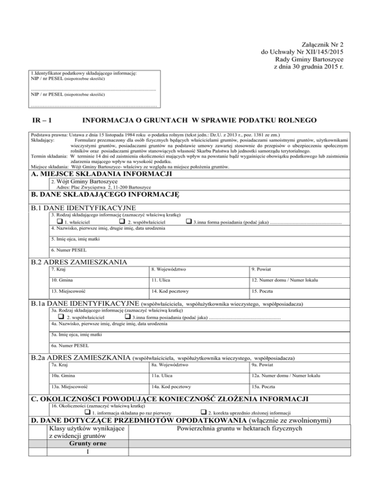 Załącznik Nr 2 do Uchwały Nr XII/145/2015 Rady Gminy Bartoszyce z dnia 30 grudnia 2015 r. 1.Identyfikator podatkowy składającego informację: NIP / nr PESEL (niepotrzebne skreślić) ................................................................................................... NIP / nr PESEL (niepotrzebne skreślić) ………………………………………………………………… IR – 1 INFORMACJA O GRUNTACH W SPRAWIE PODATKU ROLNEGO Podstawa prawna: Ustawa z dnia 15 listopada 1984 roku o podatku rolnym (tekst jedn.: Dz.U. z 2013 r., poz. 1381 ze zm.) Składający: Formularz przeznaczony dla osób fizycznych będących właścicielami gruntów, posiadaczami samoistnymi gruntów, użytkownikami wieczystymi gruntów, posiadaczami gruntów na podstawie umowy zawartej stosownie do przepisów o ubezpieczeniu społecznym rolników oraz posiadaczami gruntów stanowiących własność Skarbu Państwa lub jednostki samorządu terytorialnego. Termin składania: W terminie 14 dni od zaistnienia okoliczności mających wpływ na powstanie bądź wygaśnięcie obowiązku podatkowego lub zaistnienia zdarzenia mającego wpływ na wysokość podatku. Miejsce składania: Wójt Gminy Bartoszyce- właściwy ze względu na miejsce położenia gruntów. A. MIEJSCE SKŁADANIA INFORMACJI 2. Wójt Gminy Bartoszyce Adres: Plac Zwycięstwa 2, 11-200 Bartoszyce B. DANE SKŁADAJĄCEGO INFORMACJĘ B.1 DANE IDENTYFIKACYJNE 3. Rodzaj składającego informację (zaznaczyć właściwą kratkę)  1. właściciel  2. współwłaściciel 4. Nazwisko, pierwsze imię, drugie imię, data urodzenia  3.inna forma posiadania (podać jaka) ......................................................... 5. Imię ojca, imię matki 6. Numer PESEL B.2 ADRES ZAMIESZKANIA 7. Kraj 8. Województwo 9. Powiat 10. Gmina 11. Ulica 12. Numer domu / Numer lokalu 13. Miejscowość 14. Kod pocztowy 15. Poczta B.1a DANE IDENTYFIKACYJNE (współwłaściciela, 3a. Rodzaj składającego informację (zaznaczyć właściwą kratkę) współużytkownika wieczystego, współposiadacza)  2. współwłaściciel  3.inna forma posiadania (podać jaka) ......................................................... 4a. Nazwisko, pierwsze imię, drugie imię, data urodzenia 5a. Imię ojca, imię matki 6a. Numer PESEL B.2a ADRES ZAMIESZKANIA (współwłaściciela, współużytkownika wieczystego, współposiadacza) 7a. Kraj 8a. Województwo 9a. Powiat 10a. Gmina 11a. Ulica 12a. Numer domu / Numer lokalu 13a. Miejscowość 14a. Kod pocztowy 15a. Poczta C. OKOLICZNOŚCI POWODUJĄCE KONIECZNOŚĆ ZŁOŻENIA INFORMACJI 16. Okoliczności (zaznaczyć właściwą kratkę)  1. informacja składana po raz pierwszy  2. korekta uprzednio złożonej informacji D. DANE DOTYCZĄCE PRZEDMIOTÓW OPODATKOWANIA (włącznie ze zwolnionymi) Klasy użytków wynikające z ewidencji gruntów Grunty orne I Powierzchnia gruntu w hektarach fizycznych II IIIa IIIb IVa IVb V VI VIz Sady I II III IIIa IIIb IV IVa IVb V VI VIz Łąki i pastwiska I II III IV V VI VIz Grunty rolne zabudowane: Br I II III IIIa IIIb IV IVa IVb V VI VIz Grunty pod stawami a) zarybione, łososiem, trocią, głowacicą, palią i pstrągiem b) zarybione innymi gatunkami ryb niż w poz. a) c) grunty pod stawami niezarybionymi Grunty pod rowami W I II III IIIa IIIb IV IVa IVb V VI VIz Grunty zadrzewione i zakrzewione na użytkach rolnych Lzr I II III IIIa IIIb IV IVa IVb V VI VIz Razem E.1 INRORMACJE SZCZEGÓŁOWE DOTYCZĄCE PRZEDMIOTÓW OPODATKOWANIA 1.Miejsce (adres) położenia przedmiotów opodatkowania oraz identyfikatory działek: 2.Numer księgi wieczystej lub zbioru dokumentów: E.2 INFORMACJA O PRZEDMIOTACH I PODMIOTACH ZWOLNIONYCH (podać rodzaj, klasę i powierzchnię gruntów zwolnionych oraz przepis prawa – z jakiego tytułu występuje zwolnienie) F. OŚWIADCZENIE I PODPIS SKŁADAJĄCEGO / OSOBY REPREZENTUJĄCEJ SKŁADAJĄCEGO Oświadczam, że podane przeze mnie dane są zgodne z prawdą. 17. Data wypełnienia (dzień - miesiąc - rok) 18. Podpis ................................................................................... (właściciela, użytkownika wieczystego, posiadacza) .................................................................................................................. (współwłaściciela, współużytkownika wieczystego, współposiadacza) G. DANE NIEOBOWIĄZKOWE 19. Nr telefonu 20. Adres e-mail H. ADNOTACJE ORGANU PODATKOWEGO 21. Uwagi organu podatkowego 22. Podpis przyjmującego formularz