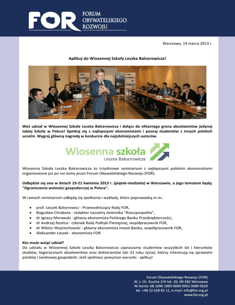 Warszawa, 14 marca 2013 r. Aplikuj do Wiosennej Szkoły Leszka Balcerowicza! Weź udział w Wiosennej Szkole Leszka Balcerowicza i dołącz do elitarnego grona absolwentów jedynej takiej Szkoły w Polsce! Spotkaj się z najlepszymi ekonomistami i poznaj studentów z innych polskich uczelni. Wygraj główną nagrodę w konkursie dla najzdolniejszych autorów. Wiosenna Szkoła Leszka Balcerowicza to trzydniowe seminarium z najlepszymi polskimi ekonomistami organizowane już po raz ósmy przez Forum Obywatelskiego Rozwoju (FOR). Odbędzie się ono w dniach 19-21 kwietnia 2013 r. (piątek-niedziela) w Warszawie, a jego tematem będą: "Ograniczenia wolności gospodarczej w Polsce". W ramach seminarium odbędą się spotkania i wykłady, które poprowadzą m.in.: prof. Leszek Balcerowicz - Przewodniczący Rady FOR, Bogusław Chrabota - redaktor naczelny dziennika "Rzeczpospolita", dr Ignacy Morawski - główny ekonomista Polskiego Banku Przedsiębiorczości, dr Andrzej Rzońca - członek Rady Polityki Pieniężnej, współpracownik FOR, dr Wiktor Wojciechowski - główny ekonomista Invest-Banku, współpracownik FOR, Aleksander Łaszek - ekonomista FOR Kto może wziąć udział? Do udziału w Wiosennej Szkole Leszka Balcerowicza zapraszamy studentów wszystkich lat i kierunków studiów, tegorocznych absolwentów oraz doktorantów (do 32 roku życia), którzy interesują się sprawami polskiej i światowej gospodarki. Jeśli spełniasz powyższe warunki - aplikuj! Jak aplikować? Wystarczy napisać pracę konkursową pt. „Ograniczenia wolności gospodarczej w Polsce” (forma: artykuł prasowy, objętość tekstu: do 5 tys. znaków ze spacjami) oraz przesłać ją do 7 kwietnia poprzez specjalny formularz dostępny na stronie www.for.org.pl. Spośród nadesłanych prac wyłonionych zostanie 30 najlepszych, a ich autorzy wezmą udział w Wiosennej Szkole Leszka Balcerowicza. Osoby zakwalifikowane zostaną poinformowane o wynikach do 12 kwietnia 2013 r. Jakie są nagrody? Wszyscy uczestnicy seminarium otrzymają dyplomy, książkę "Odkrywając wolność. Przeciw zniewoleniu umysłów", a autorzy najlepszych prac zostaną nagrodzeni: I nagroda - 2000 zł, II nagroda – 1000 zł, III nagroda – 500 zł. Jakie są warunki uczestnictwa? Udział w Wiosennej Szkole Leszka Balcerowicza jest bezpłatny. Zapewniamy wyżywienie, a studentom spoza Warszawy - nocleg w hotelu. Osoby, które uczestniczyły w poprzednich edycjach Wiosennej i Jesiennej Szkoły Leszka Balcerowicza nie mogą ponownie wziąć w niej udziału. Każdy uczestnik powinien zapoznać się z regulaminem. Patroni medialni: TVN CNBC, Forbes, Trend, Profit Journal, Radio Kampus, Radio Index, Radio Centrum, Radio Afera, Portal Dlastudenta.pl, Radio Luz, Radio Akadera Szczegóły dotyczące Wiosennej Szkoły Leszka Balcerowicza dostępne są na stronie www.for.org.pl Dodatkowych informacji udziela: Ewelina Wiszniewska, kom. 691 232 994, e-mail: [email protected] Organizator projektu Patroni medialni