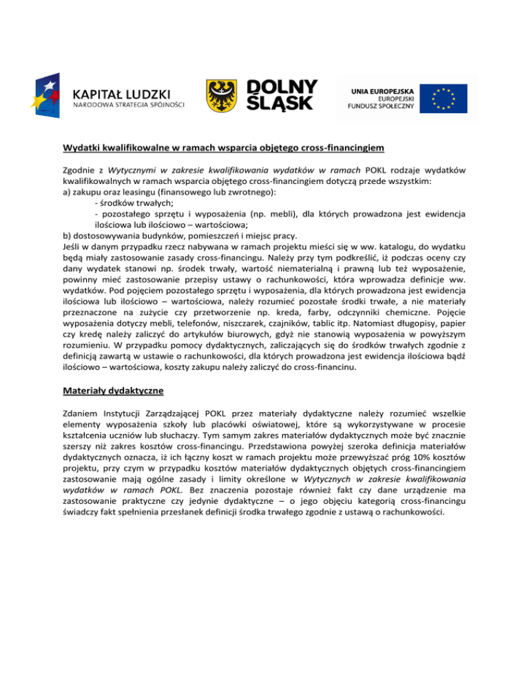 Wydatki kwalifikowalne w ramach wsparcia objętego cross-financingiem Zgodnie z Wytycznymi w zakresie kwalifikowania wydatków w ramach POKL rodzaje wydatków kwalifikowalnych w ramach wsparcia objętego cross-financingiem dotyczą przede wszystkim: a) zakupu oraz leasingu (finansowego lub zwrotnego): - środków trwałych; - pozostałego sprzętu i wyposażenia (np. mebli), dla których prowadzona jest ewidencja ilościowa lub ilościowo – wartościowa; b) dostosowywania budynków, pomieszczeo i miejsc pracy. Jeśli w danym przypadku rzecz nabywana w ramach projektu mieści się w ww. katalogu, do wydatku będą miały zastosowanie zasady cross-financingu. Należy przy tym podkreślid, iż podczas oceny czy dany wydatek stanowi np. środek trwały, wartośd niematerialną i prawną lub też wyposażenie, powinny mied zastosowanie przepisy ustawy o rachunkowości, która wprowadza definicje ww. wydatków. Pod pojęciem pozostałego sprzętu i wyposażenia, dla których prowadzona jest ewidencja ilościowa lub ilościowo – wartościowa, należy rozumied pozostałe środki trwałe, a nie materiały przeznaczone na zużycie czy przetworzenie np. kreda, farby, odczynniki chemiczne. Pojęcie wyposażenia dotyczy mebli, telefonów, niszczarek, czajników, tablic itp. Natomiast długopisy, papier czy kredę należy zaliczyd do artykułów biurowych, gdyż nie stanowią wyposażenia w powyższym rozumieniu. W przypadku pomocy dydaktycznych, zaliczających się do środków trwałych zgodnie z definicją zawartą w ustawie o rachunkowości, dla których prowadzona jest ewidencja ilościowa bądź ilościowo – wartościowa, koszty zakupu należy zaliczyd do cross-financinu. Materiały dydaktyczne Zdaniem Instytucji Zarządzającej POKL przez materiały dydaktyczne należy rozumied wszelkie elementy wyposażenia szkoły lub placówki oświatowej, które są wykorzystywane w procesie kształcenia uczniów lub słuchaczy. Tym samym zakres materiałów dydaktycznych może byd znacznie szerszy niż zakres kosztów cross-financingu. Przedstawiona powyżej szeroka definicja materiałów dydaktycznych oznacza, iż ich łączny koszt w ramach projektu może przewyższad próg 10% kosztów projektu, przy czym w przypadku kosztów materiałów dydaktycznych objętych cross-financingiem zastosowanie mają ogólne zasady i limity określone w Wytycznych w zakresie kwalifikowania wydatków w ramach POKL. Bez znaczenia pozostaje również fakt czy dane urządzenie ma zastosowanie praktyczne czy jedynie dydaktyczne – o jego objęciu kategorią cross-financingu świadczy fakt spełnienia przesłanek definicji środka trwałego zgodnie z ustawą o rachunkowości.