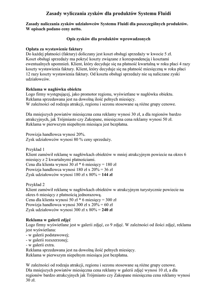 Zasady wyliczania zysków dla produktów Systemu Fluidi Zasady naliczania zysków udziałowców Systemu Fluidi dla poszczególnych produktów. W opisach podano ceny netto. Opis zysków dla produktów wprowadzonych Opłata za wystawienie faktury Do każdej płatności (faktury) doliczany jest koszt obsługi sprzedaży w kwocie 5 zł. Koszt obsługi sprzedaży ma pokryć koszty związane z korespondencją i kosztami ewentualnych upomnień. Klient, który decyduje się na płatność kwartalną w roku płaci 4 razy koszty wystawienia faktury. Klient, który decyduje się na płatność miesięczną w roku płaci 12 razy koszty wystawienia faktury. Od kosztu obsługi sprzedaży nie są naliczane zyski udziałowców. Reklama w nagłówku obiektu Logo firmy występującej, jako promotor regionu, wyświetlane w nagłówku obiektu. Reklama sprzedawana jest na dowolną ilość pełnych miesięcy. W zależności od rodzaju atrakcji, regionu i sezonu stosowane są różne grupy cenowe. Dla mniejszych powiatów miesięczna cena reklamy wynosi 30 zł, a dla regionów bardzo atrakcyjnych, jak Trójmiasto czy Zakopane, miesięczna cena reklamy wynosi 50 zł. Reklama w pierwszym niepełnym miesiącu jest bezpłatna. Prowizja handlowca wynosi 20%. Zysk udziałowców wynosi 80 % ceny sprzedaży. Przykład 1 Klient zamówił reklamę w nagłówkach obiektów w mniej atrakcyjnym powiecie na okres 6 miesięcy z 2 kwartalnymi płatnościami. Cena dla klienta wynosi 30 zł * 6 miesięcy = 180 zł Prowizja handlowca wynosi 180 zł x 20% = 36 zł Zysk udziałowców wynosi 180 zł x 80% = 144 zł Przykład 2 Klient zamówił reklamę w nagłówkach obiektów w atrakcyjnym turystycznie powiecie na okres 6 miesięcy z płatnością jednorazową. Cena dla klienta wynosi 50 zł * 6 miesięcy = 300 zł Prowizja handlowca wynosi 300 zł x 20% = 60 zł Zysk udziałowców wynosi 300 zł x 80% = 240 zł Reklama w galerii zdjęć Logo firmy wyświetlane jest w galerii zdjęć, co 9 zdjęć. W zależności od ilości zdjęć, reklama jest wyświetlana: - w galerii podstawowej; - w galerii rozszerzonej; - w galerii extra. Reklama sprzedawana jest na dowolną ilość pełnych miesięcy. Reklama w pierwszym niepełnym miesiącu jest bezpłatna. W zależności od rodzaju atrakcji, regionu i sezonu stosowane są różne grupy cenowe. Dla mniejszych powiatów miesięczna cena reklamy w galerii zdjęć wynosi 10 zł, a dla regionów bardzo atrakcyjnych jak Trójmiasto czy Zakopane miesięczna cena reklamy wynosi 30 zł. Prowizja handlowca wynosi 20%. Zysk udziałowców wynosi 80 % ceny sprzedaży. Przykład 1 Klient zamówił reklamę w nagłówkach obiektów w mniej atrakcyjnym powiecie na okres 6 miesięcy z 2 kwartalnymi płatnościami. Cena dla klienta wynosi 30 zł * 6 miesięcy = 180 zł Prowizja handlowca wynosi 180 zł x 20% = 36 zł Zysk udziałowców wynosi 180 zł x 80% = 144 zł Przykład 2 Klient zamówił reklamę w nagłówkach obiektów w atrakcyjnym turystycznie powiecie na okres 6 miesięcy z płatnością jednorazową. Cena dla klienta wynosi 50 zł * 6 miesięcy = 300 zł Prowizja handlowca wynosi 300 zł x 20% = 60 zł Zysk udziałowców wynosi 300 zł x 80% = 240 zł Opracowanie Kart kolekcjonerskich Fluidi Za przygotowanie kart kolekcjonerskich Fluidi do wydania promotorzy kart wnoszą opłatę 400 zł. Koszt przygotowania kart do druku wynosi 270 zł i obejmuje: - Opracowanie tekstu - Opracowanie graficzne - Prawa do zdjęć - Wydruk próbny - Wprowadzenie karty do systemu - Obsługa klienta Prowizja handlowca za pozyskanie klienta wynosi 20%, czyli 80 zł. Zysk Udziałowców wynosi 50 zł. Sprzedaż Kart kolekcjonerskich Fluidi Cena produkcji karty wraz z kosztem wysyłki do klienta wynosi 1,05 zł Koszt obsługi produkcji i zamówień na karty wynosi 0,1 zł Zysk Udziałowców na karcie wynosi 0,50 zł Hurtowa cena sprzedaży wynosi 1,94 zł Prowizja handlowca dla karty wynosi 15% od ceny hurtowej, czyli 0,29 zł Narzut sprzedawcy detalicznego wynosi 0,5 zł Cena sprzedaży netto wynosi 2,44 zł Cena sprzedaży brutto wynosi 3,00 zł Cena karty może wzrastać wraz z popularyzacją systemu kart kolekcjonerskich. Sprzedaż konkursów fotograficznych Fluidi Miesięczny koszt ogłoszenia konkursu dla obiektu wynosi od 50 do 500 zł w zależności od atrakcyjności obiektu i atrakcyjności turystycznej regionu. Konkurs może być ogłoszony na maksymalny okres 6 miesięcy. Od opłaty wnoszonej za konkursy 40 % przeznaczane jest na nagrody wraz z kosztami wysyłki. Koszt obsługi konkursu wynosi 10%. Prowizja handlowca wynosi 20%. Zysk Udziałowców wynosi 30%. Przykład 1: Konkurs ogłoszono dla regionalnej atrakcji turystycznej na okres 3 miesięcy. Koszt ogłoszenia konkursu wynosi 100 zł x 3 miesiące = 300 zł Na nagrody przeznaczane jest 40%, czyli 120 zł. Na dział obsługi konkursów przeznaczane jest 10%, czyli 30 zł. Handlowiec otrzymuje 20%, czyli 60 zł. Zysk Udziałowców wynosi 30%, czyli 90 zł. Przykład 2: Konkurs ogłoszono dla dużej regionalnej atrakcji turystycznej w atrakcyjnym turystycznie regionie na okres 6 miesięcy. Koszt ogłoszenia konkursu wynosi 200 zł x 6 miesięcy = 1.200 zł Na nagrody przeznaczane jest 40%, czyli 480 zł. Na dział obsługi konkursów przeznaczane jest 10%, czyli 120 zł. Handlowiec otrzymuje 20%, czyli 240 zł. Zysk Udziałowców wynosi 30%, czyli 360 zł. Przykład 3: Konkurs ogłoszono dla dużej regionalnej imprezy na okres 1 miesiąca. Koszt ogłoszenia konkursu wynosi 500 zł x 1 miesiąc = 500 zł Na nagrody przeznaczane jest 40%, czyli 200 zł. Na dział obsługi konkursów przeznaczane jest 10%, czyli 50 zł. Handlowiec otrzymuje 20%, czyli 100 zł. Zysk Udziałowców wynosi 30%, czyli 150 zł. Opłaty za pozycjonowanie obiektów Dla każdego powiatu 10 obiektów może zostać oznaczonych, jako obiekty z pierwszeństwem prezentacji. Obiekty oznaczone wyświetlane są zawsze, jako pierwsze zestawieniu odfiltrowanych obiektów. Cena ustawienia pier