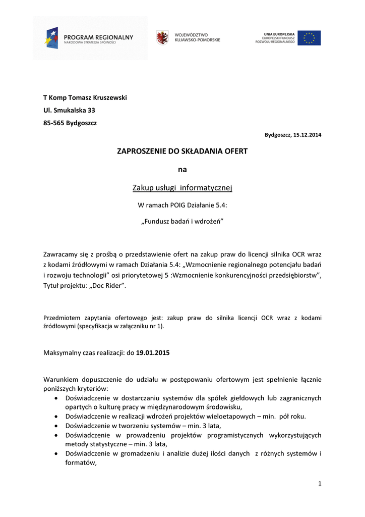 T Komp Tomasz Kruszewski Ul. Smukalska 33 85-565 Bydgoszcz Bydgoszcz, 15.12.2014 ZAPROSZENIE DO SKŁADANIA OFERT na Zakup usługi informatycznej W ramach POIG Działanie 5.4: „Fundusz badań i wdrożeń” Zawracamy się z prośbą o przedstawienie ofert na zakup praw do licencji silnika OCR wraz z kodami źródłowymi w ramach Działania 5.4: „Wzmocnienie regionalnego potencjału badań i rozwoju technologii” osi priorytetowej 5 :Wzmocnienie konkurencyjności przedsiębiorstw”, Tytuł projektu: „Doc Rider”. Przedmiotem zapytania ofertowego jest: zakup praw do silnika licencji OCR wraz z kodami źródłowymi (specyfikacja w załączniku nr 1). Maksymalny czas realizacji: do 19.01.2015 Warunkiem dopuszczenie do udziału w postępowaniu ofertowym jest spełnienie łącznie poniższych kryteriów: • Doświadczenie w dostarczaniu systemów dla spółek giełdowych lub zagranicznych opartych o kulturę pracy w międzynarodowym środowisku, • Doświadczenie w realizacji wdrożeń projektów wieloetapowych – min. pół roku. • Doświadczenie w tworzeniu systemów – min. 3 lata, • Doświadczenie w prowadzeniu projektów programistycznych wykorzystujących metody statystyczne – min. 3 lata, • Doświadczenie w gromadzeniu i analizie dużej ilości danych z różnych systemów i formatów, 1 • • • • • Doświadczenie w wykorzystywaniu predykcyjnych modeli do prognozowania, Doświadczenie w tworzeniu i wdrażaniu rozwiązań dla platform mobilnych, Doświadczenie w kreowaniu interfejsów wykorzystujących elementy HTML5, Doświadczenie w integracji i konsolidacji danych pochodzących z różnych źródeł, Doświadczenie w wielowymiarowej analizie danych opartej na wielowymiarowym modelu danych (OLAP) Złożona oferta powinna zawierać: • • • • • • Nazwę i adres oferenta Datę sporządzenia Cenę całkowitą netto i brutto, Termin ważności oferty, Warunki i termin płatności, Podpis wykonawcy wraz z pieczątką imienną i firmową Oferta może być dostarczona: • Za pośrednictwem poczty elektronicznej na adres: [email protected] • Za pośrednictwem poczty na adres: T Komp Tomasz Kruszewski, ul. Smukalska 33, 85-565 Bydgoszcz • Osobiście w siedzibie T Komp Tomasz Kruszewski, ul. Smukalska 33, 85-565 Bydgoszcz Termin składania ofert upływa: 23.12.2014 r. Planowany termin rozstrzygnięcia postępowania ofertowego i wyłonienie oferenta nie później niż dnia 02.01.2015 r. Wybór najkorzystniejszej oferty nastąpi w oparciu o kryterium ceny. 2 ZAŁĄCZNIK NR 1 Silnik OCR musi charakteryzować się: - dostępnością kodu źródłowego z możliwością udostępnienia interfejsów programistycznych dla aplikacji opartych o platformę Microsoft.NET. - wbudowanymi mechanizmami segmentacji obrazu (ang. adaptive tresholding). - wbudowanymi mechanizmami znajdowania poziomu linii tekstu (baseline detection). - wbudowany mechanizm detekcji zmiany odstępu pomiędzy słowami w liniach tekstu. - adaptacyjnym klasyfikatorem dla rozpoznawanych znaków. - pełnym wsparciem dla kodowania UTF-8.Wymagana jest także jasność licencyjna umożliwiająca dalszą modyfikację, sprzedaż oraz dystrybucję. Udzielona licencja musi obejmować następujące pola eksploatacji: wykorzystywanie, modyfikację, cyfrowe powielanie w dowolnych ilościach, włączenie zmodyfikowanego lub niezmodyfikowanego silnika OCR w formie źródłowej oraz skompilowanej do własnych rozwiązań informatycznych oraz produktów, dystrybucję jako część integralną z własnymi rozwiązaniami informatycznymi oraz produktami. 3
