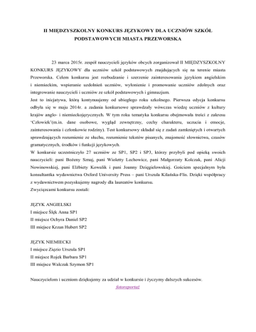 II MIĘDZYSZKOLNY KONKURS JĘZYKOWY DLA UCZNIÓW SZKÓŁ PODSTAWOWYCH MIASTA PRZEWORSKA 23 marca 2015r. zespół nauczycieli języków obcych zorganizował II MIĘDZYSZKOLNY KONKURS JĘZYKOWY dla uczniów szkół podstawowych znajdujących się na terenie miasta Przeworska. Celem konkursu jest rozbudzanie i szerzenie zainteresowania językiem angielskim i niemieckim, wspieranie uzdolnień uczniów, wyłonienie i promowanie uczniów zdolnych oraz integrowanie nauczycieli i uczniów ze szkół podstawowych i gimnazjum. Jest to inicjatywa, którą kontynuujemy od ubiegłego roku szkolnego. Pierwsza edycja konkursu odbyła się w maju 2014r. a zadania konkursowe sprawdzały wówczas wiedzę uczniów z kultury krajów anglo- i niemieckojęzycznych. W tym roku tematyka konkursu obejmowała treści z zakresu ‘Człowiek’(m.in. dane osobowe, wygląd zewnętrzny, cechy charakteru, uczucia i emocje, zainteresowania i członkowie rodziny). Test konkursowy składał się z zadań zamkniętych i otwartych sprawdzających rozumienie ze słuchu, rozumienie tekstów pisanych, znajomość słownictwa, czasów gramatycznych, środków i funkcji językowych. W konkursie uczestniczyło 27 uczniów ze SP1, SP2 i SP3, którzy przybyli pod opieką swoich nauczycieli: pani Bożeny Sznaj, pani Wioletty Lechowicz, pani Małgorzaty Kolczak, pani Alicji Nowinowskiej, pani Elżbiety Kowalik i pani Joanny Dzięgielowskiej. Gościem specjalnym była konsultantka wydawnictwa Oxford University Press – pani Urszula Kilańska-Flis. Dzięki współpracy z wydawnictwem pozyskujemy nagrody dla laureatów konkursu. Zwycięzcami konkursu zostali: JĘZYK ANGIELSKI I miejsce Ślęk Anna SP1 II miejsce Ochyra Daniel SP2 III miejsce Krzan Hubert SP2 JĘZYK NIEMIECKI I miejsce Zięzio Urszula SP1 II miejsce Rojek Barbara SP1 III miejsce Walczak Szymon SP1 Nauczycielom i uczniom dziękujemy za udział w konkursie i życzymy dalszych sukcesów. fotoreportaż