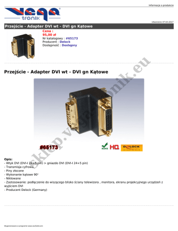 Informacje o produkcie Utworzono 07-03-2017 Przejście - Adapter DVI wt - DVI gn Kątowe Cena : 95,00 zł sk le p. ve g atr on i k. Przejście - Adapter DVI wt - DVI gn Kątowe eu Nr katalogowy : #65173 Producent : Delock Dostępność : Dostępny Opis: - Wtyk DVI (DVI-I 24+5 pin) > gniazdo DVI (DVI-I 24+5 pin) - Transmisja cyfrowa - Piny złocone - Wykonanie kątowe 90o - Niklowane - Zastosowanie: podłączenie do wiszącego blisko ściany telewizora , monitora, ekranu projekcyjnego urządzeń z wyjściem DVI - Producent Delock (Germany) Wygenerowano w programie www.oscGold.com