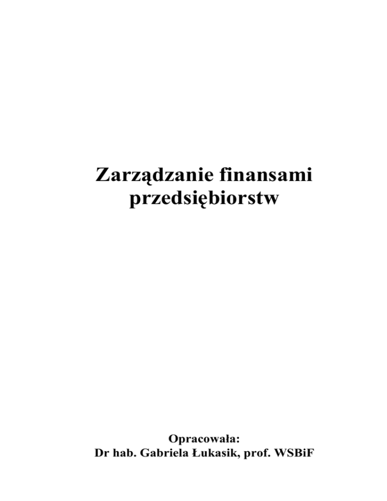 Zarządzanie finansami przedsiębiorstw Opracowała: Dr hab. Gabriela Łukasik, prof. WSBiF I. OGÓLNE INFORMACJE O PRZEDMIOCIE Cele przedmiotu:: - przedstawienie podstawowych teoretycznych zagadnień związanych z zarządzeniem finansami w przedsiębiorstwie działającym w zmiennych otoczenia - powiązanie elementów teorii finansów z procesem decyzyjnym współczesnego przedsiębiorstwa - przygotowanie studenta do praktycznego rozwiązywania głównych problemów decyzyjnych współczesnego przedsiębiorstwa związanych z finansową stroną jego działalności Ramowy program 1. Podstawy zarządzania finansami przedsiębiorstw. 2. Kapitały i majątek przedsiębiorstwa (ujęcie bilansowe) 3. Metody i źródła finansowania przedsiębiorstw 4. Podstawy zarządzania płynnością finansową przedsiębiorstwa 5. Strategie finansowania aktywów obrotowych 6. Kształtowanie wartości i struktury aktywów obrotowych 7. Polityka kredytowa przedsiębiorstwa wobec odbiorców 8. Podstawy kształtowania struktury kapitału w przedsiębiorstwie 9. Długoterminowe źródła finansowania przedsiębiorstwa 72 Literatura podstawowa - J.Czekaj, Z.Dresler; Zarządzanie finansami przedsiębiorstw, Podstawy teorii, PWN, Warszawa 2001 - E.F. Brigham : Podstawy zarządzania finansami, PWE, Warszawa 1996 - M. Sierpińska, D. Wędzki: Zarządzanie finansowe, teoria i praktyka, Fundacja Rozwoju Rachunkowości, Warszawa 1997 - Kodeks Spółek Handlowych - Ustawa o rachunkowości uzupełniająca - J. Gajdka, E. Walińska: Zarządzanie finansowe, teoria i praktyka, Fundacja Rozwoju Rachunkowości, Warszawa 1998 - W. Bień: Zrządzanie finansami przedsiębiorstwa, Difin, Warszawa 1997 - Finanse przedsiębiorstwa, praca zbiorowa pod red. L. Szyszko, PWE, Warszawa 2000 II. PROBLEMATYKA ZAJĘĆ DYDAKTYCZNYCH 1 . Podstawy zarządzania finansami przedsiębiorstw słowa kluczowe: zarządzanie finansami, funkcje zarządzania, cele finansowe, wartość przedsiębiorstwa, decyzje finansowe, zmienna wartość pieniądza w czasie, wartość zaktualizowana 73 główne tematy - cel i treść finansów przedsiębiorstwa - funkcje zarządzania finansów - cele finansowe przedsiębiorstwa, kategoria wartości w strukturze celów przedsiębiorstwa - obszary decyzji finansowych przedsiębiorstwa, ryzyko w procesie decyzyjnym przedsiębiorstwa - wartość pieniądza w czasie i jej wykorzystanie w długoterminowych decyzjach przedsiębiorstwa - Przedsiębiorstwo jako podmiot gospodarki rynkowej, przedsiębiorstwo w otoczeniu finansowym, wpływ otoczenia na decyzje finansowe podmiotów gospodarczych - Rynek kapitałowy w procesie zarządzania finansami przedsiębiorstwa - Formy organizacyjno-prawne przedsiębiorstwa i ich wpływ na zarządzanie finansami Podstawowe pytania - Jaką rolę odgrywa kategoria wartości w strukturze celów przedsiębiorstwa? - Podstawowe różnice między kategorią zysku i wartością przedsiębiorstwa. - Jakie są główne funkcje zarządzania finansami przedsiębiorstwa? - Wyróżnianie głównych obszarów decyzji przedsiębiorstwa w procesie zarządzania finansami, - Pojęcie wartości przyszłej i wartości zaktualizowanej. - Struktura rynku finansowego w wyborach przedsiębiorstw. 74 - Struktura rynku finansowego i jego wpływ na aktywność przedsiębiorstwa. - Główne różnice w formach organizacyjno-prawnych przedsiębiorstwa w aspekcie zarządzania finansami Literatura - J.Czekaj, Z.Dresler; Zarządzanie finansami przedsiębiorstw, Podstawy teorii, PWN, Warszawa 2001rozdz. I i II - W. Bień: Zrządzanie finansami przedsiębiorstwa, Difin, Warszawa 1997, I i II - Finanse przedsiębiorstwa, praca zbiorowa pod red. L. Szyszko, PWE, Warszawa 2000 - Kodeks Spółek Handlowych 2. Kapitały i majątek przedsiębiorstwa (ujęcie bilansowe) słowa kluczowe: kapitał własny, kapitał obcy, aktywa obrotowe, kapitał obrotowy główne tematy 1. Pojęcie i struktura kapitału przedsiębiorstwa, cechy charakterystyczne kapitału własnego i kapitału obcego, funkcje kapitału własnego 2. Podstawy podwyższenia kapitału własnego 3. Kapitały obce, struktura, konsekwencje dla przedsiębiorstwa 4. Kapitał obrotowy przedsiębiorstwa, pojęcie, źródła finansowania 5. Aktywa (majątek) przedsiębiorstwa i ich struktura, aktywa trwałe: pojęcie i struktura, aktywa obrotowe: pojęcie i 75 struktura, sposoby udziału aktywów przedsiębiorstwa w cyklu krążenia kapitału Podstawowe pytania 1. Wymienić główne elementy kapitału przedsiębiorstwa. 2. Jaka jest struktura kapitału własnego w spółce z ograniczoną odpowiedzialnością i spółce akcyjnej? 3. Wymienić główne źródła tworzenia i uzupełnienia kapitału podstawowego i kapitałów uzupełniających. 4. Główne funkcje kapitału własnego. 5. Pojęcie i źródła finansowania kapitału obrotowego. 6. Jaka jest struktura aktywów trwałych i obrotowych. Literatura Finanse przedsiębiorstwa, praca zbiorowa pod red. L. Szyszko, PWE, Warszawa 2000, rozdz. VI i VII Ustawa o rachunkowości 3. Metody i źródła finansowania przedsiębiorstwa słowa kluczowe: źródła finansowania, zasilanie zewnętrzne i wewnętrzne, samofinansowanie, obce i własne źródła, nadwyżka finansowa, zysk przedsiębiorstwa, amortyzacja, funkcje amortyzacji, metody amortyzacji. główne tematy: 1. Klasyfikacja metod i źródeł finansowania. 2. Finansowanie zewnętrzne i wewnętrzne. 3. Finansowanie własne i obce. 76 4. Teoria hierarchii w kształtowaniu źródeł finansowania przedsiębiorstwa. 5. Samofinansowanie działalności przedsiębiorstwa: źródła finansowania, pojęcie nadwyżki finansowej, ekonomiczne konsekwencje wzrostu finansowania wewnętrznego. 6. Zysk przedsiębiorstwa, zasady i etapy tworzenia i podziału zysku. • Zakres i możliwości kształtowania zysku i podziału zysku. • Czynniki zależne i niezależne wpływające na podział zysku. 7. Polityka dywidendy w przedsiębiorstwie i jej wpływ na podział zysku. 8. Amortyzacja przedsię