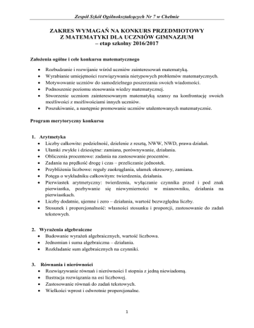 Zespół Szkół Ogólnokształcących Nr 7 w Chełmie ZAKRES WYMAGAŃ NA KONKURS PRZEDMIOTOWY Z MATEMATYKI DLA UCZNIÓW GIMNAZJUM – etap szkolny 2016/2017 Założenia ogólne i cele konkursu matematycznego Rozbudzanie i rozwijanie wśród uczniów zainteresowań matematyką. Wyrabianie umiejętności rozwiązywania nietypowych problemów matematycznych. Motywowanie uczniów do samodzielnego poszerzania swoich wiadomości. Podnoszenie poziomu stosowania wiedzy matematycznej. Stworzenie uczniom zainteresowanym matematyką szansy na konfrontację swoich możliwości z możliwościami innych uczniów. Poszukiwanie, a następnie promowanie uczniów utalentowanych matematycznie. Program merytoryczny konkursu 1. Arytmetyka Liczby całkowite: podzielność, dzielenie z resztą, NWW, NWD, prawa działań. Ułamki zwykłe i dziesiętne: zamiana, porównywanie, działania. Obliczenia procentowe: zadania na zastosowanie procentów. Zadania na prędkość drogę i czas – przeliczanie jednostek. Przybliżenia liczbowe: reguły zaokrąglania, ułamek okresowy, zamiana. Potęga o wykładniku całkowitym: twierdzenia, działania. Pierwiastek arytmetyczny: twierdzenia, wyłączanie czynnika przed i pod znak pierwiastka, pozbywanie się niewymierności w mianowniku, działania na pierwiastkach. Liczby dodatnie, ujemne i zero – działania, wartość bezwzględna liczby. Stosunek i proporcjonalność: własności stosunku i proporcji, zastosowanie do zadań tekstowych. 2. Wyrażenia algebraiczne Budowanie wyrażeń algebraicznych, wartość liczbowa. Jednomian i suma algebraiczna – działania. Rozkładanie sum algebraicznych na czynniki. 3. Równania i nierówności Rozwiązywanie równań i nierówności I stopnia z jedną niewiadomą. Ilustracja rozwiązania na osi liczbowej. Zastosowanie równań do zadań tekstowych. Wielkości wprost i odwrotnie proporcjonalne. 1 Zespół Szkół Ogólnokształcących Nr 7 w Chełmie 4. Figury geometryczne Wielokąty: trójkąty, czworokąty- klasyfikacja, własności i pola powierzchni. Twierdzenie Pitagorasa i twierdzenie odwrotne- zastosowania w zadaniach. Okrąg i koło, figury w kole- twierdzenia, ramiona styczne do okręgu- wielokąt wpisany i opisany. Pole koła i długość okręgu, długość łuku i pole wycinka. 5. Przekształcenia geometryczne Symetria osiowa i środkowa. Symetria w układzie współrzędnych. Figury przystające. Cechy przystawania trójkątów- zadania na dowodzenie. 6. Graniastosłupy i ostrosłupy Pola powierzchni i objętość wielościanów. Literatura podstawowa i pomocnicza 1. Podręczniki i zbiory zadań do nauki matematyki z GWO. 2. K. Dworecka, Z. Kochanowski- Konkursy matematyczne- wybór zadań WSiP. 3. Z Krawcewicz- Zadania dla uczniów uzdolnionych matematycznie- WSiP. 2