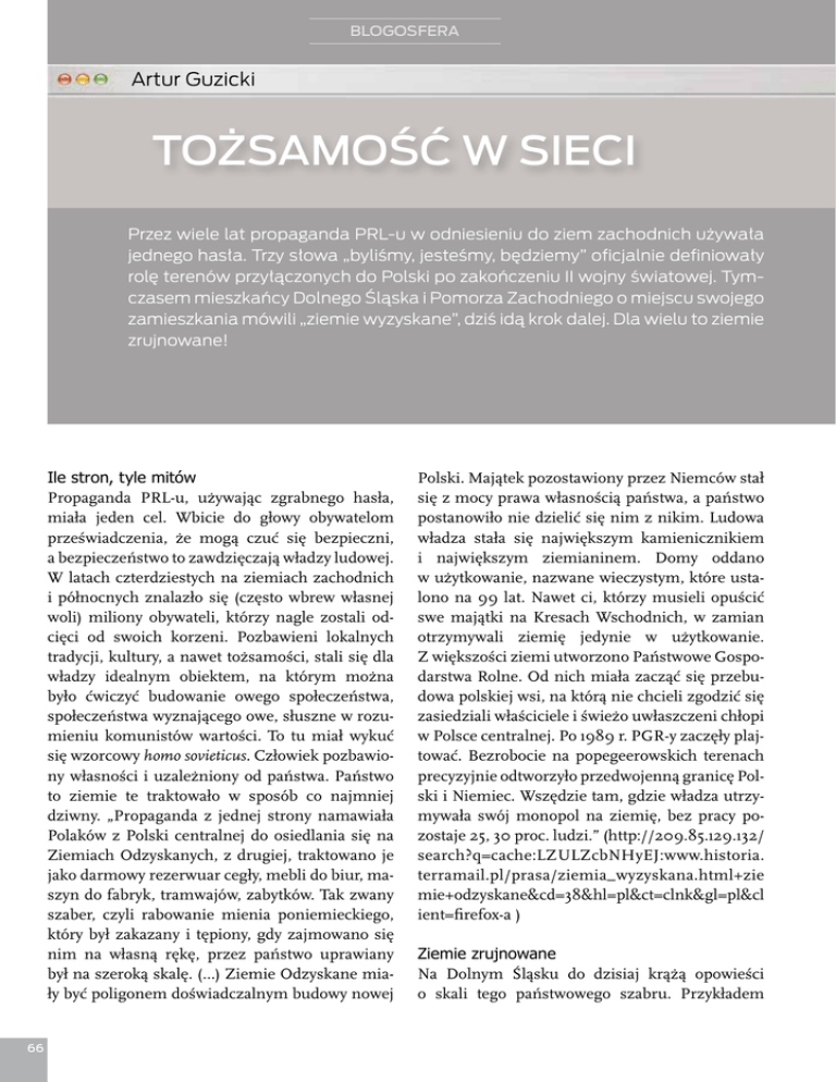 BLOGOSFERA Artur Guzicki TOŻSAMOŚĆ W SIECI Przez wiele lat propaganda PRL-u w odniesieniu do ziem zachodnich używała jednego hasła. Trzy słowa „byliśmy, jesteśmy, będziemy” oficjalnie definiowały rolę terenów przyłączonych do Polski po zakończeniu II wojny światowej. Tymczasem mieszkańcy Dolnego Śląska i Pomorza Zachodniego o miejscu swojego zamieszkania mówili „ziemie wyzyskane”, dziś idą krok dalej. Dla wielu to ziemie zrujnowane! Ile stron, tyle mitów Propaganda PRL-u, używając zgrabnego hasła, miała jeden cel. Wbicie do głowy obywatelom przeświadczenia, że mogą czuć się bezpieczni, a bezpieczeństwo to zawdzięczają władzy ludowej. W latach czterdziestych na ziemiach zachodnich i północnych znalazło się (często wbrew własnej woli) miliony obywateli, którzy nagle zostali od cięci od swoich korzeni. Pozbawieni lokalnych tradycji, kultury, a nawet tożsamości, stali się dla władzy idealnym obiektem, na którym można było ćwiczyć budowanie owego społeczeństwa, społeczeństwa wyznającego owe, słuszne w rozu mieniu komunistów wartości. To tu miał wykuć się wzorcowy homo sovieticus. Człowiek pozbawio ny własności i uzależniony od państwa. Państwo to ziemie te traktowało w sposób co najmniej dziwny. „Propaganda z jednej strony namawiała Polaków z Polski centralnej do osiedlania się na Ziemiach Odzyskanych, z drugiej, traktowano je jako darmowy rezerwuar cegły, mebli do biur, ma szyn do fabryk, tramwajów, zabytków. Tak zwany szaber, czyli rabowanie mienia poniemieckiego, który był zakazany i tępiony, gdy zajmowano się nim na własną rękę, przez państwo uprawiany był na szeroką skalę. (…) Ziemie Odzyskane mia ły być poligonem doświadczalnym budowy nowej 66 Polski. Majątek pozostawiony przez Niemców stał się z mocy prawa własnością państwa, a państwo postanowiło nie dzielić się nim z nikim. Ludowa władza stała się największym kamienicznikiem i największym ziemianinem. Domy oddano w użytkowanie, nazwane wieczystym, które usta lono na 99 lat. Nawet ci, którzy musieli opuścić swe majątki na Kresach Wschodnich, w zamian otrzymywali ziemię jedynie w użytkowanie. Z większości ziemi utworzono Państwowe Gospo darstwa Rolne. Od nich miała zacząć się przebu dowa polskiej wsi, na którą nie chcieli zgodzić się zasiedziali właściciele i świeżo uwłaszczeni chłopi w Polsce centralnej. Po 1989 r. PGR-y zaczęły plaj tować. Bezrobocie na popegeerowskich terenach precyzyjnie odtworzyło przedwojenną granicę Pol ski i Niemiec. Wszędzie tam, gdzie władza utrzy mywała swój monopol na ziemię, bez pracy po zostaje 25, 30 proc. ludzi.” (http://209.85.129.132/ search?q=cache:LZULZcbNHyEJ:www.historia. terramail.pl/prasa/ziemia_wyzyskana.html+zie mie+odzyskane&cd=38&hl=pl&ct=clnk&gl=pl&cl ient=firefox-a ) Ziemie zrujnowane Na Dolnym Śląsku do dzisiaj krążą opowieści o skali tego państwowego szabru. Przykładem jest chociażby ważna linia kolejowa łącząca Leg nicę z Głogowem. Jeszcze zaraz po wojnie linia ta miała dwa tory. Dzisiaj jeden. Starsi mieszkańcy tych ziem z oburzeniem opowiadają, jak to zwy cięska Armia Czerwona, wracając z Niemiec „zwi jała za sobą” szyny kolejowe. Wielka akcja „cała Polska odbudowuje swoją stolicę” na ziemiach zachodnich przybierała wymiar makabryczny. Po prostu znikały budynki, a nawet całe kwartały miast rozbierane tylko dlatego, żeby pozyskać ma teriały budowlane. „Polska z Ziemiami Odzyska nymi zrobiła mniej więcej to, co małpa robi z ze garkiem. Zniszczono i infrastrukturę kulturalną, i transportową. Miasta, które były aglomeracjami rozproszonymi, mającymi dzięki tej infrastruktu rze w swym zasięgu nawet 200–300 tys. ludności, po upadku systemu transportu stały się 40–50-ty sięcznymi miastami średniej wielkości. Przesta ły być regionalnymi centrami, jak przed wojną. Ludność przestała podróżować, przynajmniej na te dłuższe dystanse. Wielkomiejskość nagle stąd prysła. Europejskość też. Kicz zastąpił przedwojenną elegancję i smak. Po niemieckiej stronie jest ład nie, po polskiej wygląda jak w Meksyku – wszę dzie strip landscape: krajobraz nieokiełznanych szyldów i tablic reklamowych, parkingów, cen trów handlowych. Po niemieckiej stronie pejzaże amerykańskich przedmieść również istnieją, ale nie zdominowały miast tak doszczętnie jak po polskiej stronie. W Niemczech wciąż są wielkie obszary zwykłej miejskiej estetyki. Upadła turystyka. Do Karpacza przed wojną przyjeżdżało po kilka pociągów dziennie z Berli na i jeden z Amsterdamu. Dziś na torach rosną drzewa, kolejka narciarska na Kopę to pojedyncze krzesełko niezmienione od 30 lat, poruszające się z prędkością emeryta, jakieś 3 km/h. Narciarze na to nie mają czasu, dziś z Europy, a nawet z Pol ski jeździ się do Czech. Po polskiej stronie został skansen, w którym rzeczy zmieniają się o wiele za wolno. (http://209.85.129.132/search?q=cache :iYSwTNJokdIJ:rasfufu.salon24.pl/16298,polskazniszczyla-ziemie-odzyskane-tak-jak-malpa-zegar ek+ziemie+odzyskane&cd=2&hl=pl&ct=clnk&gl =pl&client=firefox-a) Fakty i mity Polska administracja przejmując Ziemie Odzy skane musiała zmierzyć się z dwoma zadaniami. Pierwszy to zastany na miejscu mit wielkich, nie przystających do reszty kraju aglomeracji miej skich. Mit obcy, wręcz wrogi, który trzeba znisz czyć. W to miejsce należało zbudować mit własny. 67 Mit, który sprawi, że życie na obczyźnie milionów ludzi stanie się znośne i doprowadzi do sytuacji, że osadnicy zaczną mówić o ziemiach odzyska nych jako o swoim domu. Mieszkańcy miast na co dzień przechodzili obok pięknych budowli, o których nic nie wiedzieli. Przez całe dziesięcio lecia nie mieli szans na poznanie historii ludzi, którzy je wznieśli. Wrocławianie, legniczanie czy mieszkańcy Szczecina żyli w zaklętym kręgu. Ob cowali z obiektam