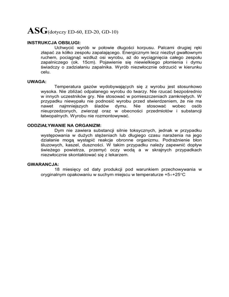 ASG(dotyczy ED-60, ED-20, GD-10) INSTRUKCJA OBSŁUGI: Uchwycić wyrób w połowie długości korpusu. Palcami drugiej ręki złapać za kółko zespołu zapalającego. Energicznym lecz niezbyt gwałtownym ruchem, pociągnąć wzdłuż osi wyrobu, aż do wyciągnięcia całego zespołu zapalniczego (ok. 15cm). Pojawienie się niewielkiego płomienia i dymu świadczy o zadziałaniu zapalnika. Wyrób niezwłocznie odrzucić w kierunku celu. UWAGA: Temperatura gazów wydobywających się z wyrobu jest stosunkowo wysoka. Nie zbliżać odpalanego wyrobu do twarzy. Nie rzucać bezpośrednio w innych uczestników gry. Nie stosować w pomieszczeniach zamkniętych. W przypadku niewypału nie podnosić wyrobu przed stwierdzeniem, że nie ma nawet najmniejszych śladów dymu. Nie stosować wobec osób nieuprzedzonych, zwierząt oraz w obecności przedmiotów i substancji łatwopalnych. Wyrobu nie rozmontowywać. ODDZIAŁYWANIE NA ORGANIZM: Dym nie zawiera substancji silnie toksycznych, jednak w przypadku występowania w dużych stężeniach lub długiego czasu narażenia na jego działanie mogą wystąpić reakcje obronne organizmu. Podrażnienie błon śluzowych, kaszel, duszności. W takim przypadku należy zapewnić dopływ świeżego powietrza, przemyć oczy wodą a w skrajnych przypadkach niezwłocznie skontaktować się z lekarzem. GWARANCJA: 18 miesięcy od daty produkcji pod warunkiem przechowywania w oryginalnym opakowaniu w suchym miejscu w temperaturze +5+25C
