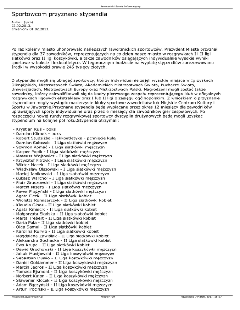 Jaworznicki Serwis Informacyjny Sportowcom przyznano stypendia Autor: (ipra) 02.02.2013. Zmieniony 01.02.2013. Po raz kolejny miasto uhonorowało najlepszych jaworznickich sportowców. Prezydent Miasta przyznał stypendia dla 37 zawodników, reprezentujących na co dzień nasze miasto w rozgrywkach I i II ligi siatkówki oraz II ligi koszykówki, a także zawodników osiągających indywidualnie wysokie wyniki sportowe w boksie i lekkoatletyce. W tegorocznym budżecie na wypłatę stypendiów zarezerwowano środki w wysokości prawie 245 tysięcy złotych. O stypendia mogli się ubiegać sportowcy, którzy indywidualnie zajęli wysokie miejsca w Igrzyskach Olimpijskich, Mistrzostwach Świata, Akademickich Mistrzostwach Świata, Pucharze Świata, Uniwersjadach, Mistrzostwach Europy oraz Mistrzostwach Polski. Nagrodzeni mogli zostać także zawodnicy, którzy zakwalifikowali się do kadry pierwszego zespołu reprezentującego klub w oficjalnych rozgrywkach ligowych ekstraklasy oraz I lub II ligi o zasięgu ogólnopolskim. Z wnioskiem o przyznanie stypendium mogły wystąpić macierzyste kluby sportowe zawodników lub Miejskie Centrum Kultury i Sportu w Jaworznie.Przyznane stypendia będą wypłacane przez okres 12 miesięcy dla zawodników uprawiających sporty indywidualne oraz przez 6 miesięcy dla zawodników gier zespołowych. Po rozpoczęciu nowej rundy rozgrywkowej sportowcy dyscyplin drużynowych będą mogli uzyskać stypendium na kolejne pół roku.Stypendia otrzymali: - Krystian Kuś - boks Damian Klimek - boks Robert Studziżba - lekkoatletyka - pchnięcie kulą Damian Sobczak - I Liga siatkówki mężczyzn Szymon Romać - I Liga siatkówki mężczyzn Kacper Popik - I Liga siatkówki mężczyzn Mateusz Wojtowicz - I Liga siatkówki mężczyzn Krzysztof Fitrzyk - I Liga siatkówki mężczyzn Wiktor Macek - I Liga siatkówki mężczyzn Władysław Olszowski - I Liga siatkówki mężczyzn Maciej Janikowski - I Liga siatkówki mężczyzn Łukasz Warchoł - I Liga siatkówki mężczyzn Piotr Gruszowski - I Liga siatkówki mężczyzn Marcin Mizera - I Liga siatkówki mężczyzn Paweł Prążyński - I Liga siatkówki mężczyzn Agata Ficek - II Liga siatkówki kobiet Wioletta Komisarczyk - II Liga siatkówki kobiet Klaudia Gibas - II Liga siatkówki kobiet Agata Kmiecik - II Liga siatkówki kobiet Małgorzata Skalska - II Liga siatkówki kobiet Marta Trebert - II Liga siatkówki kobiet Daria Pala - II Liga siatkówki kobiet Olga Samul - II Liga siatkówki kobiet Karolina Kuryło - II Liga siatkówki kobiet Magdalena Zawiślak - II Liga siatkówki kobiet Aleksandra Sochacka - II Liga siatkówki kobiet Ewa Krupa - II Liga siatkówki kobiet Dawid Grochowski - II Liga koszykówki mężczyzn Jakub Musijowski - II Liga koszykówki mężczyzn Sebastian Dusiło - II Liga koszykówki mężczyzn Daniel Goldammer - II Liga koszykówki mężczyzn Marcin Jędros - II Liga koszykówki mężczyzn Tomasz Ejsmont - II Liga koszykówki mężczyzn Norbert Kujon - II Liga koszykówki mężczyzn Sławomir Klocek - II Liga koszykówki mężczyzn Adam Bączyński - II Liga koszykówki mężczyzn Artur Trociński - II Liga koszykówki mężczyzn http://old.jaworznianin.pl Kreator PDF Utworzono 7 March, 2017, 15:57 Jaworznicki Serwis Informacyjny http://old.jaworznianin.pl Kreator PDF Utworzono 7 March, 2017, 15:57