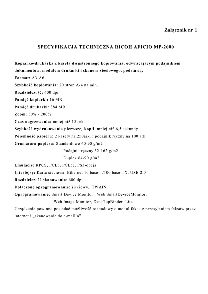 Załącznik nr 1 SPECYFIKACJA TECHICZA RICOH AFICIO MP-2000 Kopiarko-drukarka z kasetą dwustronnego kopiowania, odwracającym podajnikiem dokumentów, modułem drukarki i skanera sieciowego, podstawą. Format: A3-A6 Szybkość kopiowania: 20 stron A-4 na min. Rozdzielczość: 600 dpi Pamięć kopiarki: 16 MB Pamięć drukarki: 384 MB Zoom: 50% - 200% Czas nagrzewania: mniej niż 15 sek. Szybkość wydrukowania pierwszej kopii: mniej niż 6,5 sekundy Pojemność papieru: 2 kasety na 250ark. i podajnik ręczny na 100 ark. Gramatura papieru: Standardowo 60-90 g/m2 Podajnik ręczny 52-162 g/m2 Duplex 64-90 g/m2 Emulacje: RPCS, PCL6, PCL5e, PS3-opcja Interfejsy: Karta sieciowa: Ethernet 10 base-T/100 base-TX, USB 2.0 Rozdzielczość skanowania: 600 dpi Dołączone oprogramowanie: sieciowy, TWAIN Oprogramowanie: Smart Device Monitor , Web SmartDeviceMonitor, Web Image Monitor, DeskTopBinder Lite Urządzenie powinno posiadać możliwość rozbudowy o moduł faksu z przesyłaniem faksów przez internet i „skanowania do e-mail’a”