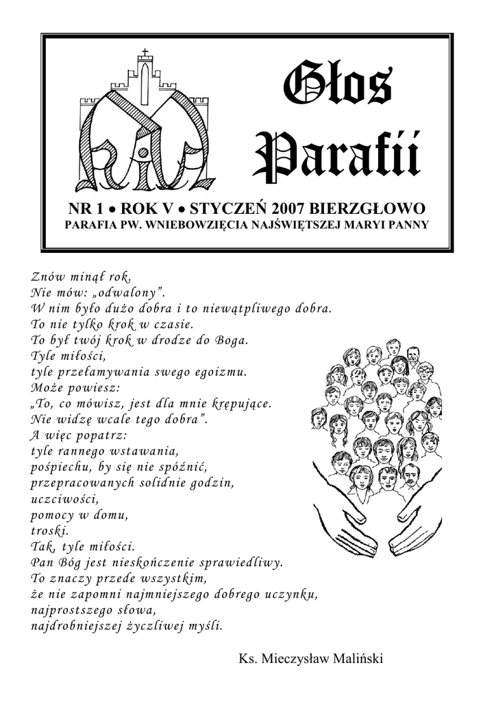Głos Parafii NR 1 ROK V STYCZEŃ 2007 BIERZGŁOWO PARAFIA PW. WNIEBOWZIĘCIA NAJŚWIĘTSZEJ MARYI PANNY Znów minął rok. Nie mów: „odwalony”. W nim było dużo dobra i to niewątpliwego dobra. To nie tylko krok w czasie. To był twój krok w drodze do Boga. Tyle miłości, tyle przełamywania swego egoizmu. Może powiesz: „To, co mówisz, jest dla mnie krępujące. Nie widzę wcale tego dobra”. A więc popatrz: tyle rannego wstawania, pośpiechu, by się nie spóźnić, przepracowanych solidnie godzin, uczciwości, pomocy w domu, troski. Tak, tyle miłości. Pan Bóg jest nieskończenie sprawiedliwy. To znaczy przede wszystkim, że nie zapomni najmniejszego dobrego uczynku, najprostszego słowa, najdrobniejszej życzliwej myśli. Ks. Mieczysław Maliński ZE ŚWIATA Fragment Orędzia Ojca Świętego Benedykta XVI na Światowy Dzień Pokoju 1 stycznia 2007 roku: Na początku nowego roku chciałbym skierować do rządzących i odpowiedzialnych za narody oraz wszystkich ludzi dobrej woli życzenie pokoju. Zwracam się z tym życzeniem przede wszystkim do tych, którzy zaznają bólu i cierpienia, do tych, którym zagraża przemoc i siła oręża, i tych, którzy, pozbawieni wszelkiej godności, oczekują dowartościowania na poziomie ludzkim i społecznym. Kieruję je do dzieci, których niewinność ubogaca ludzkość w dobroć i nadzieję, a ich cierpienie pobudza nas wszystkich, abyśmy zaprowadzali sprawiedliwość i pokój. Właśnie myśląc o dzieciach, zwłaszcza o tych, których przyszłość jest zagrożona przez wyzysk i zło dorosłych, nie mających skrupułów, pragnąłem z okazji Światowego Dnia Pokoju skoncentrować uwagę wszystkich na temacie: Osoba ludzka sercem pokoju. Jestem bowiem przekonany, że gdy szanuje się osobę, umacnia się pokój, a wprowadzając pokój, tworzy się perspektywy dla autentycznego, integralnego humanizmu. W ten sposób przygotowuje się spokojną przyszłość dla następnych pokoleń. Pismo Święte mówi: „Stworzył więc Bóg człowieka na swój obraz, na obraz Boży go stworzył: stworzył mężczyznę i niewiastę” (Rdz 1, 27). Człowiek posiada osobową godność, gdyż został stworzony na obraz Boży; nie jest tylko czymś, ale kimś, zdolnym do poznawania siebie, do panowania nad sobą, do dawania siebie w sposób wolny i do tworzenia wspólnoty z innymi osobami. Równocześnie przez łaskę jest powołany do przymierza ze swoim Stwórcą, do dania Mu odpowiedzi wiary i miłości, jakiej nikt inny nie może za niego dać. W tej wspaniałej perspektywie staje się zrozumiałe zadanie, jakie zostało powierzone istocie ludzkiej – ma ona dojrzewać w zdolności kochania i przyczyniać się do postępu świata oraz jego odnowy w sprawiedliwości i pokoju. Św. Augustyn w syntetycznym stwierdzeniu poucza: „Bóg, który nas stworzył bez naszego udziału, nie chciał zbawić nas bez nas”. Wszystkie zatem istoty ludzkie powinny pielęgnować w sobie świadomość tego podwójnego wymiaru – daru i zadania. Także pokój jest zarazem darem i zadaniem. Jeśli prawdą jest, że pokój między poszczególnymi ludźmi i narodami, zdolność do życia obok siebie w sprawiedliwości i solidarności, wymaga nieustannego wysiłku, jest też prawdą – może nawet w większym stopniu – że pokój jest darem Boga. Pokój jest bowiem cechą Bożego działania, która przejawia się zarówno w stworzeniu uporządkowanego i harmonijnego wszechświata, jak też w odkupieniu ludzkości, która potrzebowała wyprowadzenia z nieporządku grzechu. Stworzenie i odkupienie stanowią zatem klucz do zrozumienia sensu naszego istnienia na ziemi (...). Z ŻYCIA PARAFII STATYSTYKA UDZIELONYCH SAKRAMENTÓW 2004 – 2005 – 2006 w roku 2004 - udzielono 17 chrztów, w roku 2005 – 22, w roku 2006 – 23; w roku 2004 - 26 dzieci przystąpiło do I Komunii św., w roku 2005 – 30, w roku 2006 – tylko 16; w roku 2004 - odbyło się 12 ślubów, w roku 2005 – 13, w roku 2006 - 12; w roku 2006 rozdano 34 tys. Komunii św.; w roku 2006 odwiedzałem w każdy I Piątek miesiąca 21 chorych; 13 października przyjęło sakrament bierzmowania 65 osób; w roku 2004 - odbyło się 12 pogrzebów, w roku 2005 – 13. W roku 2006 do domu Ojca odeszli: 22.01. + Klemens Ordon, l. 78 z Zamku Bierzgłowskiego 23.01. + Felicja Frąc, l. 81 z Łubianki 27.01. + Józefa Dziukowska, l. 67 z Zamku Bierzgłowskiego 27.02. + Tadeusz Dwojak, l. 77 z Czarnego Błota 26.03. + Bogdan Ziółkowski, l. 84 z Łubianki 01.04. + Helena Jaworska, l. 79 z Bierzgłowa 19.04. + Benedykt Klarkowski, l. 56 z Łubianki 25.04. + Dorota Lis, l. 32 z Łubianki 27.05. + Zygmunt Chrzanowski, l. 92 z Bierzgłowa 29.05. + Irena Dwojak, l. 72 z Czarnego Błota 05.06. + Teresa Reichert, l. 73 z Zamku Bierzgłowskiego 05.07. + Józefa Gużyńska, l. 85 z Bierzgłowa 19.07. + Sławonia Zgierska, l. 66 z Łubianki 23.08. + Mieczysław Woźniak, l. 70 z Zamku Bierzgłowskiego 03.09. + Halina Karbowska, l. 88 z Łubianki 16.09. + Zbigniew Jędras, l. 48 z Łubianki 05.10. + Mateusz Pawłowski, l. 20 z Zamku Bierzgłowskiego 13.11 + Józef Chmurzyński, l. 70 z Łubianki 25.11 + Zofia Kurkowska, l. 87 z Łubianki PRACE REMONTOWE W roku 2006 przeprowadziliśmy następujące inwestycje remontowe: 1. Remont organów. Remont zabytkowych organów naszego kościoła, pochodzących z drugiej połowy XIX wieku, przeprowadziła firma p. Wolańskiego. Panom z Firmy ofiarowała schronienie (noclegi i wyżywienie) rodzina z Bierzgłowa. Nasze organy zostały zrobione przez firmę Terleckiego z Elbląga. Jest to bardzo cenny instrument - organy mechaniczne. Zachowany został bez zmian ich stan, gdy instrument był zbudowany. Organy posiadają 6 rejestrów (głosów) i 486 piszczałek. Wymieniono silnik na cichobieżny, produkcji węgierskiej, który umieszczony jest wewnątrz instrumentu. W związku z tym został usunięty kanał powietrzny, który prowadził na strych oraz wykonany nowy miech. Cały ins