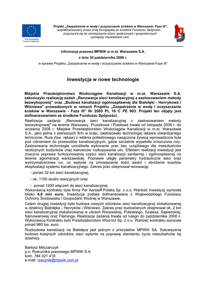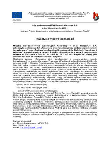 Unia Europejska Fundusz Spójności Projekt „Zaopatrzenie w wodę i oczyszczanie ścieków w Warszawie- Faza III”, współfinansowany przez Unię Europejską ze środków Funduszu Spójności, przyczynia się do zmniejszania różnic społecznych i gospodarczych pomiędzy obywatelami Unii. Informacja prasowa MPWiK w m.st. Warszawie S.A. z dnia 30 października 2008 r. w sprawie Projektu „Zaopatrzenie w wodę i oczyszczanie ścieków w Warszawie-Faza III" Inwestycja w nowe technologie Miejskie Przedsiębiorstwo Wodociągów Kanalizacji w m.st. Warszawie S.A. zakończyło realizację zadań „Renowacja sieci kanalizacyjnej z zastosowaniem metody bezwykopowej" oraz „Budowa kanalizacji ogólnospławnej dla Białołęki - Henrykowa i Wiśniewa" prowadzonych w ramach Projektu „Zaopatrzenie w wodę i oczyszczanie ścieków w Warszawie - Faza III" Nr 2005 PL 16 C PE 003. Projekt ten objęty jest dofinansowaniem ze środków Funduszu Spójności. Realizacja zadania „Renowacja sieci kanalizacyjnej z zastosowaniem metody bezwykopowej" na terenie Warszawy, Pruszkowa i Piastowa trwała od listopada 2006 r. do września 2008 r. Miejskie Przedsiębiorstwo Wodociągów Kanalizacji w m.st. Warszawie S.A., jako jedna z pierwszych firm w kraju, zastosowało technologię rękawa utwardzanego termicznie. Rura (tzw. rękaw) z włókna poliestrowego nasączona żywicą wprowadzona była pod ciśnieniem do przewodów kanalizacyjnych, gdzie szczelnie wypełniła zniszczone rury. Zastosowana technologia umożliwiła wykonanie prac bez uciążliwego dla mieszkańców okolicznych budynków oraz kierowców rozkopywania ulic. Efektem realizacji inwestycji jest znaczna poprawa funkcjonowania części sieci kanalizacji sanitarnej i ogólnospławnej na terenie aglomeracji warszawskiej. Poprawie uległy parametry hydrauliczne sieci oraz wytrzymałościowe rur, co wpłynie na zmniejszenie ilości awarii i obniżenie kosztów eksploatacji systemu kanalizacyjnego. Zakres prac obejmował renowację: - ponad 32 km sieci kanalizacyjnej, - ok. 1100 studni rewizyjnych oraz - ponad 1200 włączeń do sieci kanalizacyjnej. Wykonawcą kontraktu była firma Per Aarsleff Polska Sp. z o.o. Wartość inwestycji wyniosła blisko 4,8 min euro. Inwestycja została dofinansowana z Wojewódzkiego Funduszu Ochrony Środowiska i Gospodarki Wodnej w Warszawie. Celem drugiej inwestycji była budowa nowych odcinków sieci kanalizacyjnej zlokalizowanej w dzielnicy Białołęka - Henryków i Wiśniewo. Zakres prac budowlanych obejmował ok. 2 km sieci kanalizacyjnej zlokalizowanej w ulicach Rozewskiej, Pułaskiego, Szałasa, Sąsiedzkiej, Samowarowej oraz Fleminga. Realizacja zadania trwała od lutego do października 2008 r. Wykonawcą Kontraktu było Przedsiębiorstwo Wod-lnż Sp. z o.o. Wartość kontraktu wyniosła ponad 960 tys. euro. Rozbudowa kanalizacji na Białołęce jest jednym z priorytetów MPWiK SA. Sukcesywna budowa kolejnych odcinków sieci wpłynie na poprawę standardu życia mieszkańców tej dzielnicy. Bartosz Milczarczyk p.o. Rzecznika prasowego MPWiK S.A. kom. 784 021 418 e-mail: [email protected]