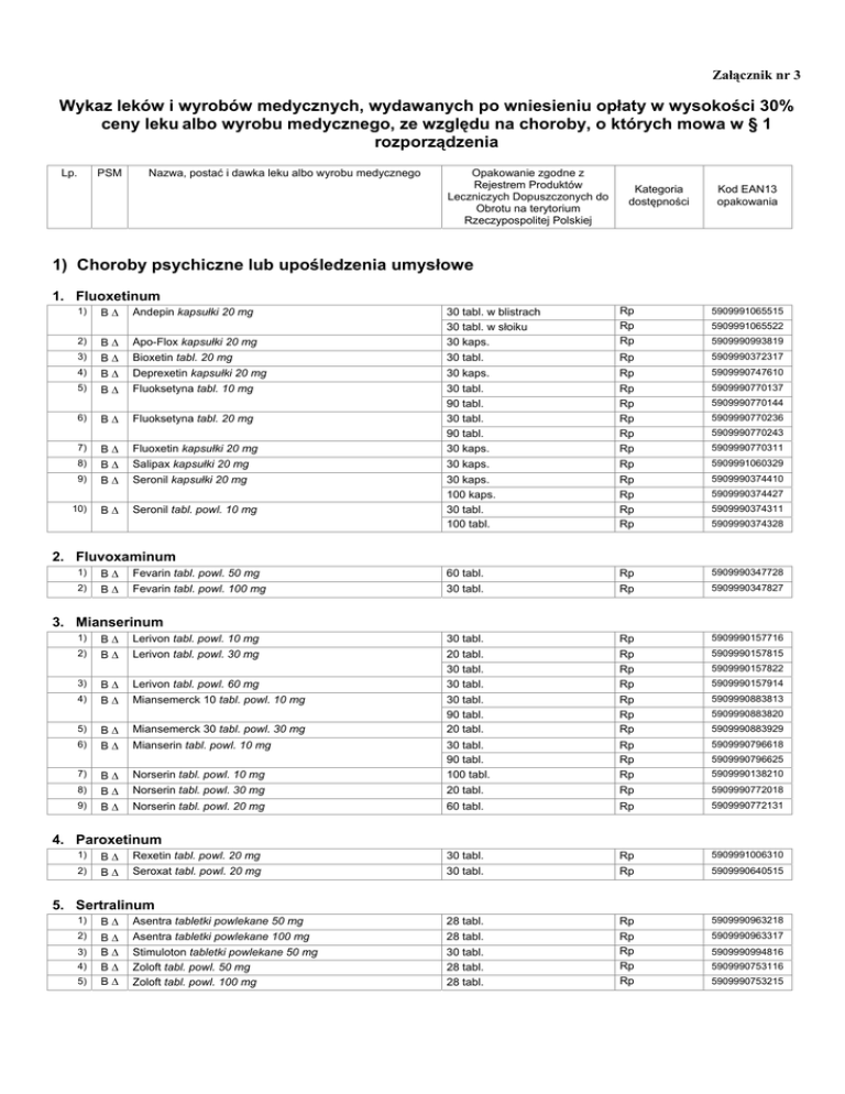 Załącznik nr 3 Wykaz leków i wyrobów medycznych, wydawanych po wniesieniu opłaty w wysokości 30% ceny leku albo wyrobu medycznego, ze względu na choroby, o których mowa w § 1 rozporządzenia Lp. PSM Nazwa, postać i dawka leku albo wyrobu medycznego Opakowanie zgodne z Rejestrem Produktów Leczniczych Dopuszczonych do Obrotu na terytorium Rzeczypospolitej Polskiej Kategoria dostępności Kod EAN13 opakowania 1) Choroby psychiczne lub upośledzenia umysłowe 1. Fluoxetinum Rp Rp Rp 5909991065515 Apo-Flox kapsułki 20 mg 30 tabl. w blistrach 30 tabl. w słoiku 30 kaps. B∆ Bioxetin tabl. 20 mg 30 tabl. Rp 5909990372317 4) B∆ Deprexetin kapsułki 20 mg 30 kaps. Rp 5909990747610 5) B∆ Fluoksetyna tabl. 10 mg 5909990770137 6) B∆ Fluoksetyna tabl. 20 mg Rp Rp Rp Rp Rp 1) B∆ Andepin kapsułki 20 mg 2) B∆ 3) 5909991065522 5909990993819 7) B∆ Fluoxetin kapsułki 20 mg 30 tabl. 90 tabl. 30 tabl. 90 tabl. 30 kaps. 8) B∆ Salipax kapsułki 20 mg 30 kaps. Rp 5909991060329 9) B∆ Seronil kapsułki 20 mg B∆ Seronil tabl. powl. 10 mg Rp Rp Rp Rp 5909990374410 10) 30 kaps. 100 kaps. 30 tabl. 100 tabl. 5909990770144 5909990770236 5909990770243 5909990770311 5909990374427 5909990374311 5909990374328 2. Fluvoxaminum 1) B∆ Fevarin tabl. powl. 50 mg 60 tabl. Rp 5909990347728 2) B∆ Fevarin tabl. powl. 100 mg 30 tabl. Rp 5909990347827 3. Mianserinum 1) B∆ Lerivon tabl. powl. 10 mg 30 tabl. Rp 5909990157716 2) B∆ Lerivon tabl. powl. 30 mg B∆ Lerivon tabl. powl. 60 mg Rp Rp Rp 5909990157815 3) 20 tabl. 30 tabl. 30 tabl. 4) B∆ Miansemerck 10 tabl. powl. 10 mg B∆ Miansemerck 30 tabl. powl. 30 mg Rp Rp Rp 5909990883813 5) 30 tabl. 90 tabl. 20 tabl. 6) B∆ Mianserin tabl. powl. 10 mg B∆ Norserin tabl. powl. 10 mg Rp Rp Rp 5909990796618 7) 30 tabl. 90 tabl. 100 tabl. 8) B∆ Norserin tabl. powl. 30 mg 20 tabl. Rp 5909990772018 9) B∆ Norserin tabl. powl. 20 mg 60 tabl. Rp 5909990772131 5909990157822 5909990157914 5909990883820 5909990883929 5909990796625 5909990138210 4. Paroxetinum 1) B∆ Rexetin tabl. powl. 20 mg 30 tabl. Rp 5909991006310 2) B∆ Seroxat tabl. powl. 20 mg 30 tabl. Rp 5909990640515 5. Sertralinum 1) B∆ Asentra tabletki powlekane 50 mg 28 tabl. Rp 5909990963218 2) B∆ B∆ B∆ B∆ Asentra tabletki powlekane 100 mg 28 tabl. 5909990963317 Stimuloton tabletki powlekane 50 mg Zoloft tabl. powl. 50 mg Zoloft tabl. powl. 100 mg 30 tabl. 28 tabl. 28 tabl. Rp Rp Rp Rp 3) 4) 5) 5909990994816 5909990753116 5909990753215 2) Choroba i zespół Parkinsona 1. Amantadinum 1) B∆ Amantix tabl. powl. 100 mg 2) B∆ Viregyt K kapsułki 100 mg 30 tabl. 100 tabl. 50 kaps. Rp Rp Rp 5909990728411 50 tabl. Rp 5909990193219 5909990728428 5909990320912 2. Biperidenum 1) B∆ Akineton tabl. 2 mg 3. Pergolidum 1) B∆ Permax tabl. 0,05 mg 100 tabl. Rp 5909990738915 2) B∆ Permax tabl. 0,25 mg B∆ Permax tabl. 1 mg Rp Rp Rp 5909990739011 3) 30 tabl. 100 tabl. 30 tabl. 5909990739028 5909990739110 4. Trihexyphenidylum 1) B∆ Parkopan 2 tabl. 2 mg 100 tabl. Rpw 5909990352012 2) B∆ Parkopan 5 tabl. 5 mg 100 tabl. Rpw 5909990352111 3) Choroba Alzheimera 1. Donepezilum 1) B∆ Aricept tabl. powl. 5 mg 28 tabl. Rp 5909990752812 2) B∆ B∆ B∆ B∆ B∆ B∆ B∆ Aricept tabl. powl. 10 mg 28 tabl. 5909990752911 Cogiton 5 tabl. 5 mg Cogiton 10 tabl. 10 mg Donepex tabl. powl. 5 mg Donepex tabl. powl. 10 mg Yasnal tabl. 5 mg Yasnal tabl. 10 mg 28 tabl. 28 tabl. 28 tabl. 28 tabl. 28 tabl. 28 tabl. Rp Rp Rp Rp Rp Rp Rp 28 kaps. 56 kaps. 28 kaps. 56 kaps. 28 kaps. Rp Rp Rp Rp Rp 5909990781416 28 kaps. 56 kaps. 1 butelka 120 ml Rp Rp Rp 5909990781317 56 tabl. Rp 5909990760619 1 fiol. s.subst. +rozp. Rp 5909990236718 1 fiol. s.subst. +rozp. Rp 5909990236817 Ditropan tabl. 5 mg 30 tabl. Rp 5909990163519 Driptane tabl. 5 mg 30 tabl. Rp 5909990783823 3) 4) 5) 6) 7) 8) 5909991024314 5909991024413 5909991055912 5909991056018 5909990993215 5909990993314 2. Rivastigminum 1) B∆ Exelon kapsułki 6 mg 2) B∆ Exelon kapsułki 3 mg 3) B∆ Exelon kapsułki 1,5 mg 4) B∆ Exelon kapsułki 4,5 mg 5) B∆ Exelon roztwór do picia 2 mg/ml 5909990781423 5909990781218 5909990781225 5909990781119 5909990781324 5909990454310 4) Stwardnienie zanikowe boczne 1. Riluzolum 1) B∆ Rilutek tabl. powl. 50 mg 5) Stwardnienie rozsiane 1. Methylprednisolonum 1) B 2) B Solu Medrol liofilizat i rozp. do sporządzenia roztworu do wstrzykiwań 500 mg Solu Medrol liofilizat i rozp. do sporządzenia roztworu do wstrzykiwań 1000 mg 2. Oxybutyninum 1) 2) B∆ B∆ 60 tabl. Rp 5909990783816 1 butelka 5 ml Rp 5909990661329 30 tabl. 28 tabl. 30 tabl. 4 tabl. 30 tabl. w blistrach 30 tabl. w pojemniku 28 tabl. w blistrach 28 tabl. w butelce 28 tabl. w fiolce 28 tabl. 56 tabl. Rp Rp Rp Rp Rp Rp Rp Rp Rp Rp Rp 5909990919017 5 amp. 1 ml 10 amp. 1 ml 5 amp. 1 ml 10 amp. 1 ml 5 amp. 1 ml 5 amp. 1 ml 5 amp. 1 ml 5 amp. 1 ml Rp Rp Rp Rp Rp Rp Rp Rp 5909990332816 1 fl. 20 ml 1 poj. 10 ml (200 dawek) Rp Rp 5909990322114 20 amp. 1 ml 20 amp. 2 ml Rp Rp 5909990977710 28 tabl. 28 tabl. 28 tabl. Rp Rp Rp 5909990795727 28 tabl. w blistrach 56 tabl. w blistrach Rp Rp 5909990771912 6) Jaskra 1. Dorzolamidum 1) B∆ Trusopt krople do oczu, roztwór 20 mg/ml 7) Osteoporoza 1. Acidum alendronicum 1) 5) B B B B B Alenato tabl. 10 mg Lindron tabl. 10 mg Osalen tabl. 10 mg Ostemax 70 comfort tabl. 70 mg Ostenil tabl. 10 mg 6) B Ostolek tabl. powl. 10 mg 2) 3) 4) 7) B Rekostin tabl. 10 mg 5909990920129 5909990818419 5909991081713 5909990496419 5909990496426 5909990950911 5909990950928 5909990950935 5909990933419 5909990933426 2. Calcitoninum salmonis 1) B Calcihexal 50 roztwór do wstrzykiwań podskórnych, domięśniowych i dożylnych 50 j.m./ml 2) B Calcihexal 100 roztwór do wstrzykiwań podskórnych, domięśniowych i dożylnych 100 j.m./ml 3) B B B B Calcitonin 50 płyn do wstrzykiwań 50 j.m./1 ml Calcitonin 100 płyn do wstrzykiwań 100 j.m./1 ml Tonocalcin roztwór do wstrzykiwań 50 j.m/ml Tonocalcin roztwór do wstrzykiwań 100 j.m/ml 4