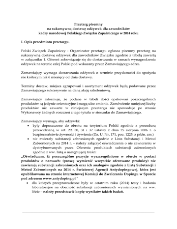 Przetarg pisemny na sukcesywną dostawę odżywek dla zawodników kadry narodowej Polskiego Związku Zapaśniczego w 2014 roku I. Opis przedmiotu przetargu. Polski Związek Zapaśniczy - Organizator przetargu ogłasza pisemny przetarg na sukcesywną dostawę odżywek dla zawodników Związku zgodnie z tabelą zawartą w załączniku 1. Oferent zobowiązuje się do dostarczania w ramach wynagrodzenia odżywek na terenie całej Polski pod wskazany przez Zamawiającego adres. Zamawiający wymaga dostarczania odżywek o terminie przydatności do spożycia nie krótszym niż 6 miesięcy od dnia dostawy. Terminy dostaw, miejsca zgrupowań i asortyment odżywek będą podawane przez Zamawiającego sukcesywnie na daną akcję szkoleniową. Zamawiający informuje, że podane w tabeli ilości opakowań poszczególnych produktów są jedynie orientacyjne i mogą ulec zmianie. Zamówienie mniejszej liczby produktów niż zawarte w niniejszym przetargu nie spowoduje po stronie Wykonawcy żadnych roszczeń z tego tytułu w stosunku do Zamawiającego. Zamawiający wymaga, aby odżywki: były dopuszczone do obrotu na terytorium Polski zgodnie z procedurą przewidzianą w art. 29, 30, 31 i 32 ustawy z dnia 25 sierpnia 2006 r. o bezpieczeństwie żywności i żywienia (Dz. U. Nr. 171, poz. 1225, z późn. zm.) nie zwierały substancji zabronionych zgodnie z Lista Substancji i Metod Zabronionych na 2014 r. – należy załączyć oświadczenia o nie zawieraniu w dystrybuowanych przez Oferenta produktach substancji zabronionych zgodnie z ww. listą o następującej treści: „Oświadczam, iż poszczególne pozycje wyszczególnione w ofercie w postaci produktów o nazwach: (proszę wymienić wszystkie oferowane produkty) nie zawierają substancji zabronionych oraz ich analogów zgodnie z Listą Substancji i Metod Zabronionych na 2014 r. Światowej Agencji Antydopingowej, która jest opublikowana na stronie internetowej Komisji do Zwalczania Dopingu w Sporcie pod adresem www.antydoping.pl " dla których przeprowadzone były w ostatnim roku (2014) testy i badania laboratoryjne na obecność substancji zabronionych wymienionych na ww. liście – należy przedstawić kopię wyników takich badań. ____________________________________________________________________________________________________ II. Warunki udziału w przetargu oraz opis sposobu dokonywania oceny spełniania tych warunków. W przetargu może wziąć udział Uczestnik/Oferent, który spełnia następujące warunki: 1. Nie zalega z zapłatą podatków i składek na ubezpieczenie społeczne i przedstawi aktualne zaświadczenie właściwego naczelnika urzędu skarbowego oraz właściwego oddziału Zakładu Ubezpieczeń Społecznych lub Kasy Rolniczego Ubezpieczenia Społecznego potwierdzające odpowiednio, że Uczestnik nie zalega z opłacaniem podatków, opłat oraz składek na ubezpieczenie zdrowotne lub społeczne. 2. Jest podmiotem nieprzerwanie działającym na terytorium RP, od co najmniej 5 lat i posiadającym siedzibę na terytorium RP i przedstawi aktualny odpis z właściwego rejestru sądowego albo aktualne zaświadczenie o wpisie do ewidencji działalności gospodarczej. 3. Wykaże się realizacją w okresie ostatnich 3 lat przed dniem ogłoszenia przetargu, a jeżeli okres prowadzenia działalności jest krótszy w tym okresie wykonaniem co najmniej dwóch zamówień polegających dostawie odżywek dla polskich związków sportowych na kwotę minimum 50.000,00 zł każda. Warunki opisane w pkt. 1 – 3 będą oceniane przez Zamawiającego na podstawie przedstawionych przez Uczestnika dokumentów według zasady spełnia/ nie spełnia. Oferta Uczestnika nie spełniającego któregokolwiek z tych warunków lub niezawierająca któregokolwiek z dokumentów zostanie odrzucona. Organizator zastrzega możliwość zmiany zarówno warunków jak i treści ogłoszenia. III. Informacje o sposobie porozumiewania się stron. W niniejszym przetargu wszelkie oświadczenia, wnioski, zawiadomienia oraz informacje przekazywane są przez strony pisemnie. Zawiadomienie o odrzuceniu ofert, wyborze oferty ewentualnie unieważnieniu postępowania, będą przesyłane również faksem. Osobą uprawnioną przez do kontaktowania się z Uczestnikami jest dr n. o zdr. inż. Krzysztof Durkalec-Michalski tel. 531 010 098, e-mail: [email protected] IV. Termin związania ofertą. Termin związania ofertą wynosi 30 dni. ____________________________________________________________________________________________________ V. Opis sposobu przygotowania oferty oraz oświadczeń i dokumentów załączonych do oferty. 1. Treść oferty musi odpowiadać treści ogłoszenia. 2. Oferta musi być złożona pod rygorem nieważności, w formie pisemnej, w języku polskim. Zaleca się złożenie oferty przy wykorzystaniu wzoru stanowiącego załącznik nr 1 do ogłoszenia. 3. Oferta oraz wszystkie załączniki do oferty stanowiące oświadczenia Uczestnika muszą być podpisane przez osobę upoważnioną do reprezentowania Uczestnika, zgodnie z formą reprezentacji określoną w Krajowym Rejestrze Sądowym lub innym dokumencie, właściwym dla jego formy organizacyjnej. Upoważnienie do podpisania oferty musi być dołączone do oferty, o ile nie wynika ono z innych dokumentów załączonych do oferty. 4. Wymagane dokumenty oraz oświadczenia mogą być składane w formie oryginału albo kserokopii poświadczonej za zgodność z oryginałem przez Uczestnika. 5. Wszelkie poprawki lub zmiany w tekście oferty muszą być parafowane własnoręcznie przez osobę podpisującą ofertę. 6. Przedstawienie propozycji rozwiązań alternatywnych lub wariantowych nie będzie brane pod uwagę i spowoduje odrzucenie oferty. 7. Uczestnicy ponoszą wszelkie koszty związane z przygotowaniem i złożeniem ofert. 8. W przypadku przesłania oferty wraz z wymaganymi oświadczeniami i dokumentami drogą pocztową, za termin złożenia oferty przyjmuje się termin, w którym oferta (przesyłka) znalaz