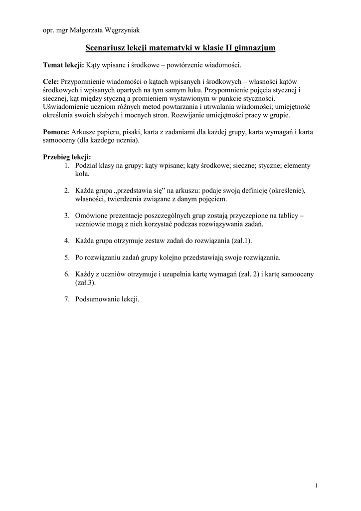 opr. mgr Małgorzata Węgrzyniak Scenariusz lekcji matematyki w klasie II gimnazjum Temat lekcji: Kąty wpisane i środkowe – powtórzenie wiadomości. Cele: Przypomnienie wiadomości o kątach wpisanych i środkowych – własności kątów środkowych i wpisanych opartych na tym samym łuku. Przypomnienie pojęcia stycznej i siecznej, kąt między styczną a promieniem wystawionym w punkcie styczności. Uświadomienie uczniom róŜnych metod powtarzania i utrwalania wiadomości; umiejętność określenia swoich słabych i mocnych stron. Rozwijanie umiejętności pracy w grupie. Pomoce: Arkusze papieru, pisaki, karta z zadaniami dla kaŜdej grupy, karta wymagań i karta samooceny (dla kaŜdego ucznia). Przebieg lekcji: 1. Podział klasy na grupy: kąty wpisane; kąty środkowe; sieczne; styczne; elementy koła. 2. KaŜda grupa „przedstawia się” na arkuszu: podaje swoją definicję (określenie), własności, twierdzenia związane z danym pojęciem. 3. Omówione prezentacje poszczególnych grup zostają przyczepione na tablicy – uczniowie mogą z nich korzystać podczas rozwiązywania zadań. 4. KaŜda grupa otrzymuje zestaw zadań do rozwiązania (zał.1). 5. Po rozwiązaniu zadań grupy kolejno przedstawiają swoje rozwiązania. 6. KaŜdy z uczniów otrzymuje i uzupełnia kartę wymagań (zał. 2) i kartę samooceny (zał.3). 7. Podsumowanie lekcji. 1 Załącznik 1 ZADANIA DO ROZWIĄZANIA W GRUPIE 1. Oblicz miarę kąta α: 40º α 2. Oblicz miarę kąta środkowego opartego na ¼ okręgu. Ile stopni ma kąt wpisany oparty na tym łuku? 3. Oblicz miarę kąta α: α 50º 4. Które zdanie jest fałszywe: A. Styczna ma jeden punkt wspólny z okręgiem. B. Miara kata, jaki tworzy styczna do okręgu z promieniem o końcu w punkcie styczności to 25% miary kąta pełnego. C. Sieczna moŜe mieć trzy punkty wspólne z okręgiem. D. Przez punkt leŜący na okręgu przechodzi tylko jedna styczna. 5. Oblicz miary kątów trójkąta ABC wpisanego w okrąg o promieniu 3 cm, jeŜeli jeden z jego boków ma długość 6 cm, a jeden z jego kątów ma miarę 55º. 6. Oblicz miarę kąta β: 20º O β 7. WskaŜ na rysunku odcinki równej długości: E D C O A B 8. Przekątne czworokąta wpisanego w koło przecinają się w środku okręgu. Jaki to czworokąt? 9. Podaj, jaką miarę ma kąt wewnętrzny ośmiokąta foremnego. 10. Kuba narysował okrąg, ale nie zaznaczył jego środka. Jak moŜe konstrukcyjnie znaleźć ten środek? 2 Załącznik 2 KARTA WYMAGAŃ Ocena, poziom wymagań Osiągnięcia 2 Potrafię wskazać i narysować kąt środkowy i wpisany. 2 Wskazuję sieczna i styczną okręgu. 2 Znam pojęcie wielokąta opisanego na kole. 2 Wskazuję wielokąty opisane na kole. 2 RozróŜniam wielokąty opisane na kole. 2 Wskazuję wielokąty wpisane w koło. 2 RozróŜniam wielokąty wpisane w koło. 3 Zdefiniuję pojęcie kąta wpisanego i środkowego. 3 Obliczę miarę kata środkowego lub wpisanego opartych na tym samym łuku, jeŜeli dana jest miara jednego z nich. Potrafię wyróŜnić wszystkie moŜliwe wzajemne połoŜenia prostej i okręgu. Znam własności wielokątów foremnych. 3 3 4 4 Potrafię obliczyć miarę kąta środkowego w zaleŜności od łuku, na którym jest oparty. Dowiodę, Ŝe kąt wpisany oparty na półokręgu jest kątem prostym. 4 Znam własności stycznej i siecznej. 5 5 5 6 6 Umiem („+”), nie umiem („-”) Rozwiązuję zadania problemowe dotyczące kata środkowego i wpisanego. Potrafię wykonać konstrukcję stycznej do okręgu przechodzącej przez dany punkt. Wyznaczam wzór na wysokość trójkąta równobocznego opisanego i wpisanego w koło. Opisze i uzasadnię poprawność konstrukcji stycznej do okręgu przechodzącej przez dany punkt. Stosuję poznane wiadomości i umiejętności do rozwiązywania zadań problemowych. Załącznik 3 KARTA WYMAGAŃ Lp 1. 2. 3. 4. Nazwa czynności Przedstawienie grupowe Skala Nie brałem Pisałem Pomagałem w Byłem autorem udziału sformułowaniu pomysłu 0 1 2 3 Rozwiązywanie zadań z Nie brałem Składałem Brałem udział Byłem zestawu udziału propozycje w analizie pomysłodawcą rozwiązania 0 1 2 3 Karta z wymaganiami Moja karta jest Dokonałem Uzupełniłem Potrafię pusta pierwszych całą kartę wskazać swoje wpisów na braki i karcie osiągnięcia 0 1 2 3 W której fazie pracy grupowej najlepiej funkcjonowałeś? Jaka role wtedy pełniłeś? 3 4