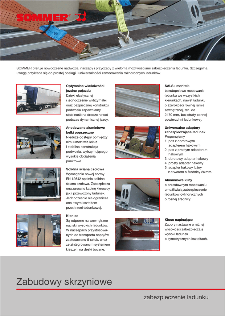 SOMMER oferuje nowoczesne nadwozia, naczepy i przyczepy z wieloma możliwościami zabezpieczenia ładunku. Szczególną uwagę przykłada się do prostej obsługi i uniwersalności zamocowania różnorodnych ładunków. Optymalne właściwości jezdne pojazdu Dzięki elastycznej i jednocześnie wytrzymałej oraz bezpiecznej konstrukcji podwozia zapewniamy stabilność na drodze nawet podczas dynamicznej jazdy. SALS umożliwia bezstopniowe mocowanie ładunku we wszystkich kierunkach, nawet ładunku o szerokości równej ramie zewnętrznej, tzn. do 2470 mm, bez straty cennej powierzchni ładunkowej. Anodowane aluminiowe belki poprzeczne Nieduże odstępy pomiędzy nimi umożliwia lekka i stabilna konstrukcja podwozia, wytrzymującego wysokie obciążenia punktowe. Uniwersalne adaptery zabezpieczające ładunek Proponujemy 1. pas z obrotowym adapterem hakowym 2. pas z prostym adapterem hakowym 3. obrotowy adapter hakowy 4. prosty adapter hakowy 5. adapter hakowy luźny z otworem o średnicy 26 mm. Solidna ściana czołowa Wymagania nowej normy EN 12642 spełnia solidna ściana czołowa. Zabezpiecza ona zarówno kabinę kierowcy jak i przewożony ładunek. Jednocześnie nie ogranicza ona swym kształtem przestrzeni ładunkowej. Kłonice Są odporne na wewnętrzne naciski wysokich ładunków. W naczepach przystosowanych do transportu napojów zastosowano 5 sztuk, wraz ze zintegrowanym systemem kieszeni na deski boczne. Aluminiowe kliny o przestawnym mocowaniu umożliwiają zabezpieczenie ładunków cylindrycznych o różnej średnicy. Kloce napinające Zapory nastawne o różnej wysokości zabezpieczają wysoki ładunek o symetrycznych kształtach. Zabudowy skrzyniowe zabezpieczenie ładunku Kieszenie na deski z drewna lub aluminium z zabezpieczeniem hakowym 100/15 mm. Ścianka działowa do oddzielania i zabezpieczania różnorodnych ładunków przyjmuje wysokie siły ścinające do 10 t. Wanna do zabezpieczania ładunków w kręgach Segmentowe ułożenie klinów i ich mała masa własna dzięki zastosowaniu aluminium podpiera ładunki w kręgach do 25 t. Pojazdy marki SOMMER spełniają normy bezpieczeństwa VDI 2700, DC 9.5 oraz 12624-XL. Deska G1 to alternatywa dla burt klasycznych. Przenosi obciążenia bez odkształceń bocznych dzięki zamocowaniu w profilu podłogowym SALS i kłonicach bocznych. W połączeniu z deskami aluminiowymi tworzy burtę o wysokości do 450 mm. Deska dystansowa do zabezpieczenia palet. W przypadku, gdy są nieużywane, można je wygodnie umieścić pod składanym zderzakiem bocznym. Tylny schowek na narzędzia, pasy i kliny do mocowania ładunku. Profil SALS Nie tylko w zabudowach plandekowych, ale również w zabudowach stałych można stosować profil SALS do mocowania ładunku. Prospekt ten informuje tylko o niektórych możliwościach zabezpieczania ładunku w pojazdach marki SOMMER. Jako jeden z czołowych producentów naczep, przyczep i zabudów wciąż wdrażamy nowe rozwiązania konstrukcyjne, w tym wiele na życzenie naszych Klientów. Dajemy Wam możliwość własnej indywidualnej konfiguracji pojazdu dzięki systemowi modułowej konstrukcji. Zapraszamy do zapoznania się z naszą ofertą i wybrania pojazdu spełniającego Wasze oczekiwania. Sommer Polska Sp. z o.o. Zapole 79 / 4 98 - 275 Brzeżnio Tel. +48 (0) 43 / 820 35 10 Fax +48 (0) 43 / 820 35 11 E-Mail: [email protected] www.sommer.pl