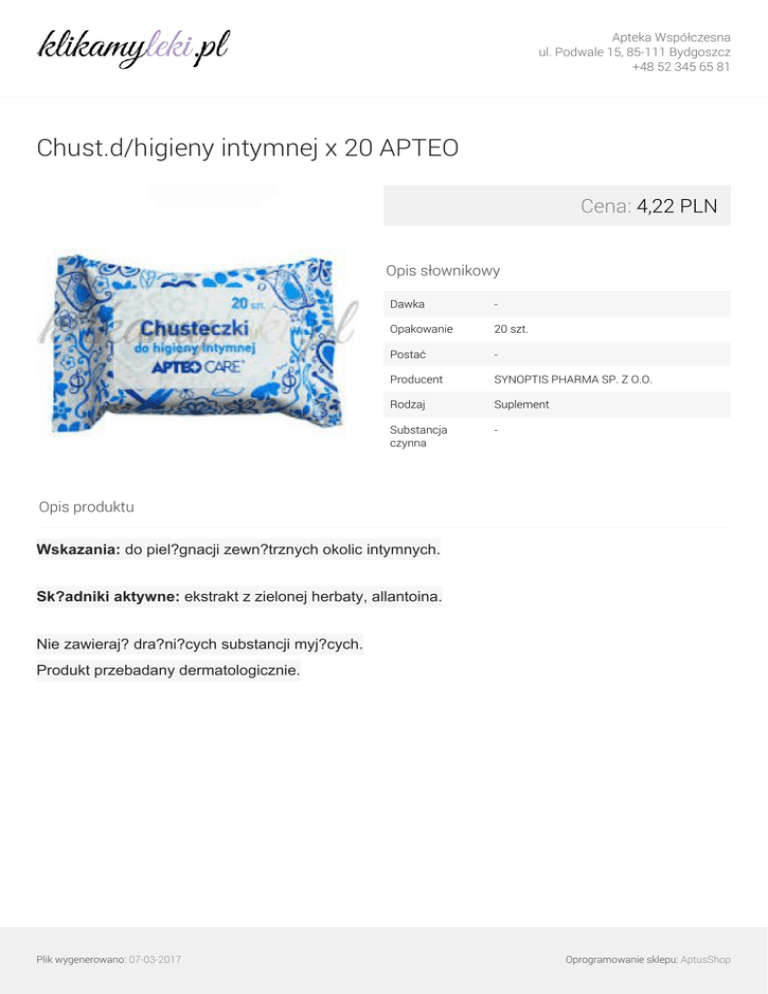 Apteka Współczesna ul. Podwale 15, 85-111 Bydgoszcz +48 52 345 65 81 Chust.d/higieny intymnej x 20 APTEO Cena: 4,22 PLN Opis słownikowy Dawka - Opakowanie 20 szt. Postać - Producent SYNOPTIS PHARMA SP. Z O.O. Rodzaj Suplement Substancja czynna - Opis produktu Wskazania: do piel?gnacji zewn?trznych okolic intymnych. Sk?adniki aktywne: ekstrakt z zielonej herbaty, allantoina. Nie zawieraj? dra?ni?cych substancji myj?cych. Produkt przebadany dermatologicznie. Plik wygenerowano: 07-03-2017 Powered by TCPDF (www.tcpdf.org) Oprogramowanie sklepu: AptusShop