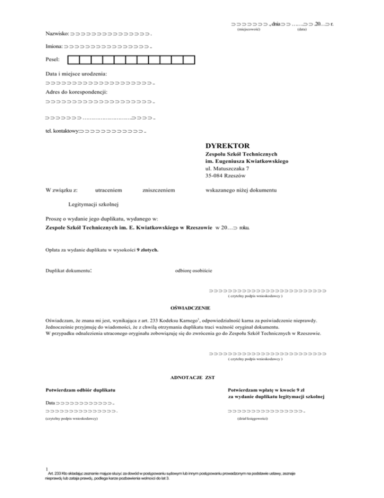 …………………., dnia ………….…….20……r. (miejscowość) Nazwisko: ………………………………………. (data) Imiona: ………………………………………….. Pesel: Data i miejsce urodzenia: …………………………………………………….. Adres do korespondencji: …………………………………………………….. ………………………………………….………….. tel. kontaktowy:……………………………….. DYREKTOR Zespołu Szkół Technicznych im. Eugeniusza Kwiatkowskiego ul. Matuszczaka 7 35-084 Rzeszów W związku z: utraceniem zniszczeniem wskazanego niżej dokumentu Legitymacji szkolnej Proszę o wydanie jego duplikatu, wydanego w: Zespole Szkół Technicznych im. E. Kwiatkowskiego w Rzeszowie w 20…… roku. Opłata za wydanie duplikatu w wysokości 9 złotych. Duplikat dokumentu: odbiorę osobiście ………………………………………………………………… ( czytelny podpis wnioskodawcy ) OŚWIADCZENIE Oświadczam, że znana mi jest, wynikająca z art. 233 Kodeksu Karnego1, odpowiedzialność karna za poświadczenie nieprawdy. Jednocześnie przyjmuję do wiadomości, że z chwilą otrzymania duplikatu traci ważność oryginał dokumentu. W przypadku odnalezienia utraconego oryginału zobowiązuję się do zwrócenia go do Zespołu Szkół Technicznych w Rzeszowie. ………………………………………………………………… ( czytelny podpis wnioskodawcy ) ADNOTACJE ZST Potwierdzam odbiór duplikatu Potwierdzam wpłatę w kwocie 9 zł za wydanie duplikatu legitymacji szkolnej Data ……………………………….. ………………………………………. (czytelny podpis wnioskodawcy) ………………………………………….. (dział księgowości) 1 Art. 233 Kto składając zeznanie mające służyć za dowód w postępowaniu sądowym lub innym postępowaniu prowadzonym na podstawie ustawy, zeznaje nieprawdę lub zataja prawdę, podlega karze pozbawienia wolności do lat 3.