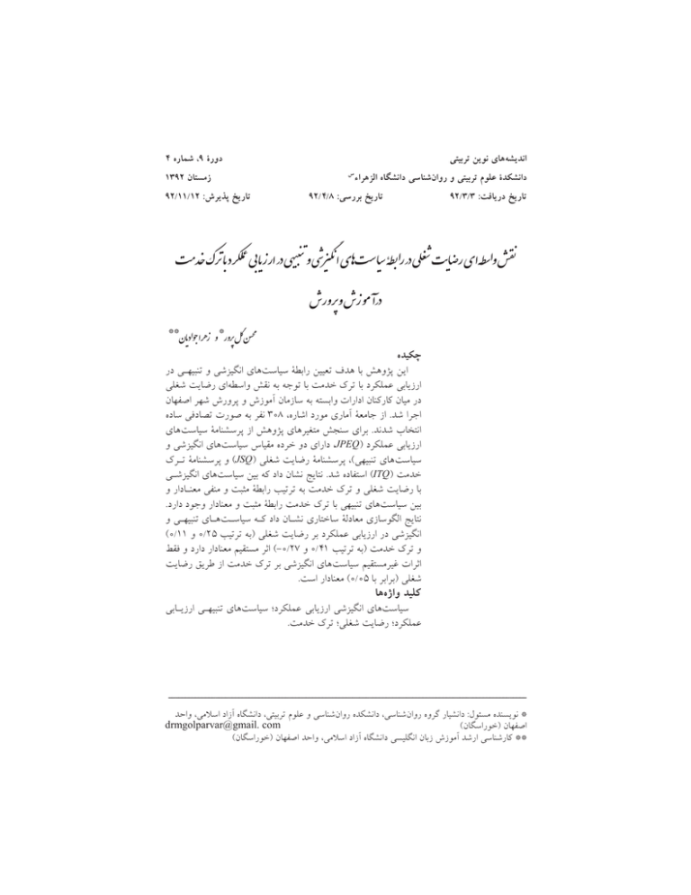 Ñ ƵŹŚưƃ Ö şŹƹŵ ƾŤǀŝźţ ƲƿƺƳ ƽŚƷƶƄƿŶƳř Ž ÎÐÖÏ ƱŚŤƀƯŻ ÖÏ/ÎÎ/ÎÏ :ƁźƿŸě ŲƿŹŚţ د ŌřźƷżƫř ƵŚĮƄƳřŵ ƾſŚƴƃƱřƹŹ ƹ ƾŤǀŝźţ ƭƺƬƗ şŶƨƄƳřŵ ÖÏ/Ñ/Õ :ƾſŹźŝ ŲƿŹŚţ ارزﯾ و ا ÖÏ/Ð/Ð :ŢƟŚƿŹŵ ŲƿŹŚţ Ɣ را وا ا ر زشو ورش ٢ ** ز ا ادﯾن1ور* و ƵŶǀƨģ Źŵ ƾºƸǀŞƴţ ƹ ƾƃżǀĮƳř ƽŚƷŢſŚǀſ ŠƐŝřŹ ƲǀǀƘţ ƝŶƷ Śŝ ƂƷƹĦě Ʋƿř ƾƬƜƃ ŢƿŚƋŹ ƽřƶƐſřƹ ƂƤƳ ƶŝ ƶūƺţ Śŝ ŢƯŶų ƥźţ Śŝ ŵźƨƬưƗ ƾŝŚƿŻŹř ƱŚƸƠƇř źƸƃ ƁŹƹźě ƹ ƁŻƺƯō ƱŚƯŻŚſ ƶŝ ƶŤƀŝřƹ šřŹřŵř ƱŚƴƧŹŚƧ ƱŚǀƯ Źŵ ƵŵŚſ ƾƟŵŚƈţ šŹƺƇ ƶŝ źƠƳ èåí ƵŹŚƃř ŵŹƺƯ ƽŹŚƯō ŠƘƯŚū Żř .Ŷƃ řźūř ƽŚƷŢſŚǀſ ŠƯŚƴƄſźě Żř ƂƷƹĦě ƽŚƷźǀƜŤƯ ƂŬƴſ ƽřźŝ .ŶƳŶƃ śŚŴŤƳř ƹ ƾƃżǀĮƳř ƽŚƷŢſŚǀſ ŽŚǀƤƯ Ƶŵźų ƹŵ ƽřŹřŵ JPEQ) ŵźƨƬưƗ ƾŝŚƿŻŹř ƥźºţ ŠƯŚƴƄſźě ƹ (JSQ) ƾƬƜƃ ŢƿŚƋŹ ŠƯŚƴƄſźě (ƾƸǀŞƴţ ƽŚƷŢſŚǀſ ƾºƃżǀĮƳř ƽŚƷŢſŚǀſ Ʋǀŝ ƶĩ ŵřŵ ƱŚƄƳ ŪƿŚŤƳ .Ŷƃ ƵŵŚƠŤſř (ITQ) ŢƯŶų ƹ ŹřŵŚºƴƘƯ ƾƠƴƯ ƹ ŢŞŨƯ ŠƐŝřŹ Ŝǀţźţ ƶŝ ŢƯŶų ħźţ ƹ ƾƬƜƃ ŢƿŚƋŹ Śŝ .ŵŹřŵ ŵƺūƹ ŹřŵŚƴƘƯ ƹ ŢŞŨƯ ŠƐŝřŹ ŢƯŶų ħźţ Śŝ ƾƸǀŞƴţ ƽŚƷŢſŚǀſ Ʋǀŝ ƹ ƾºƸǀŞƴţ ƽŚºƷŢºſŚǀſ ƶºƧ ŵřŵ ƱŚºƄƳ ƽŹŚŤųŚſ ŠƫŵŚƘƯ ƽŻŚſƺĮƫř ŪƿŚŤƳ (å/ææ ƹ å/çê Ŝǀţźţ ƶŝ) ƾƬƜƃ ŢƿŚƋŹ źŝ ŵźĪƬưƗ ƾŝŚƿŻŹř Źŵ ƾƃżǀĮƳř ƎƤƟ ƹ ŵŹřŵ ŹřŵŚƴƘƯ ƮǀƤŤƀƯ źŧř (å/çì ƹ å/éæ Ŝǀţźţ ƶŝ) ŢƯŶų ħźţ ƹ ŢƿŚƋŹ ƢƿźƏ Żř ŢƯŶų ħźţ źŝ ƾƃżǀĮƳř ƽŚƷŢſŚǀſ ƮǀƤŤƀƯźǀƛ šřźŧř .Ţſř ŹřŵŚƴƘƯ (å/åê Śŝ źŝřźŝ) ƾƬƜƃ ﻛﻠﻴﺪ واژهﻫﺎ ƾŝŚºƿŻŹř ƾºƸǀŞƴţ ƽŚƷŢſŚǀſ ŵźƨƬưƗ ƾŝŚƿŻŹř ƾƃżǀĮƳř ƽŚƷŢſŚǀſ .ŢƯŶų ƥźţ ƾƬƜƃ ŢƿŚƋŹ ŵźƨƬưƗ ººººººººººººººººººººººººººººººººººººººººººººººººººººººººººººººººººººººººººººººººººººººººººººººººººººººººººº واﺣﺪ، داﻧﺸﮕﺎه آزاد اﺳﻼﻣﻲ، داﻧﺸﻜﺪه روانﺷﻨﺎﺳﻲ و ﻋﻠﻮم ﺗﺮﺑﻴﺘﻲ، داﻧﺸﻴﺎر ﮔﺮوه روانﺷﻨﺎﺳﻲ:* ﻧﻮﻳﺴﻨﺪه ﻣﺴﺌﻮل drmgolparvar@gmail. com (اﺻﻔﻬﺎن )ﺧﻮراﺳﮕﺎن ( واﺣﺪ اﺻﻔﻬﺎن )ﺧﻮراﺳﮕﺎن،** ﻛﺎرﺷﻨﺎﺳﻲ ارﺷﺪ آﻣﻮزش زﺑﺎن اﻧﮕﻠﻴﺴﻲ داﻧﺸﮕﺎه آزاد اﺳﻼﻣﻲ Ñ ƵŹŚưƃ / Ö şŹƹŵ ƾŤǀŝźţ ƲƿƺƳ ƽŚƷƶƄƿŶƳř ÎÍ ƶƯŶƤƯ Ƶŵƺºŝ ƱŚºƀƳř ƾĭŶƳŻ Żř źƿŸěŚƳƾƿřŶū ƾŗżū źƄŝ šŚǀů ƹ ŢƤƬų ŻŚƛō ƱŚưƷ Żř ƁLjţ ƹ ŹŚƧ ƽŹŚºƧ šŚºƀſŒƯ ƹ ŚºƷŵŚƸƳ ƽźºǀĭƪƨºƃ ƹ ƾƳŚƀƳř šŚƗŚưŤūř ƽźǀĭƪƨƃ Śŝ ƩŚů Ʋƿř Śŝ .Ţſř Źŵ ƪºŝŚƤŤƯ ŵřŵŹřźºƣ Ʀºƿ ƾºƏ ƹ ƵŶºƯōŹŵ ŚºƷŵŚƸƳ ƹ ŚƷƱŚƯŻŚſ ƭřŶŴŤſř ƶŝ ŵřźƟř Żř ƾƳřƹřźƟ ŵřŶƘţ ƽŹŚƧ Ǝƿřźƃ ƹ ŹŚƧ ŶƳƹŹ Ʋƿř ƾƏ .ŶƳŶƃ ƩƺƜƄƯ ŹŚƧ ƶŝ šŶƯ ƾƳLJƺƏ Śţ ƵŚţƺƧ ƾƳŚƯŻ ƽŚƷƵŹƹŵ řŹ ƹř ƾŤƿŚºƋŹŚƳ ƹ ŢƿŚƋŹ ƽŚƷƶƴǀƯŻ źƄŝ ƾĭŶƳŻ Ǝƿřźƃ źĮƿŵ ƱŚſ ƶŝ żǀƳ ŵřźƟř ƪƜƃ ƵĦƿƹ ƶŝ ƹ ƾţŚºƗLjƏř ƹ ƾºưƬƗ ƾƿŚƟƺƨºƃ ƽŚºƷƵŹƹŵ ƶºŝ ƽźƄŝ ƖƯřƺū ŵƹŹƹ Śŝ Ŝǀţźţ ƲƿŶŝ ƹ ŵźƧ ƮƷřźƟ ƾºƄƷƹĦě ƹ ƾºưƬƗ ƱƺºŤƯ ŠºƇźƗ ƶºŝ Śºě ÏŢƯŶºų ƶºŝ ƪƿŚưţ ƹ ÎƾƬƜƃ ŢƿŚƋŹ źǀƔƳ ƾƿŚƷƵĥřƹ ŽŚººſřźŝ ƹ) ƾººƃźĮƳ ƹ ƾŤųŚƴººƃ ƂƴººƧřƹ ƾººƟźƘƯ ƹŶººŝ ƱŚººưƷ Żř ƾƬƜººƃ ŢƿŚººƋŹ .ŶƴŤººƃřŸĭ ŢƿřŶºƷ řŹ ŵřźºƟ ŹŚºŤƟŹ ƶºƧ ŵƺƃƾƯ śƺƀŰƯ ƪƜƃ ƶŝ (ƾƠƏŚƗ ƂƴƧřƹ Ʀƿ źţƲƿƺƳ ƽŚƷŵźƨƿƹŹ Ðƾºƀŝħƺǀŝ ƹ ƱŚĩŚŝ ÎÐÕÖ ƾƳŚƸƠƇř ƽŵřŻźǀƃ ƹ ƽźƿŻƹ ÎÐÕÕ ƾƿŚŞƏŚŞƏ ƹ ƱŚǀƴǀƀů) ŶƴƧƾƯ Żř ƶºƧ ŵƺºƃƾºƯ śƺºƀŰƯ ŹŚºŤƟŹ ƹ ŢųŚƴºƃ Żř ƽřƶºŤŴǀƯō ƪºŝŚƤƯ Źŵ ŢƯŶų ƥźţ ŚƯř .(ÏÍÎÐ ƹ źŤƴºſ ÎÐÕÔ ƾºƌƿźƗ ƹ Źƹźºěƪºĭ) ŵźºǀĭƾƯ šŐƄƳ ƾƬƜƃ ƽŚƷƲƿżĮƿŚū ƶŝ ƵƺƤƫŚŝ ƾſźŤſŵ ƹ ŢƯŶºų ƥźºţ ƶºŝ ƪºƿŚưţ ƽŻƹźƯř ŢǀƘƋƹ Źŵ ƩŚůźƷƶŝ .(ÏÍÎÏ ÒŹŶƳŚƀĪƫř ÏÍÍÔ ÑƲǀţŹŚƯ ƪºƯřƺƗ źǀŧŐºţ ŢŰţ ƶƧ ŶƳƺƃƾƯ śƺƀŰƯ ƽřƶƟźů ƹ ƾƬƜƃ ƽŚƷƁźĮƳ ƶƬưū Żř ƾƬƜƃ ŢƿŚƋŹ ÎÐÕÓ ŹƺºěŮƫŚºƇ ƹ ƾŤųŶºǀŝƲǀºƯř ÎÐÔÒ ƾƣƹŹŚºſ) ŶƳźǀĭƾƯ Źřźƣ ƱŚƯŻŚſ ƱƹŹŵ Źŵ ƾƠƬŤŴƯ ƶºŝ ƱŚƯŻŚſ Ʀƿ ƱƹŹŵ Źŵ ƶƧ ƾƿŚƷŢſŚǀſ Śƿ ŚƷƭŚƔƳ ƵźƯŻ Żř .(ÎÐÖÍ ƾƳŚųźƟƵřƺŴĪǀƳ ƹ ŚǀƳƮǀůŹ ƾŝŚƿŻŹř ƽŚƷŢſŚǀſ ŶƴƷŵƾƯ Źřźƣ źǀŧŐţ ŢŰţ řŹ ŢƯŶų ƥźţ ƶŝ ƪƿŚưţ ƹ ƾƬƜƃ ŢƿŚƋŹ šŶƃ ƱřŹŚºƨưƷ ƹ Õ żºƿżƗ ÏÍÎÐƱřŹŚºƨưƷ ƹ ÔŶºƃŹř ÏÍÎÍ ƱřŹŚºƨưƷ ƹ ÓŶºưůř) Ţºſř ŵźƨƬưƗ .(ÏÍÎÐ ººººººººººººººººººººººººººººººººººººººººººººººººººººººººººººººººººººººººººººººººººººººººººººººººººººººººººº 1. Job satisfaction 2. Intention to turnover (quit) 3. Bakan & Buyukbese 4. Senter & Martin 5. Alexander 6. Ahmed 7. Arshad 8. Aziz ÎÎ ... ƶƐŝřŹ Źŵ ƾƬƜƃ ŢƿŚƋŹ ƽřƶƐſřƹ ƂƤƳ 