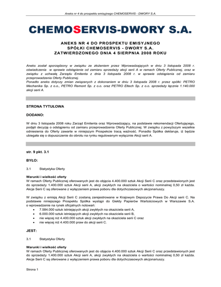 Aneks nr 4 do prospektu emisyjnego CHEMOSERVIS - DWORY S.A. ANEKS NR 4 DO PROSPEKTU EMISYJNEGO SPÓŁKI CHEMOSERVIS - DWORY S.A. ZATWIERDZONEGO DNIA 4 SIERPNIA 2008 ROKU Aneks został sporządzony w związku ze złożeniem przez Wprowadzających w dniu 3 listopada 2008 r. oświadczenia w sprawie odstąpienie od zamiaru sprzedaży akcji serii A w ramach Oferty Publicznej, oraz w związku z uchwałą Zarządu Emitenta z dnia 3 listopada 2008 r. w sprawie odstąpienia od zamiaru przeprowadzenia Oferty Publicznej. Ponadto aneks dotyczy zmian związanych z dokonaniem w dniu 3 listopada 2008 r. przez spółki: PETRO Mechanika Sp. z o.o., PETRO Remont Sp. z o.o. oraz PETRO Eltech Sp. z o.o. sprzedaży łącznie 1.140.000 akcji serii A. STRONA TYTUŁOWA DODANO: W dniu 3 listopada 2008 roku Zarząd Emitenta oraz Wprowadzający, na podstawie rekomendacji Ofertującego, podjęli decyzję o odstąpieniu od zamiaru przeprowadzenia Oferty Publicznej. W związku z powyższym wszelkie odniesienia do Oferty zawarte w niniejszym Prospekcie tracą ważność. Ponadto Spółka deklaruje, iż będzie ubiegała się o dopuszczenie do obrotu na rynku regulowanym wyłącznie Akcji serii A. str. 9 pkt. 3.1 BYŁO: 3.1 Statystyka Oferty Warunki i wielkość oferty W ramach Oferty Publicznej oferowanych jest do objęcia 4.400.000 sztuk Akcji Serii C oraz przedstawionych jest do sprzedaży 1.400.000 sztuk Akcji serii A, akcji zwykłych na okaziciela o wartości nominalnej 0,50 zł każda. Akcje Serii C są oferowane z wyłączeniem prawa poboru dla dotychczasowych akcjonariuszy. W związku z emisją Akcji Serii C zostaną zarejestrowane w Krajowym Depozycie Prawa Do Akcji serii C. Na podstawie niniejszego Prospektu Spółka wystąpi do Giełdy Papierów Wartościowych w Warszawie S.A. o wprowadzenie na rynek oficjalnych notowań: • 7.584.000 sztuk istniejących akcji zwykłych na okaziciela serii A, • 6.000.000 sztuk istniejących akcji zwykłych na okaziciela serii B, • nie więcej niż 4.400.000 sztuk akcji zwykłych na okaziciela serii C oraz • nie więcej niż 4.400.000 praw do akcji serii C. JEST: 3.1 Statystyka Oferty Warunki i wielkość oferty W ramach Oferty Publicznej oferowanych jest do objęcia 4.400.000 sztuk Akcji Serii C oraz przedstawionych jest do sprzedaży 1.400.000 sztuk Akcji serii A, akcji zwykłych na okaziciela o wartości nominalnej 0,50 zł każda. Akcje Serii C są oferowane z wyłączeniem prawa poboru dla dotychczasowych akcjonariuszy. Strona 1 Aneks nr 4 do prospektu emisyjnego CHEMOSERVIS - DWORY S.A. W związku z podjęciem decyzji przez Zarząd Emitenta oraz Wprowadzających o odstąpieniu od Oferty Publicznej, powyższe zapisy są nieaktualne. W związku z odstąpieniem od przeprowadzenia emisji Akcji Serii C, na podstawie niniejszego Prospektu Spółka wystąpi do Giełdy Papierów Wartościowych w Warszawie S.A. o wprowadzenie do obrotu na rynku regulowanym wyłącznie 7.584.000 sztuk istniejących akcji zwykłych na okaziciela serii A. str. 9 pkt. 3.2 BYŁO: Emitent oraz Sprzedający mogą postanowić o odstąpieniu od przeprowadzenia Publicznej Oferty w ww. terminach lub o ich zmianie. Informacja o odstąpieniu od przeprowadzenia Publicznej Oferty w powyższych terminach lub o zmianie któregokolwiek z nich zostanie podana do publicznej wiadomości w trybie aneksu do Prospektu przed upływem pierwotnie wskazanych terminów. JEST: Emitent oraz Sprzedający mogą postanowić o odstąpieniu od przeprowadzenia Publicznej Oferty w ww. terminach lub o ich zmianie. Informacja o odstąpieniu od przeprowadzenia Publicznej Oferty w powyższych terminach lub o zmianie któregokolwiek z nich zostanie podana do publicznej wiadomości w trybie aneksu do Prospektu przed upływem pierwotnie wskazanych terminów. Na podstawie decyzji Zarządu Emitenta oraz Wprowadzających z dnia 3 listopada 2008 r., Emitent odstąpił od przeprowadzenia Oferty Publicznej. str. 10 pkt. 4.4 BYŁO: Zamiarem Emitenta jest, aby inwestorzy uczestniczący w Publicznej Ofercie, mogli jak najwcześniej obracać objętymi papierami wartościowymi. W tym celu planowane jest wprowadzenie do notowań Praw do Akcji serii C („PDA”) niezwłocznie po spełnieniu odpowiednich przesłanek przewidzianych prawem. Wprowadzenie do notowań giełdowych Akcji serii A, B i C zostanie dokonane niezwłoczne po zarejestrowaniu podwyższenia kapitału zakładowego w drodze emisji Akcji serii C. Szczegółowe informacje dotyczące wprowadzenia Akcji Oferowanych do obrotu na Giełdzie Papierów Wartościowych w Warszawie S.A. zostały opisane w pkt 6. Dokumentu Ofertowego. JEST: Zamiarem Emitenta jest, aby inwestorzy uczestniczący w Publicznej Ofercie, mogli jak najwcześniej obracać objętymi papierami wartościowymi. W tym celu planowane jest wprowadzenie do notowań Praw do Akcji serii C („PDA”) niezwłocznie po spełnieniu odpowiednich przesłanek przewidzianych prawem. Wprowadzenie do notowań giełdowych Akcji serii A, B i C zostanie dokonane niezwłoczne po zarejestrowaniu podwyższenia kapitału zakładowego w drodze emisji Akcji serii C. Szczegółowe informacje dotyczące wprowadzenia Akcji Oferowanych do obrotu na Giełdzie Papierów Wartościowych w Warszawie S.A. zostały opisane w pkt 6. Dokumentu Ofertowego. W związku z decyzją Emitenta oraz Wprowadzających o odstąpieniu od Oferty Publicznej, zamiarem Zarządu Emitenta jest wprowadzenie do notowań wyłącznie akcji serii A. Strona 2 Aneks nr 4 do prospektu emisyjnego CHEMOSERVIS - DWORY S.A. str. 10 pkt. 4.5 BYŁO: Na dzień zatwierdzenia Prospektu akcjonariat Emitenta przedstawiał się następująco: Tabela 1 Struktura akcjonariatu Emitenta przed Ofertą Publiczną. Liczba głosów na WZ Udział w ogólnej liczbie głosów na WZ (%) Akcjonariusz Liczba akcji udział w kapitale zakładowym (%) Petro Eltech Sp. z o.o. 4.528.000 33,33% 4.528.000 33,33% Petro Mechanika Sp. z o.o. 4.528.000 33,33% 4.528.000 33,33% Petro Remont Sp. z o.o. 4.528.000 33,33% 4.5