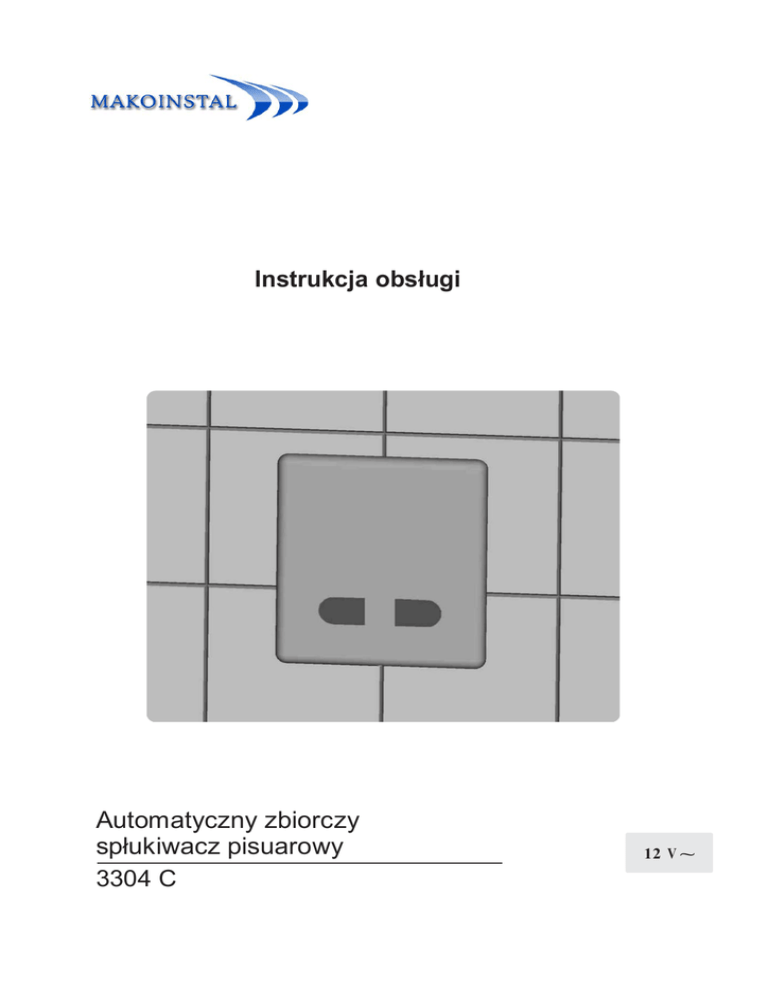 Instrukcja obsługi Automatyczny zbiorczy spłukiwacz pisuarowy 3304 C 12 V ~ 1. Specyfikacja techniczna 1 22 max 4 pisuary 3 5 Blok zaworu 6 1 - 10 bar max 5 m 4 230V/50Hz Elektronika 3304 C 12V/50Hz max 8VA G 1” 2. Opis czynności Czas spłukiwania 1 2 min 6 sek. 11 sek. 3 min 60 sek. 3. Wymiary montażowe 1 2 -1- 150 180 Maskownica zaworu 180 200 Elektronika 4. Przygotowanie montażu 4 cm min 18,5 cm 3 4 cm Otwór montażowy bloku zaworu 2 15 cm Otwór montażowy elektroniki 100 cm 1 5. Montaż Montaż elektroniki 1 3 2 1. 12V~ zawór zawór 12V~ Montaż bloku zaworu 2. 5 4 Montaż odblasku 100 cm ON 6. Czyszczenie filtra 1 2 1. OFF 2. -2- 6 7. Części składowe 5 1 2 3 4 1. Elektronika 2. Blok elektrozaworu 3. Maskownica 4. Odblask 5. Płyta nierdzewna -3- 7. Części składowe -4-