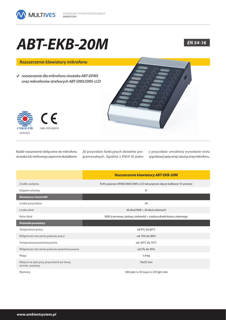 DŹWIĘKOWY SYSTEM OSTRZEGAWCZY MIKROFONY ABT-EKB-20M EN 54-16 Rozszerzenie klawiatury mikrofonu WW rozszerzenie dla mikrofonu strażaka ABT-DFMS oraz mikrofonów strefowych ABT-DMS/DMS-LCD 1488-CPR-0500/W 2374/2015 Każde rozszerzenie dołączone do mikrofonu strażaka lub strefowego zapewnia dodatkowe 20 przycisków funkcyjnych dowolnie programowalnych. Zgodnie z EN54-16 jeden z przycisków umożliwia wywołanie testu sygnalizacji optycznej i akustycznej mikrofonu. Rozszerzenie klawiatury ABT-EKB-20M Źródło zasilania RJ45 poprzez DFMS/DMS/DMS-LCD lub poprzez złącze kołkowe 10-pinowe Stopień ochrony 31 Klawiatura i kontrolki Liczba przycisków 20 Liczba diod 20 diod RGB + 20 diod zielonych Kolor diod RGB (czerwony, zielony, niebieski) + osobna dioda koloru zielonego Pozostałe parametry Temperatura pracy od 0°C do 60°C Wilgotność otoczenia podczas pracy od 15% do 80% Temperatura przechowywania od -20°C do 70°C Wilgotność otoczenia podczas przechowywania Waga Miejsce na opis przy przyciskach po lewej stronie, wymiary Wymiary www.ambientsystem.pl od 5% do 95% 1,4 kg 15x25 mm 120 (szer.) x 55 (wys.) x 210 (gł.) mm