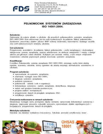 FDS Firma Doradczo Szkoleniowa ul. Senatorska 15 m 10, 58-316 Wałbrzych email: [email protected] tel.: 669 268 417 lub 607 391 274 NIP 886 150 6975; REGON 891498122 www.szkolenia-fds.pl PEŁNOMOCNIK SYSTEMÓW ZARZĄDZANIA ISO 14001:2004. Szkolenie: Zapraszamy do wzięcia udziału w szkoleniu dla przyszłych pełnomocników systemów zarządzania ISO 14001:2004. Kurs adresowany jest do osób wyznaczonych do pełnienia funkcji pełnomocnika, dyrektorów, pracownicy działów jakości/ BHP/ ochrony środowiska, kierownictwa średniego szczebla oraz osób zainteresowanych tematyką szkolenia. Cel szkolenia: Przygotowanie uczestników do pełnienia funkcji pełnomocnika - osoby zarządzającej i doskonalącej zintegrowane systemy zarządzania, poprzez umożliwienie im zdobycia umiejętności i wiedzy z danego zakresu jest głównym celem szkolenia. Kolejnym jest szerzenie wiedzy, a tym samym zwiększanie świadomości odnośnie poprawnych praktyk stosowania systemów zarządzania. Kwalifikacje: Certyfikat Pełnomocnika systemu zarządzania ISO 14001:2004. otrzymają osoby, które zdadzą egzamin, uczestnicy szkolenia, którzy egzaminu nie zdadzą otrzymają zaświadczenie uczestnictwa w szkoleniu. Program szkolenia: wprowadzenie do systemów zarządzania; omówienie wymagań norm ISO 14001; integracja systemów zarządzania; podejście systemowe; pełnomocnik –zadania i rola w organizacji; dokumentacja systemowa - nadzór, zarządzanie, identyfikacja, integracja; nadzór nad sprzętem kontrolno-pomiarowym; program auditów wewnętrznych; przygotowanie danych do przeglądu zarządzania ZSZ; certyfikacja systemów. Ćwiczenia realizowane w ramach szkolenia: Interpretacja wymagań norm, powiązania między normami, opracowanie dokumentacji systemowej i integracja, mapowanie procesów, wskaźniki procesów, wprowadzanie działań zapobiegawczych i korygujących, przygotowanie danych do przeglądu. Metodyka szkolenia: Szkolenie ma charakter wykładowo-ćwiczeniowy. Szkolenie prowadzi certyfikowany trener . FDS Firma Doradczo Szkoleniowa ul. Senatorska 15 m 10, 58-316 Wałbrzych email: [email protected] tel.: 669 268 417 lub 607 391 274 NIP 886 150 6975; REGON 891498122 www.szkolenia-fds.pl Czas trwania kursu: Planowany czas trwania kursu to 8 godzin. Termin realizacji zgodnie z planem szkoleń otwartych w FDS lub do ustalenia ze zleceniodawcą przy szkoleniach prowadzonych u zleceniodawcy. Wymagania dla zleceniodawcy: Pisemne zlecenie usługi (może być w formie mailowej) z wskazaniem czasu i miejsca szkolenia. Zapewnienie sali z możliwością wykorzystania jej jako szkoleniowej, zalecane by była wyposażona w rzutnik/ projektor i ekran, w przypadku braku sprzętu należy powiadomić o tym usługobiorcę. Zaleca się, aby zlecający posiadał w trakcie szkolenia chociaż jeden egzemplarz każdej normy (przypominamy: normy nie mogą być powielane/ kopiowane bez zgody PKN). Wymagania dla uczestników kursu: Należy pamiętać żeby odpowiednio wybrać kandydatów na Pełnomocników systemów zarządzania. Osoby te zgodnie z wytycznymi normy będą przedstawicielami kierownictwa, która musi posiadać określone zadania, zakres odpowiedzialności i uprawnień. Koszty: Szkolenie prowadzone w jednostce zleceniodawcy - koszt to 1800 zł. netto za szkolenie dla max. 6 uczestników. Szkolenie prowadzone w jednostce FDS – koszt to 2400 zł. netto za szkolenie dla max. 6 uczestników (w cenę wliczone jest obiad dla uczestników). Udział w szkoleniu otwartym w jednostce FDS – koszt to 450 zł. netto od osoby, max. 8 uczestników (w cenę wliczone jest obiad dla uczestników). Zapraszamy do współpracy - Zespół FDS