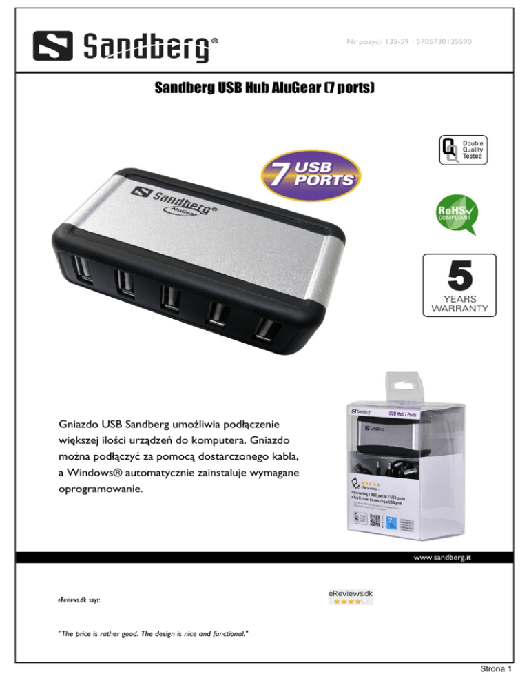 Nr pozycji 135-59 · 5705730135590 Sandberg USB Hub AluGear (7 ports) Gniazdo USB Sandberg umożliwia podłączenie większej ilości urządzeń do komputera. Gniazdo można podłączyć za pomocą dostarczonego kabla, a Windows® automatycznie zainstaluje wymagane oprogramowanie. www.sandberg.it eReviews.dk says: "The price is rather good. The design is nice and functional." Strona 1 Nr pozycji 135-59 · 5705730135590 Dane techniczne Opis: Sandberg USB Hub AluGear (7 ports) //Computer accessories/Hubs and splitters EAN 5705730135590 Interface standard: USB 2.0 USB 2.0, USB 1.1 and USB 1.0 compliant Supports high-speed (480 Mbit/s), full-speed (12 Mbit/s), and low-speed (1.5 Mbit/s) transfer rates USB connectors: 7 USB A-female and 1 B-female Supplying USB ports with up to 500mA (with power adapter) Chains up to 127 USB devices. Informacje o opakowaniu 1 Sandberg USB Hub 1 USB connection cable 1 meter Wymiary Opakowanie wysokość: 19,0 cm Opakowanie szerokość: 10,0 cm Opakowanie głębokość: 6,5 cm Opakowanie masa: 195 g Produkt wysokość: 2,5 cm Produkt szerokość: 8,5 cm Produkt głębokość: 4,8 cm Produkt masa: 65 g Łącza Produkt strona: http://www.sandberg.it/product/usb-hub-alugear-7-ports Helpdesk strona: http://www.sandberg.it/support/usb-hub-alugear-7-ports Pobierz duże zdjęcie: http://files.sandberg.it/products/images/lg/135-59_lg.jpg Pobierz PDF: http://files.sandberg.it/products/pdf/135-59pl.pdf www.sandberg.it Dealer Strona 2