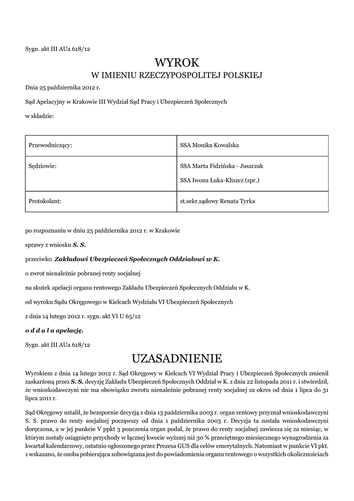 Sygn. akt III AUa 618/12 WYROK W IMIENIU RZECZYPOSPOLITEJ POLSKIEJ Dnia 25 października 2012 r. Sąd Apelacyjny w Krakowie III Wydział Sąd Pracy i Ubezpieczeń Społecznych w składzie: Przewodniczący: SSA Monika Kowalska Sędziowie: SSA Marta Fidzińska - Juszczak SSA Iwona Łuka-Kliszcz (spr.) Protokolant: st.sekr.sądowy Renata Tyrka po rozpoznaniu w dniu 25 października 2012 r. w Krakowie sprawy z wniosku S. S. przeciwko Zakładowi Ubezpieczeń Społecznych Oddziałowi w K. o zwrot nienależnie pobranej renty socjalnej na skutek apelacji organu rentowego Zakładu Ubezpieczeń Społecznych Oddziału w K. od wyroku Sądu Okręgowego w Kielcach Wydziału VI Ubezpieczeń Społecznych z dnia 14 lutego 2012 r. sygn. akt VI U 65/12 o d d a l a apelację. Sygn. akt III AUa 618/12 UZASADNIENIE Wyrokiem z dnia 14 lutego 2012 r. Sąd Okręgowy w Kielcach VI Wydział Pracy i Ubezpieczeń Społecznych zmienił zaskarżoną przez S. S. decyzję Zakładu Ubezpieczeń Społecznych Oddział w K. z dnia 22 listopada 2011 r. i stwierdził, że wnioskodawczyni nie ma obowiązku zwrotu nienależnie pobranej renty socjalnej za okres od dnia 1 lipca do 31 lipca 2011 r. Sąd Okręgowy ustalił, że bezspornie decyzją z dnia 13 października 2003 r. organ rentowy przyznał wnioskodawczyni S. S. prawo do renty socjalnej począwszy od dnia 1 października 2003 r. Decyzja ta została wnioskodawczyni doręczona, a w jej punkcie V ppkt 3 pouczenia organ podał, że prawo do renty socjalnej zawiesza się za miesiąc, w którym zostały osiągnięte przychody w łącznej kwocie wyższej niż 30 % przeciętnego miesięcznego wynagrodzenia za kwartał kalendarzowy, ostatnio ogłoszonego przez Prezesa GUS dla celów emerytalnych. Natomiast w punkcie VI pkt. 1 wskazano, że osoba pobierająca zobowiązana jest do powiadomienia organu rentowego o wszystkich okolicznościach mających wpływ na prawo do renty socjalnej i jej wysokość, w tym m.in. o osiągnięciu miesięcznego przychodu wskazanego w części V pouczenia i jego wysokości oraz o okresie na jaki została zawarta umowa z tytułu której osiągany jest przychód. Takie same pouczenia zawierają także decyzje otrzymywane przez ubezpieczoną w latach 2004 – 2011. Jednocześnie od dnia 4 stycznia 2011 r. wnioskodawczyni jest zatrudniona w Fundacji (...) w D. jako pracownik ochrony środowiska i zajmuje się zbiórką surowców wtórnych. Fundacja w okresie od dnia 1 stycznia 2011 r. do dnia 31 grudnia 2011 r. realizowała projekt Urzędu miasta w K. pod nazwą „zorganizowanie i przeprowadzenie akcji selektywnej zbiórki odpadów w ramach aktywizacji osób niepełnosprawnych na okres 9 miesięcy”. Środki finansowe przeznaczone na ten projekt były rozliczane w dwóch transzach do dnia 31 lipca 2011 r. – pierwsza transza obejmująca okres od kwietnia do lipca oraz do dnia 31 grudnia 2011 r. – druga transza obejmująca okres od sierpnia do grudnia 2011 r. Zasadniczo ubezpieczona otrzymywała około (...) zł za przepracowany miesiąc, wypłacane do 10 dnia miesiąca następującego miesiąca którego dotyczy, jednakże pensja za miesiąc lipiec została jej przekazana w dniu 22 lipca 2011 r. Powyższe spowodowała, ze w miesiącu lipcu wypłacono S. S. wynagrodzenie za czerwiec - w dniu 5 lipca 2011 r. oraz wynagrodzenie za lipiec – w dniu 22 lipca 2011 r. w kwotach wynoszących odpowiednio(...)zł i (...)zł. Wynagrodzenie za miesiąc sierpień wnioskodawczyni otrzymała w dniu 8 września 2011 r. Tym samym w miesiącu sierpniu 2011 r. na rzecz ubezpieczonej nie wpłynęła żadna kwota z tytułu wynagrodzenia za pracę. Wobec powyższego organ rentowy stwierdził, że wypłacona na rzecz wnioskodawczyni renta socjalna w miesiącu lipcu w wysokości po (...)zł jest świadczeniem nienależnym, ponieważ nastąpiło przekroczenie dopuszczalnej kwoty przychodu. W tym stanie faktycznym Sąd Okręgowy powołując się na treść art. 10 ust. 1 oraz art. 15 ust. 1 pkt. 1 ustawy z dnia 27 czerwca 2003 r. o rencie socjalnej ( Dz.U. nr. 135, poz. 1268 z 2003 r., ze zm.), uznał że wnioskodawczyni nie ma obowiązku zwrotu nienależnie pobranego świadczenia w rozumieniu art. 138 ust. 1 ustawy o emeryturach i rentach z Funduszu Ubezpieczeń Społecznych ( tj. Dz.U. nr. 153, poz. 1227 z 2009 r. ze zm. ). W ocenie Sądu nie może przemawiać na niekorzyść wnioskodawczyni fakt, iż pracodawca wypłacił jej w tym samym miesiącu, tj. w lipcu 2011 r. wynagrodzenie należne za miesiące czerwiec i lipiec 2011 r., tak więc odwołanie zasługuje na uwzględnienie. W apelacji od powyższego wyroku Sądu Okręgowego Zakład Ubezpieczeń Społecznych Oddział w K., zaskarżając go w całości, zarzucił mu naruszenie przepisów prawa materialnego, a w szczególności art. 10 ustawy z dnia 27 czerwca 2003 r. o rencie socjalnej ( Dz.U. nr. 135, poz. 1268 ze zm.) oraz art.138 ustawy z dnia 17 grudnia 1998 r. o emeryturach i rentach z Funduszu Ubezpieczeń Społecznych. Wskazując na powyższe podstawy wniósł o zmianę zaskarżonego wyroku i oddalenie odwołania. Apelujący w uzasadnieniu podniósł, iż w miesiącu lipcu 2011 r. S. S. osiągnęła przychód w łącznej kwocie (...)zł, tj w kwocie wyższej niż 30 % przeciętnego miesięcznego wynagrodzenia za I kwartał kalendarzowy 2011 r. ogłoszonego do celów emerytalnych, co uzasadnia zobowiązanie jej do zwrotu nienależnie pobranej renty socjalnej za ten miesiąc w kwocie (...)zł. Bez znaczenia jest zatem fakt, iż wnioskodawczyni otrzymała w dniu 22 lipca 2011 r. wynagrodzenie za miesiące czerwiec i lipiec, albowiem w miesiącu tym otrzymała przychód w łącznej kwocie powodującej zawieszenie prawa do renty, tak więc uznać należy, iż pozostawiony jej został do dyspozycji w miesiącu lipcu, kiedy doszło do jego wypłaty. Sąd Apelacyjny w Krakowie zważył co następuje : Apelacja jest nieuzasadniona. Przy bezspornym stanie faktycznym, istotną dla rozstrzygnięcia kwestią było rozstrzy